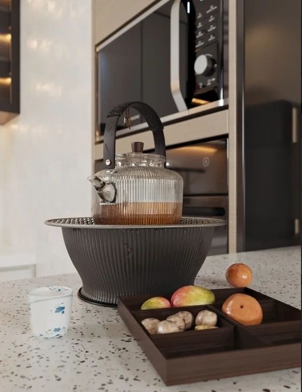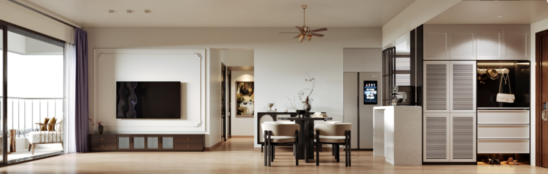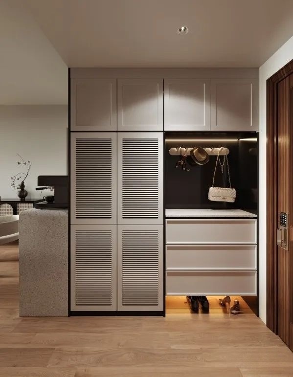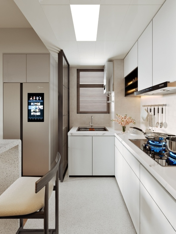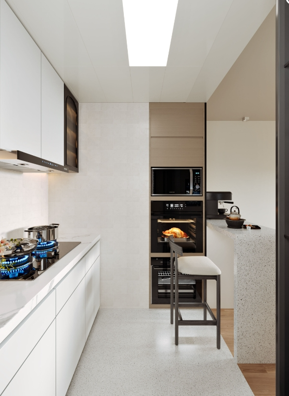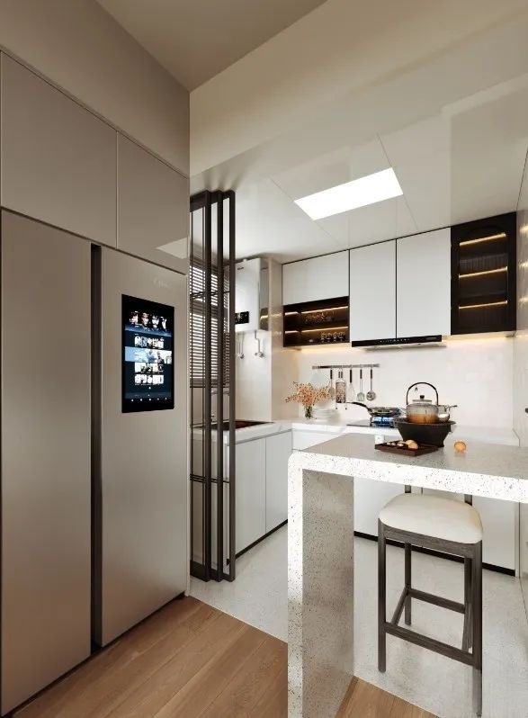 廚房和客廳的交界處,設計了小型的餐導臺,不僅廚房的操作空間變大了,互動場景也多了,一人在做飯,另外一人就可以在餐導臺前喝茶陪伴。