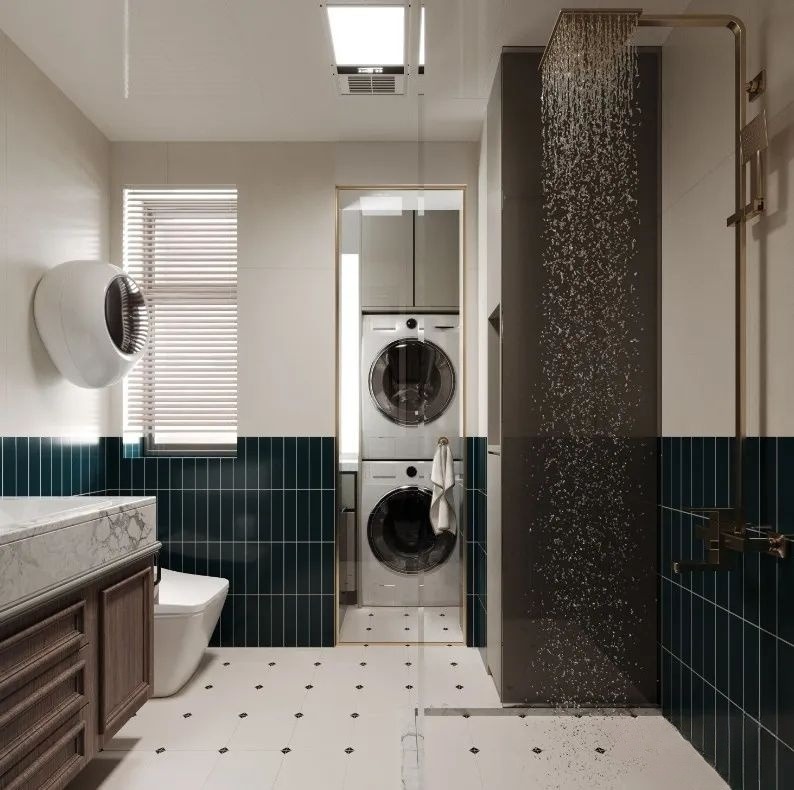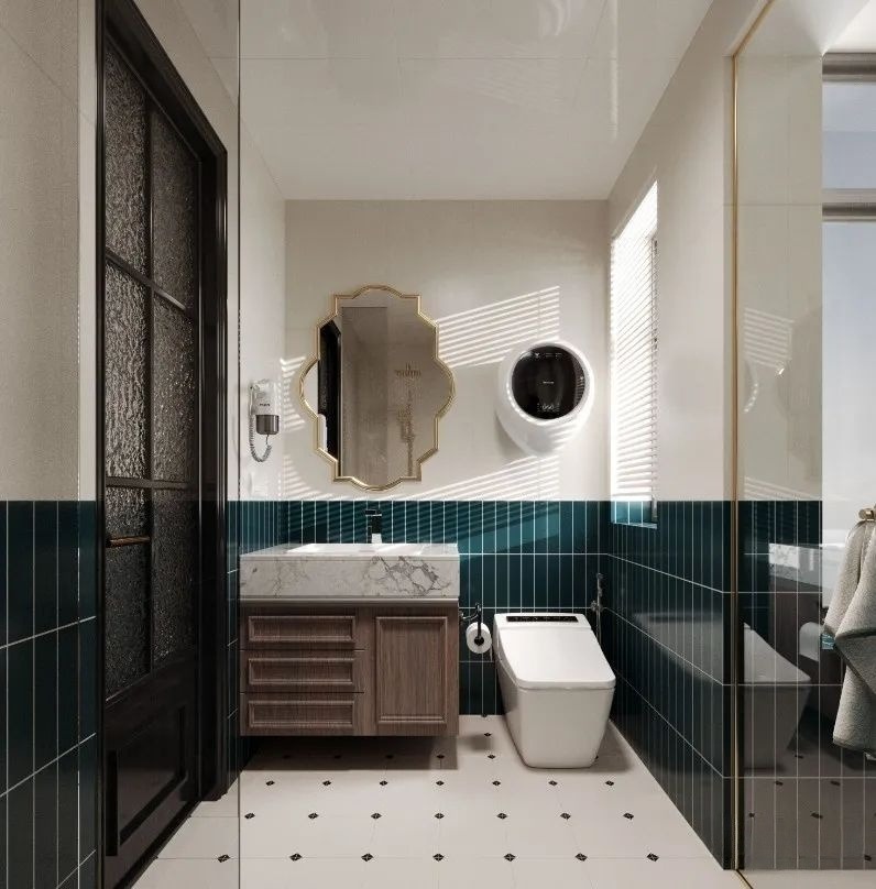 干濕分離的浴室設計、半墻藍寶色小瓷磚、金色的五金配件、還有各種小家電,摩登與復古交融!
