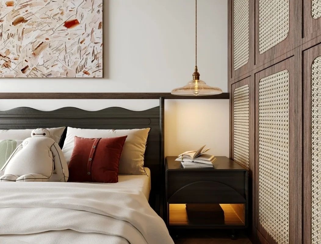 濃濃氛圍感的棕色大床搭配上藤編門的木衣柜,床頭柜上的長吊燈、燈光落在未讀完的書頁上,呈現(xiàn)出復古電影的質(zhì)感。
