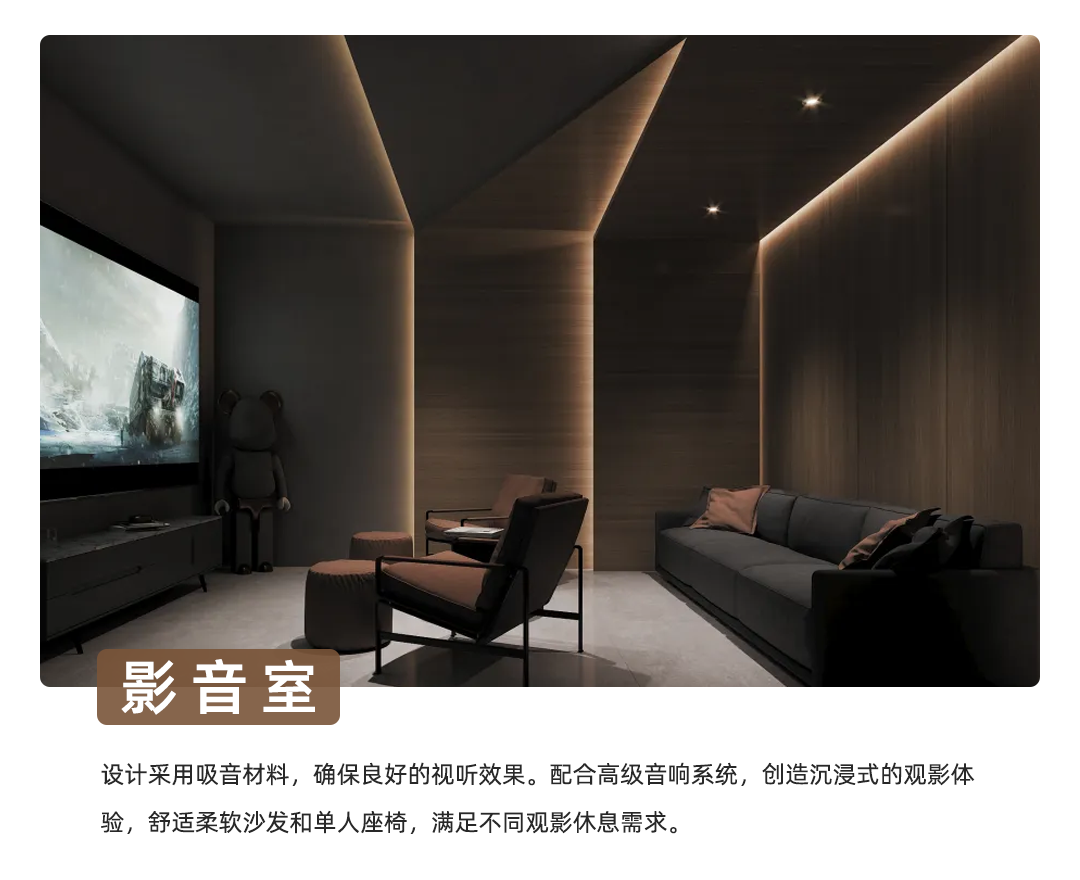 會客廳:深色調(diào)+暖光營造沉穩(wěn)氛圍,是日常待客和朋友聚會的首選場所。
