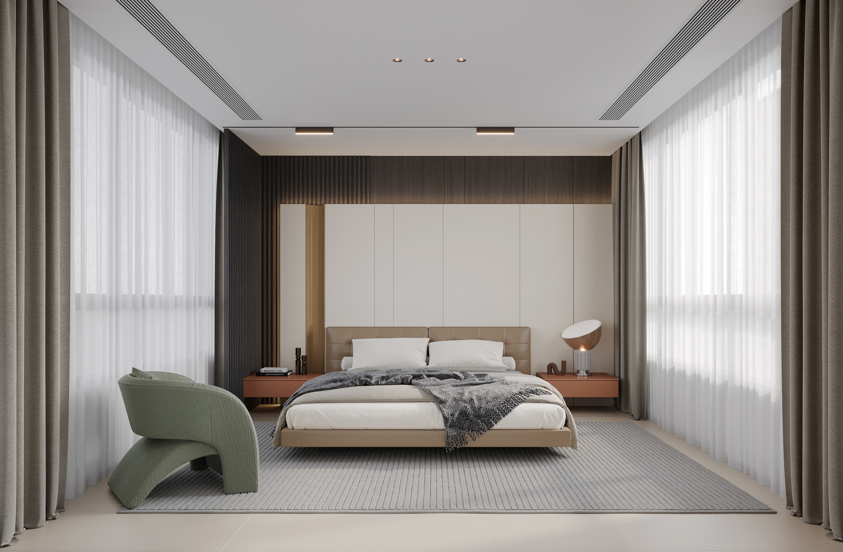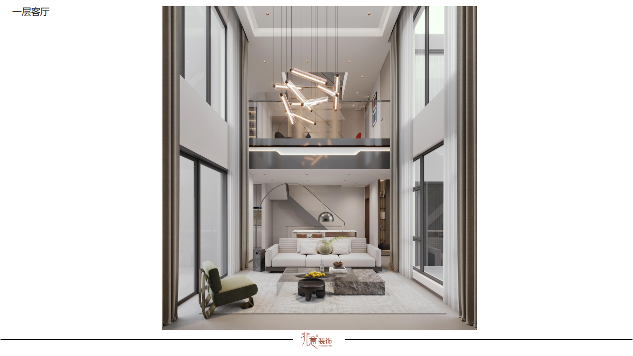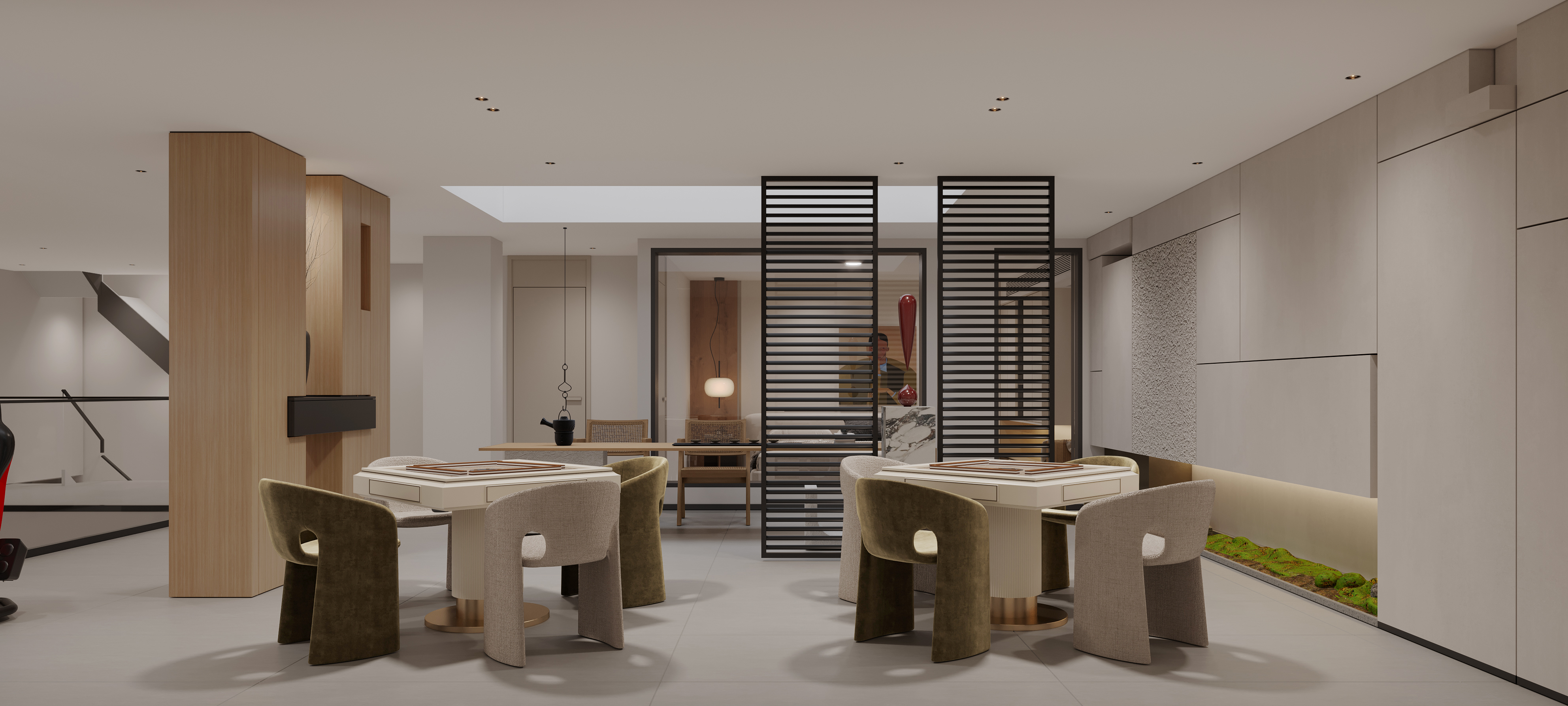 會客廳:空間挑高,四面玻璃環(huán)繞設(shè)計讓光線自然流動、景致彼此呼應(yīng)。視覺焦點在于懸掛于空中的長條燈主燈組,以多根線性光源打造出極具張力的現(xiàn)代美學(xué)。搭配定制白色布藝沙發(fā)與大理石質(zhì)感茶幾,空間整體極具現(xiàn)代張力。