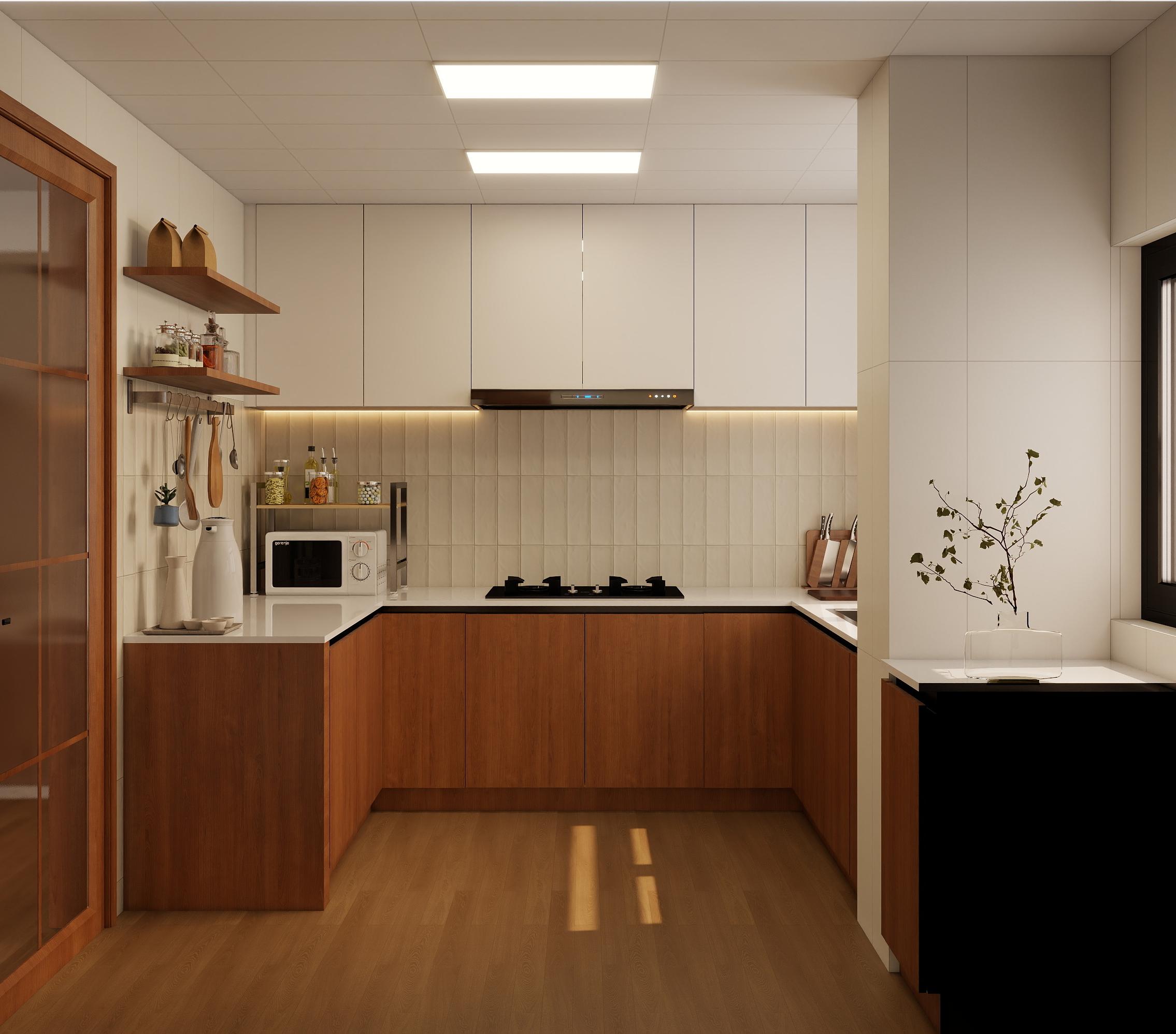 定制柜選用胡桃木材質(zhì),大理石臺面與整體色調(diào)呼應(yīng);主燈設(shè)計,增強空間的輕盈感與透光性。
