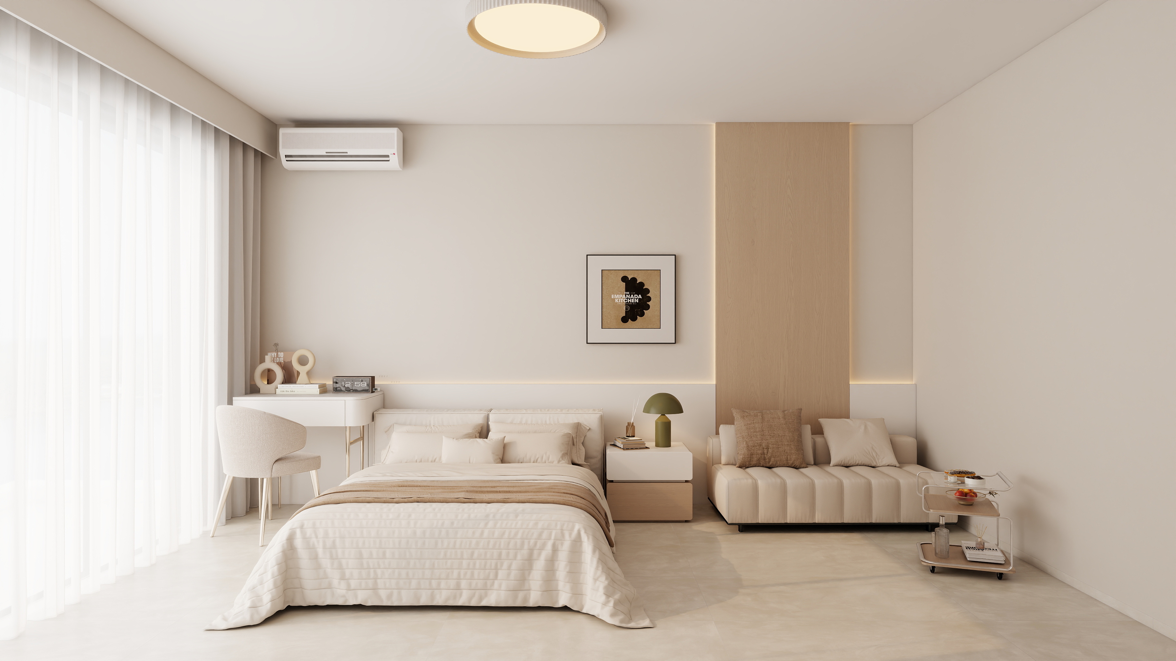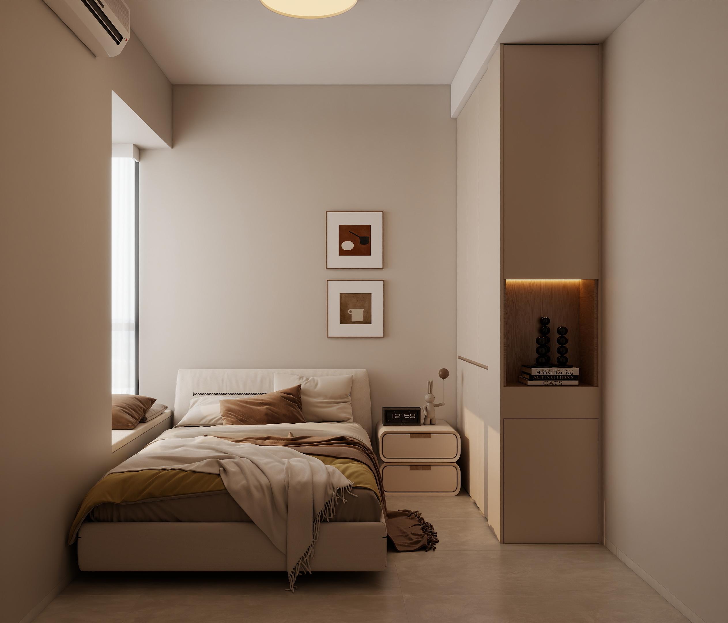 主臥:現(xiàn)代奶油風(fēng)的主臥,沒有華麗的裝飾,卻用細膩的材質(zhì)、柔和的色彩和貼心的設(shè)計,將舒適與格調(diào)完美融合。落地窗的存在,讓主臥的采光得到極大提升,使奶油白的墻面、淺木色的地板在自然光的照耀下,更顯溫潤柔和。陽光與室內(nèi)的暖光相互交融,營造出溫馨而治愈的氛圍,讓這個主臥不僅是休憩的港灣,更是能讓人放松身心、感受美好的小天地。