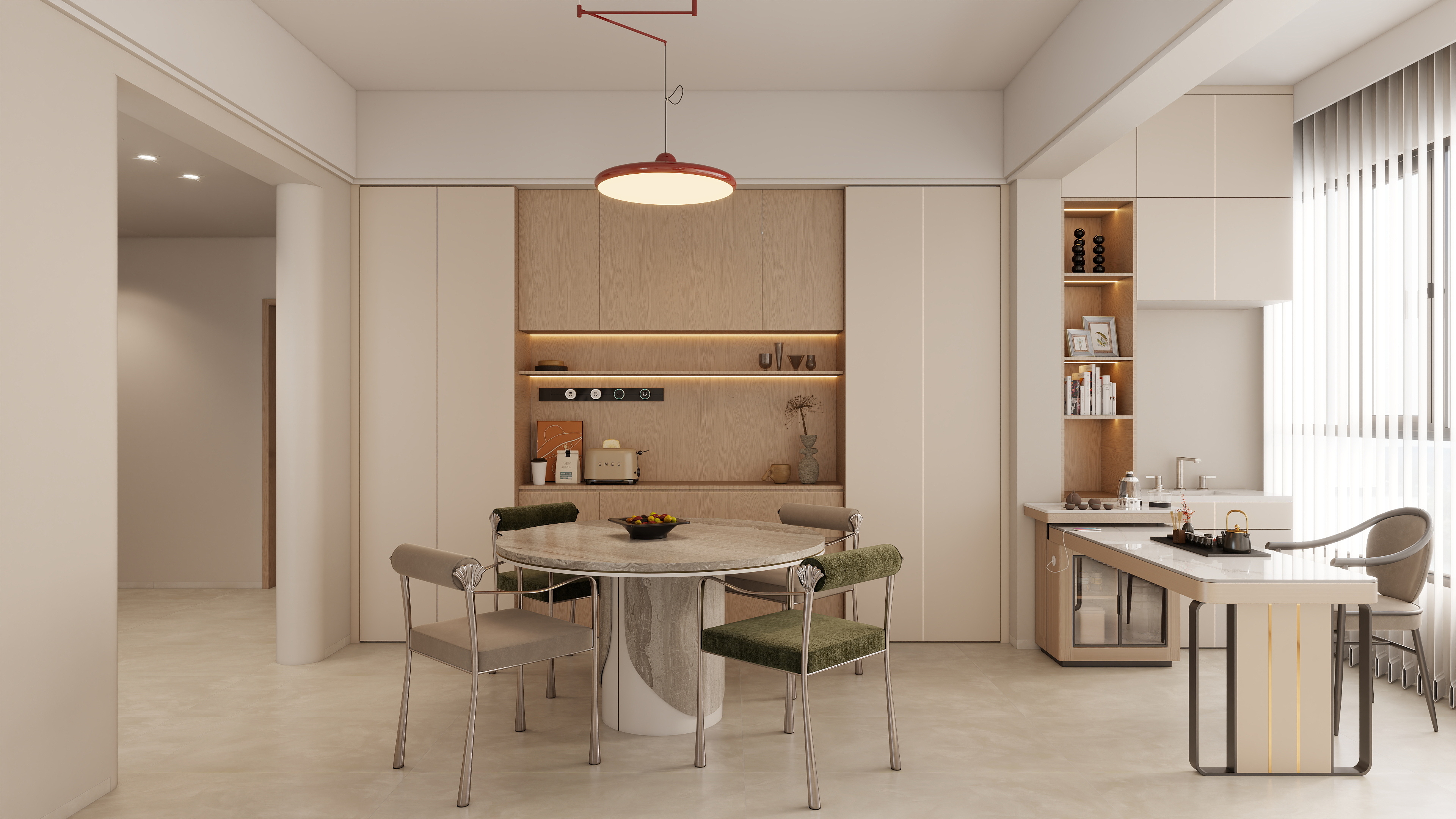 餐廳:講究簡潔、實用、舒適,通過流暢的動線、溫潤的色調(diào)、精致的燈光營造高級感和溫馨的就餐氛圍。茶吧的設(shè)計,不僅提升生活品質(zhì),還增加了空間的功能性和互動性。在材質(zhì)的運用上,大量采用了石材、木材等天然材料,保留了它們原始的紋理和質(zhì)感。此外,家具和裝飾表面細膩質(zhì)感的材質(zhì),強調(diào)了觸感的柔和與視覺的溫潤。