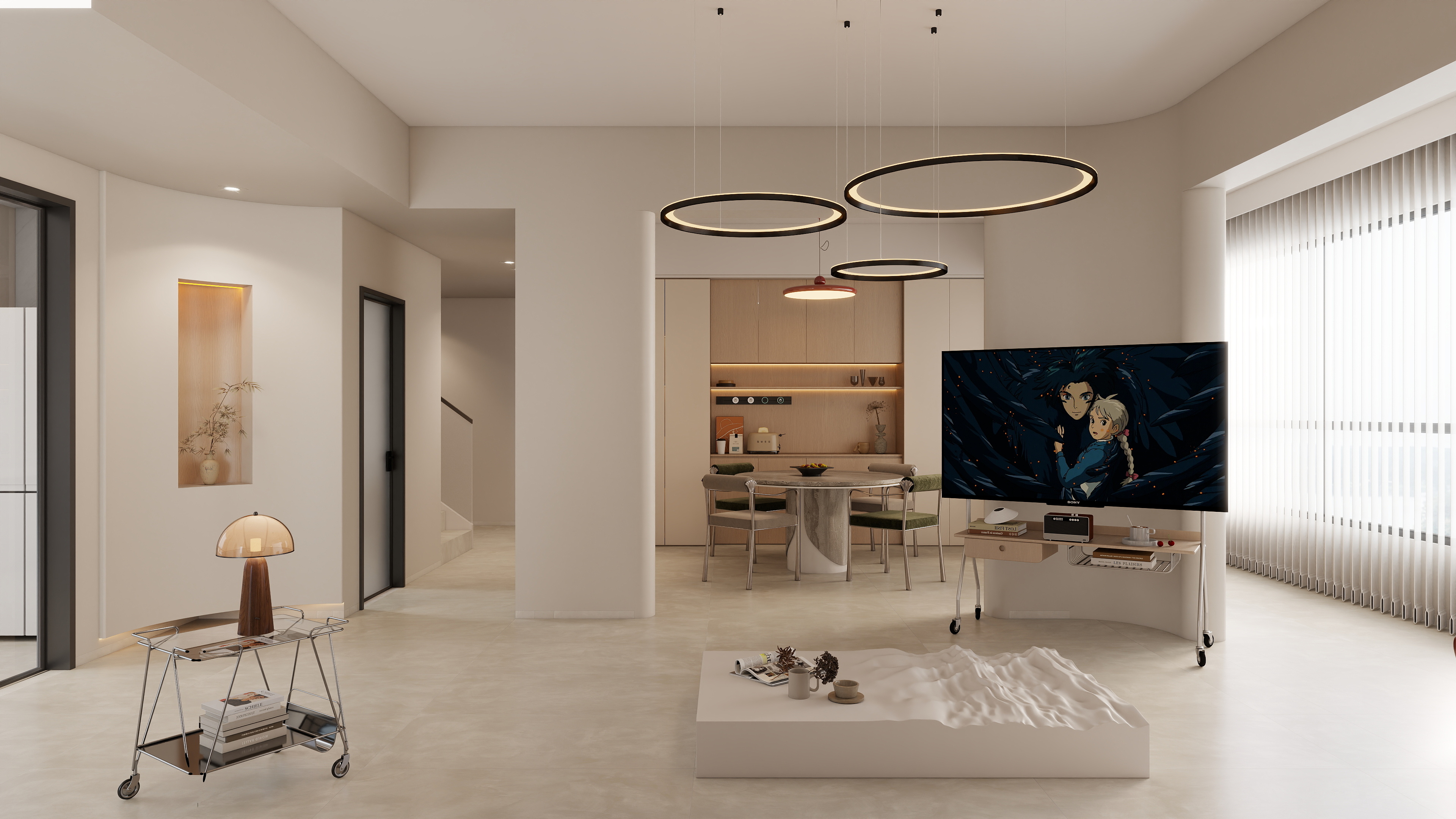 整個空間以淡淡的奶油色為基底,接近米白色又帶著一絲駝色的溫暖,墻面、天花板以及大部分的軟裝都選用了這種奶油色,奠定了空間柔和的氛圍。