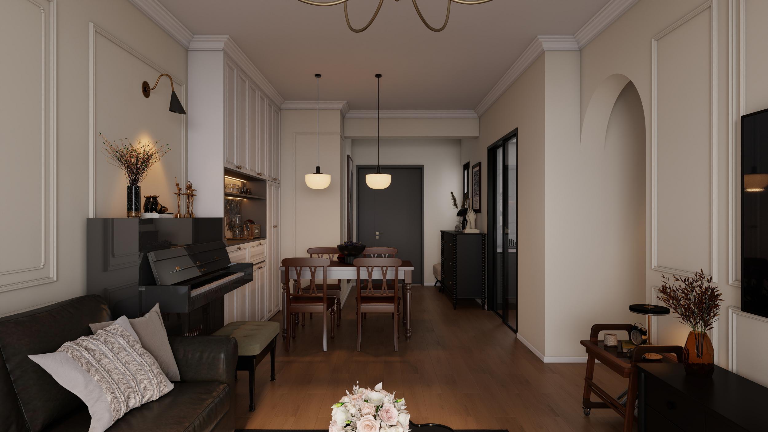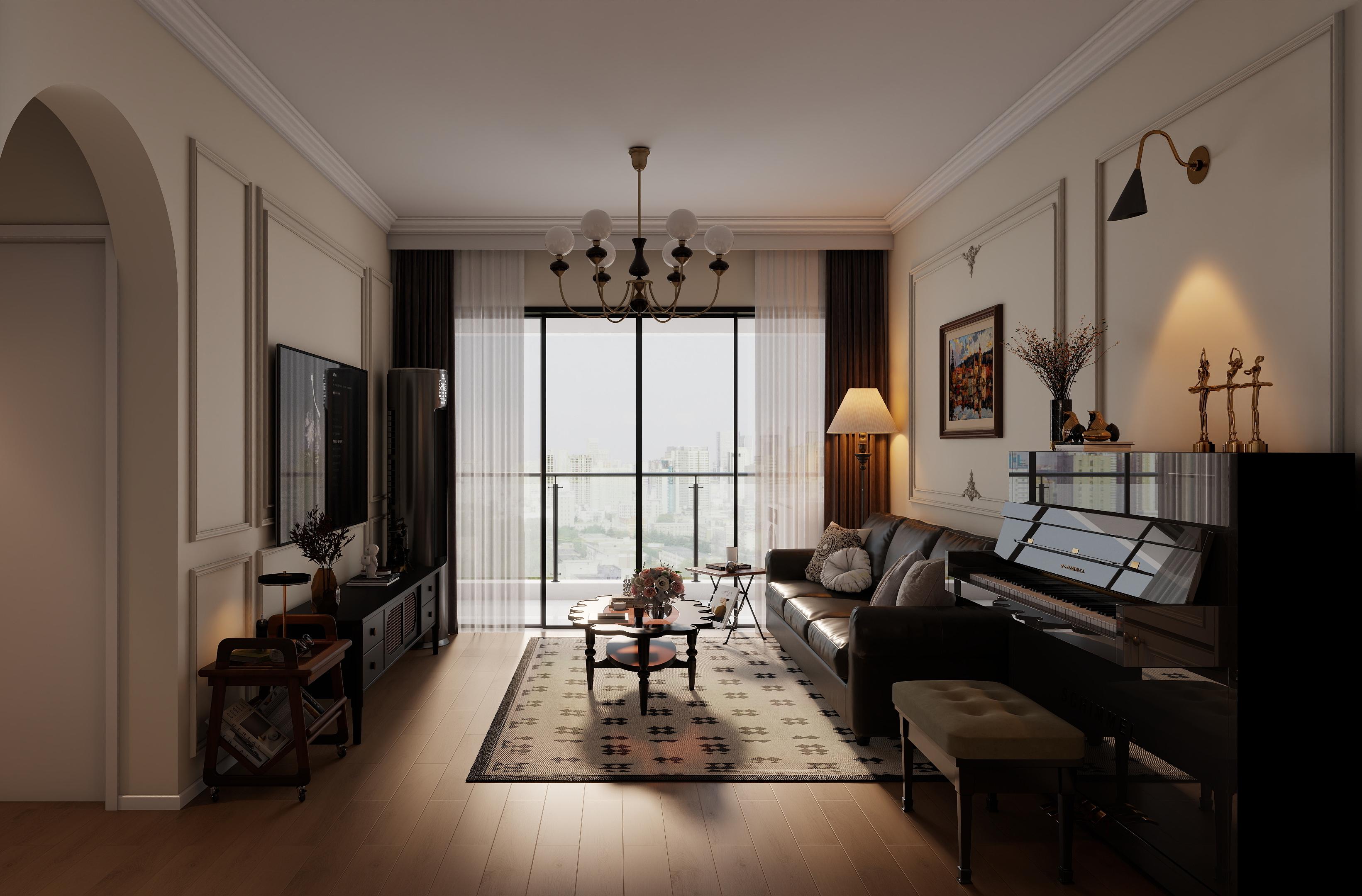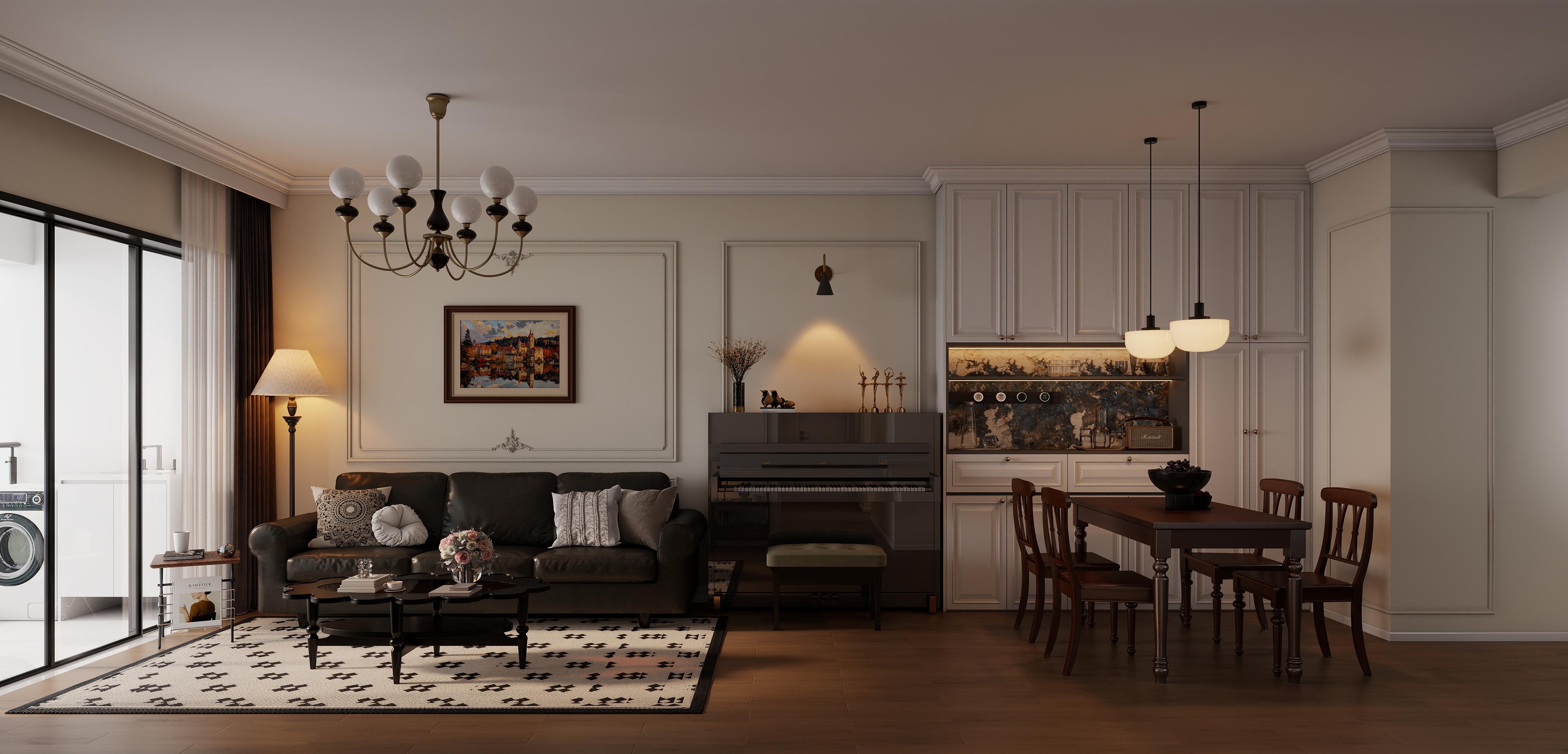 客廳展現(xiàn)出經(jīng)典的美式風格,整體氛圍優(yōu)雅且溫馨。墻面采用淺色調,并飾以簡潔的線條框,增添了空間的層次感和精致感。黑色的皮質沙發(fā)沉穩(wěn)大氣,搭配上帶有幾何圖案的地毯,為空間注入了活力與時尚感。沙發(fā)背后的墻面上掛有一幅色彩豐富的畫作,成為視覺焦點之一。