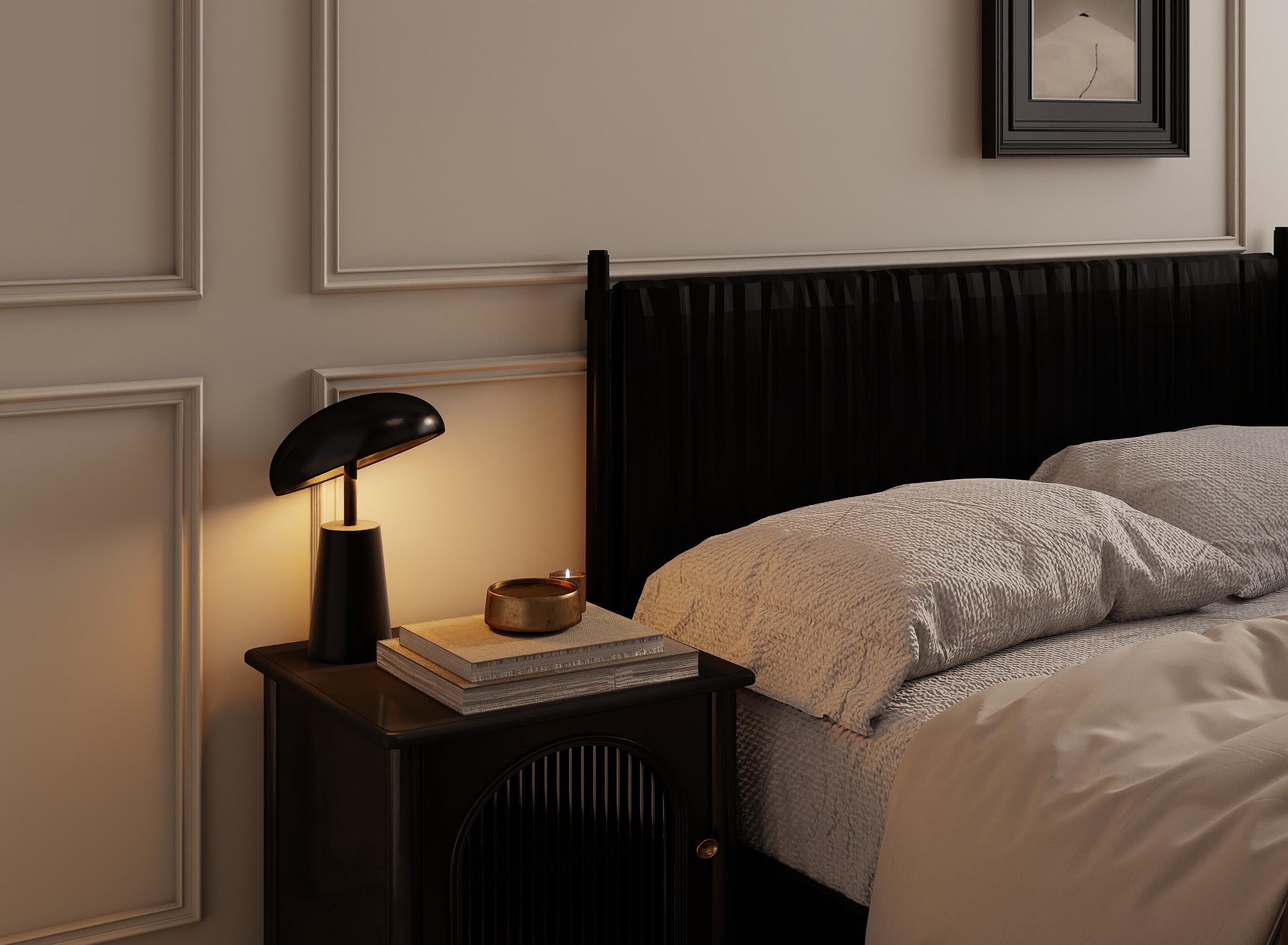 次臥:設計風格與主臥相似,深色木質床具搭配淺色床品,簡潔而溫馨。墻上的裝飾畫和床頭的臺燈為房間增添了個性與實用功能。房間內還設有白色的衣柜,提供了充足的儲物空間,滿足日常衣物的收納需求。