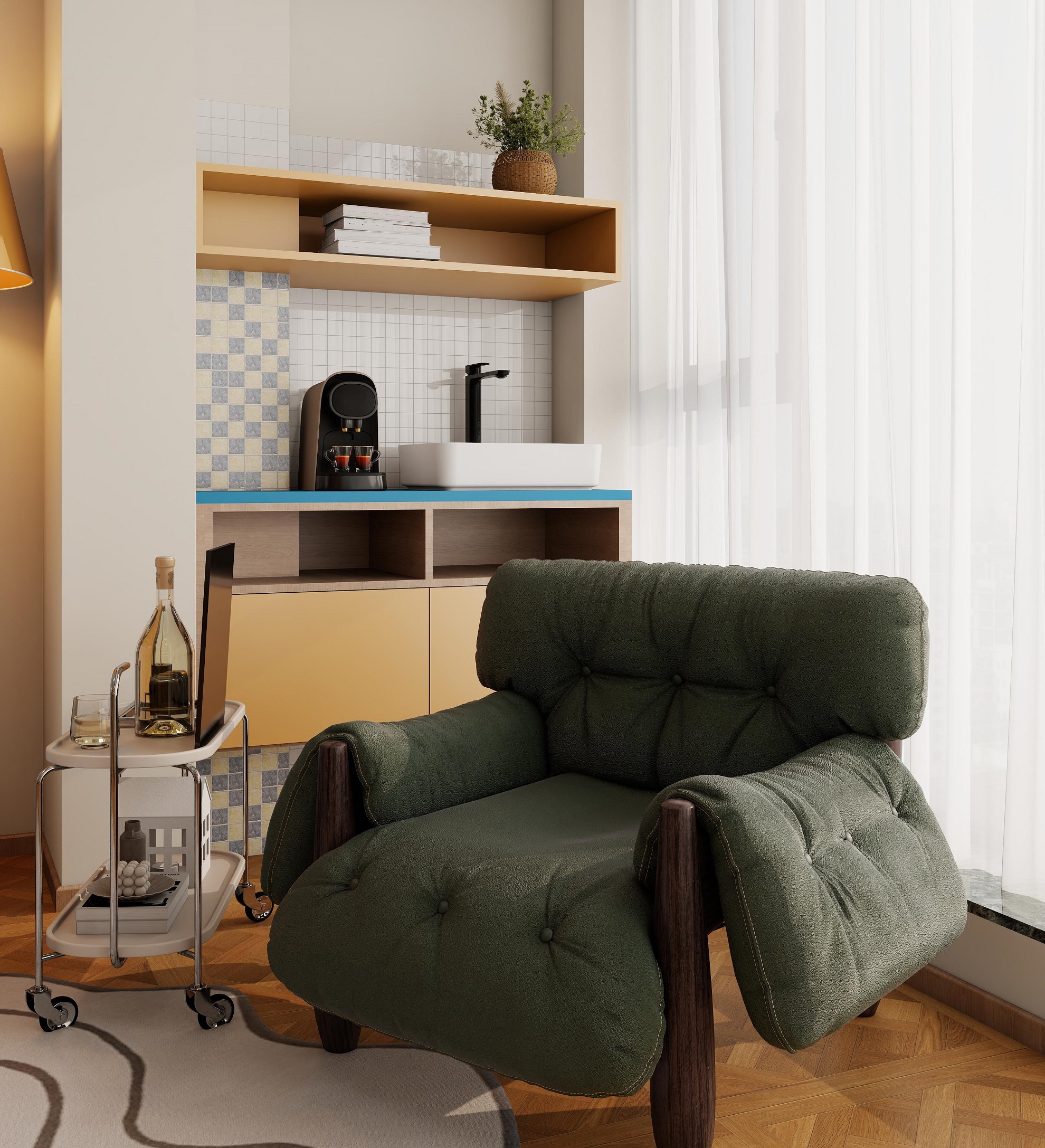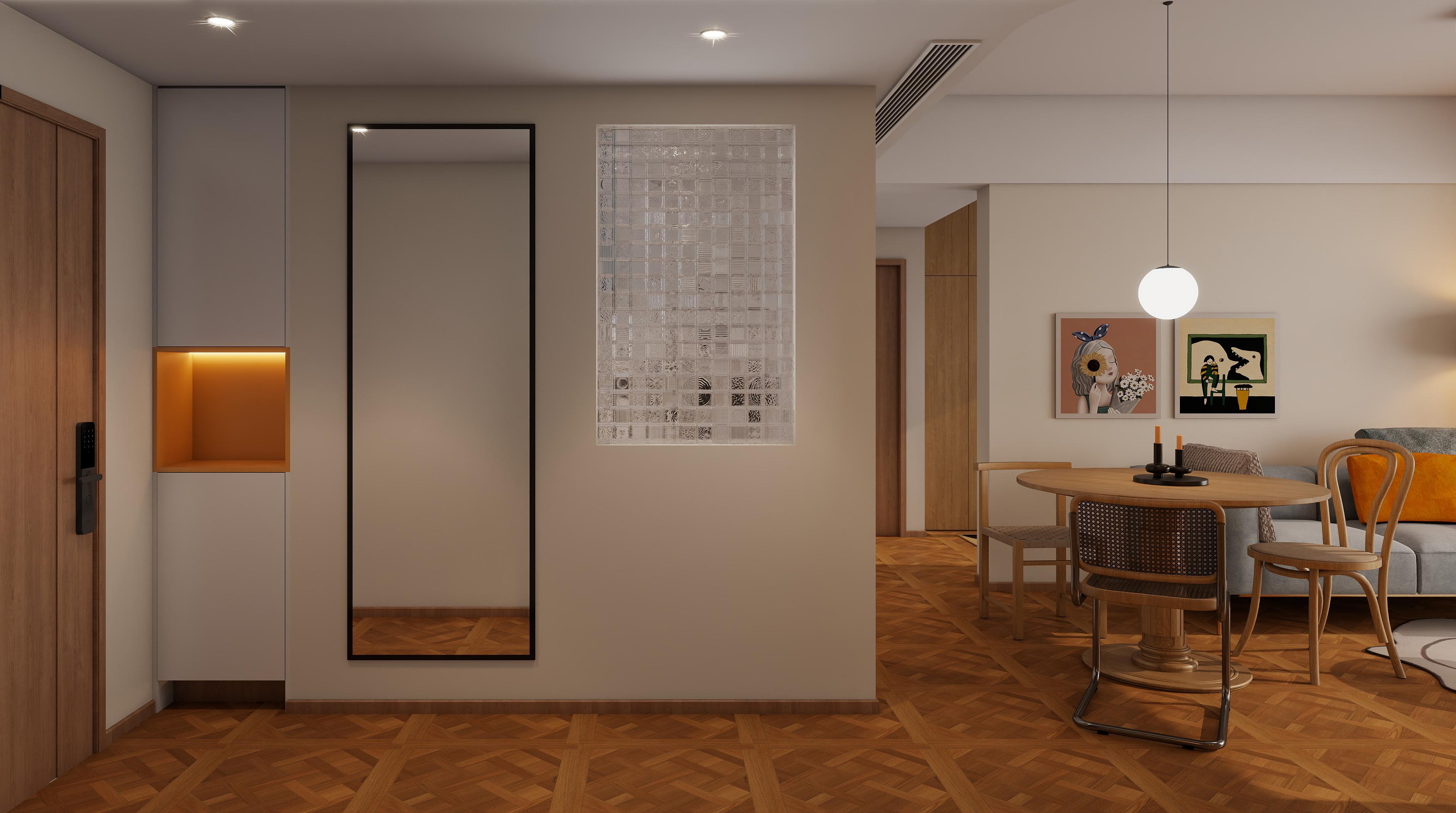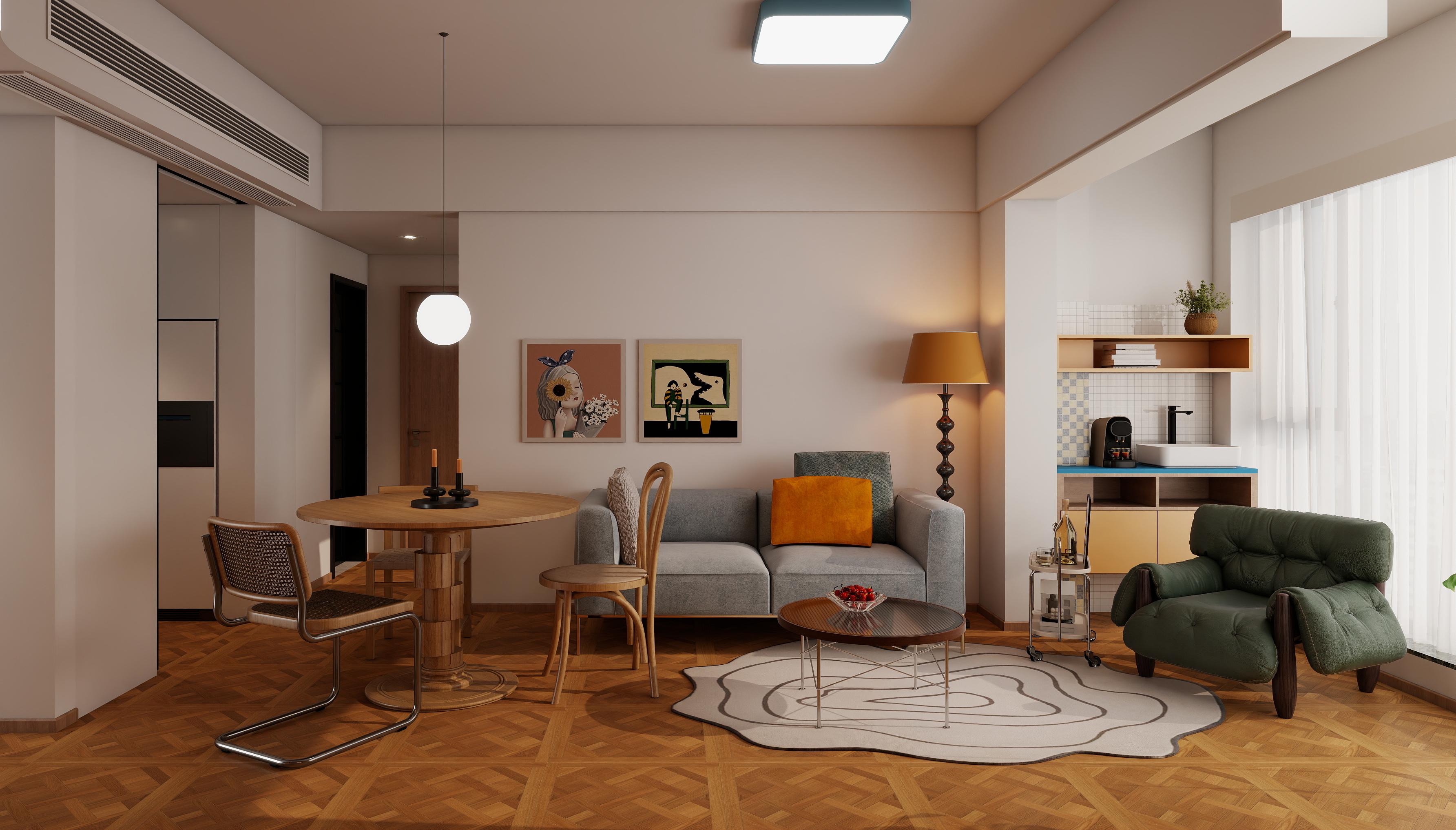 客廳整體呈現(xiàn)出簡(jiǎn)約而溫馨的風(fēng)格。地板采用人字形拼接的木質(zhì)地板,增添了空間的層次感和溫暖感。墻面以淺米色為主,顯得明亮而干凈??蛷d中央擺放著一張灰色的布藝沙發(fā),搭配一個(gè)橙色的靠墊,為空間增添了一抹亮色。沙發(fā)前方是一張圓形的木質(zhì)茶幾,茶幾上擺放著一些裝飾物品。沙發(fā)旁邊有一盞造型獨(dú)特的落地?zé)簦峁┝巳岷偷恼彰鳌?/p>