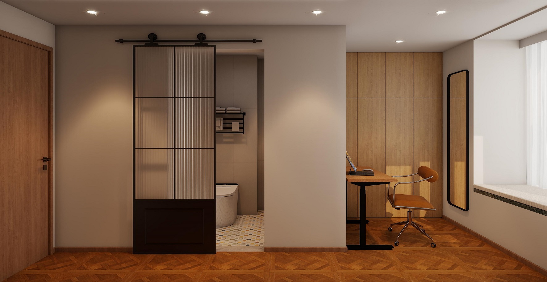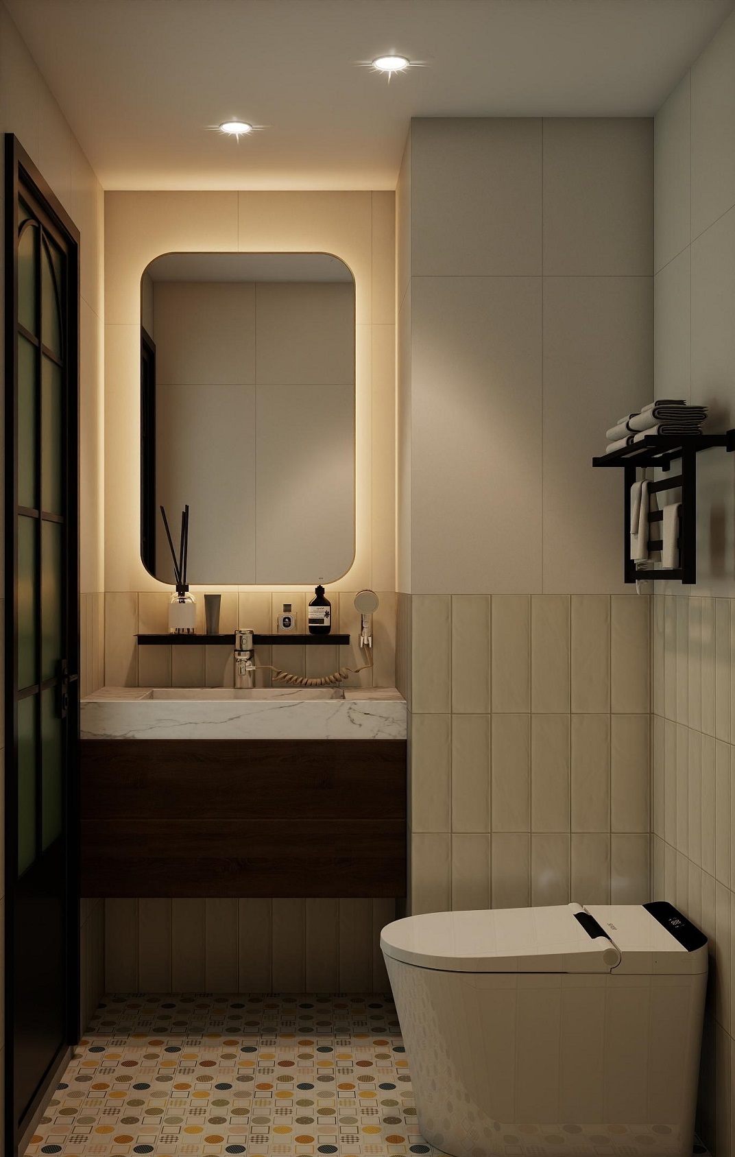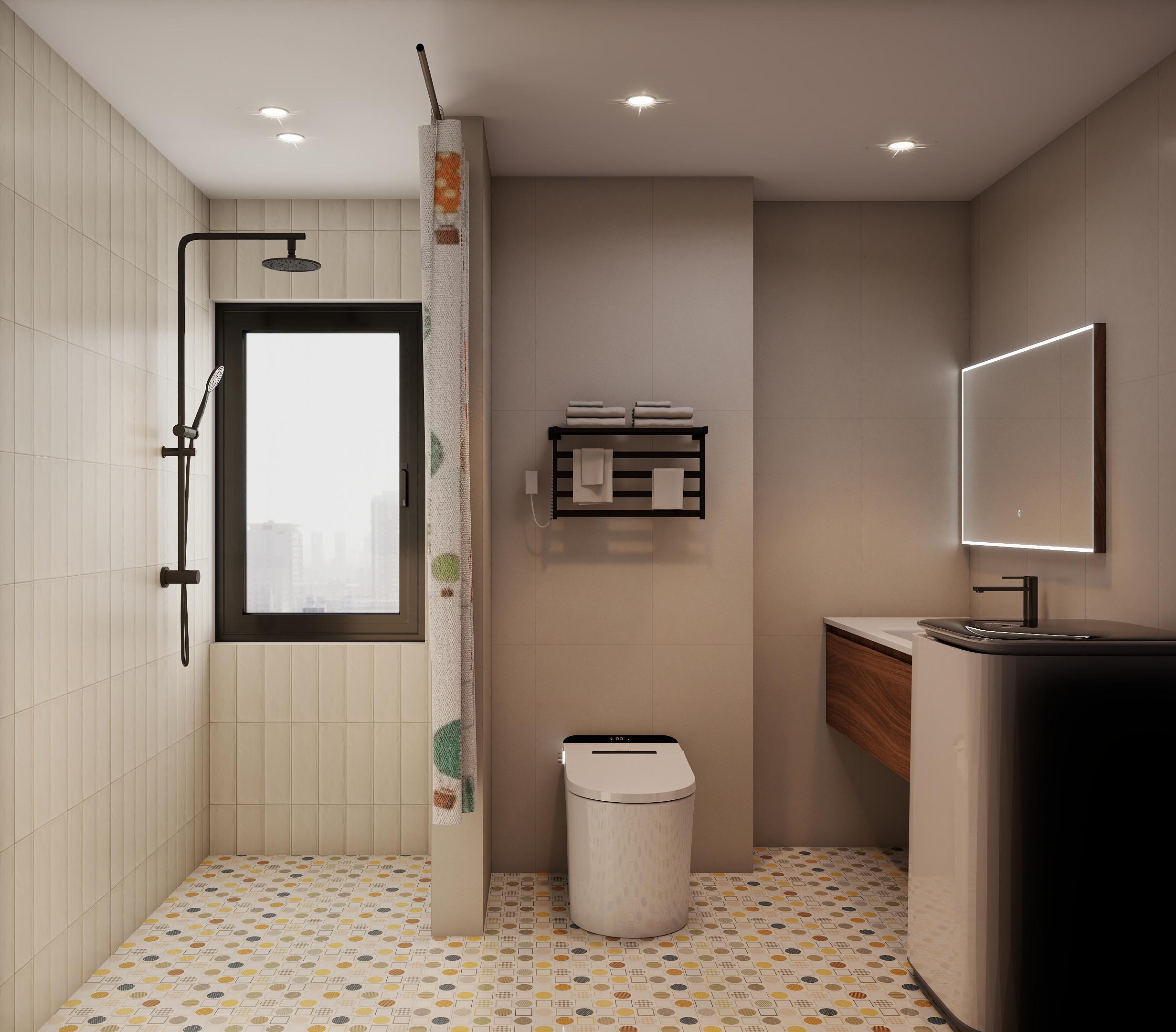 衛(wèi)生間采用了干濕分離的設(shè)計(jì),濕區(qū)安裝了黑色的淋浴噴頭和花灑,搭配白色的豎條紋浴簾,簡(jiǎn)潔而實(shí)用。浴簾旁邊是一扇黑色的窗戶,保證了通風(fēng)和采光。衛(wèi)生間的墻面鋪設(shè)了淺米色的瓷磚,地面則鋪設(shè)了帶有彩色圓點(diǎn)圖案的馬賽克瓷磚,增添了一些趣味性。