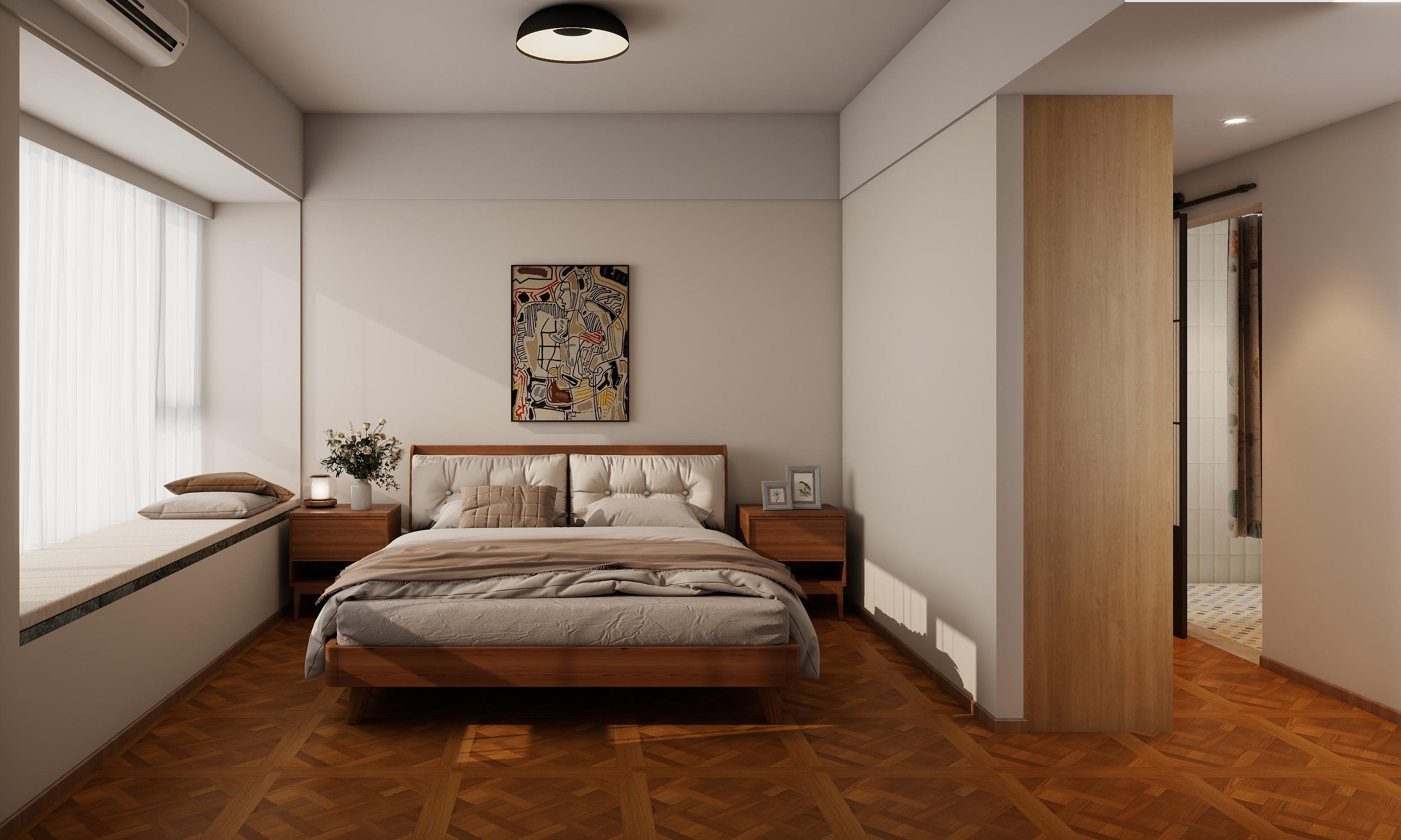 臥室的設(shè)計(jì)同樣以簡(jiǎn)約和溫馨為主。地板同樣采用了人字形拼接的木質(zhì)地板,與客廳相呼應(yīng)。墻面以淺米色為主,營(yíng)造出寧?kù)o的睡眠環(huán)境。臥室中央擺放著一張木質(zhì)雙人床,床上鋪著灰色的床單和被子,搭配兩個(gè)淺色的枕頭和一個(gè)棕色的靠墊,顯得舒適而溫馨。