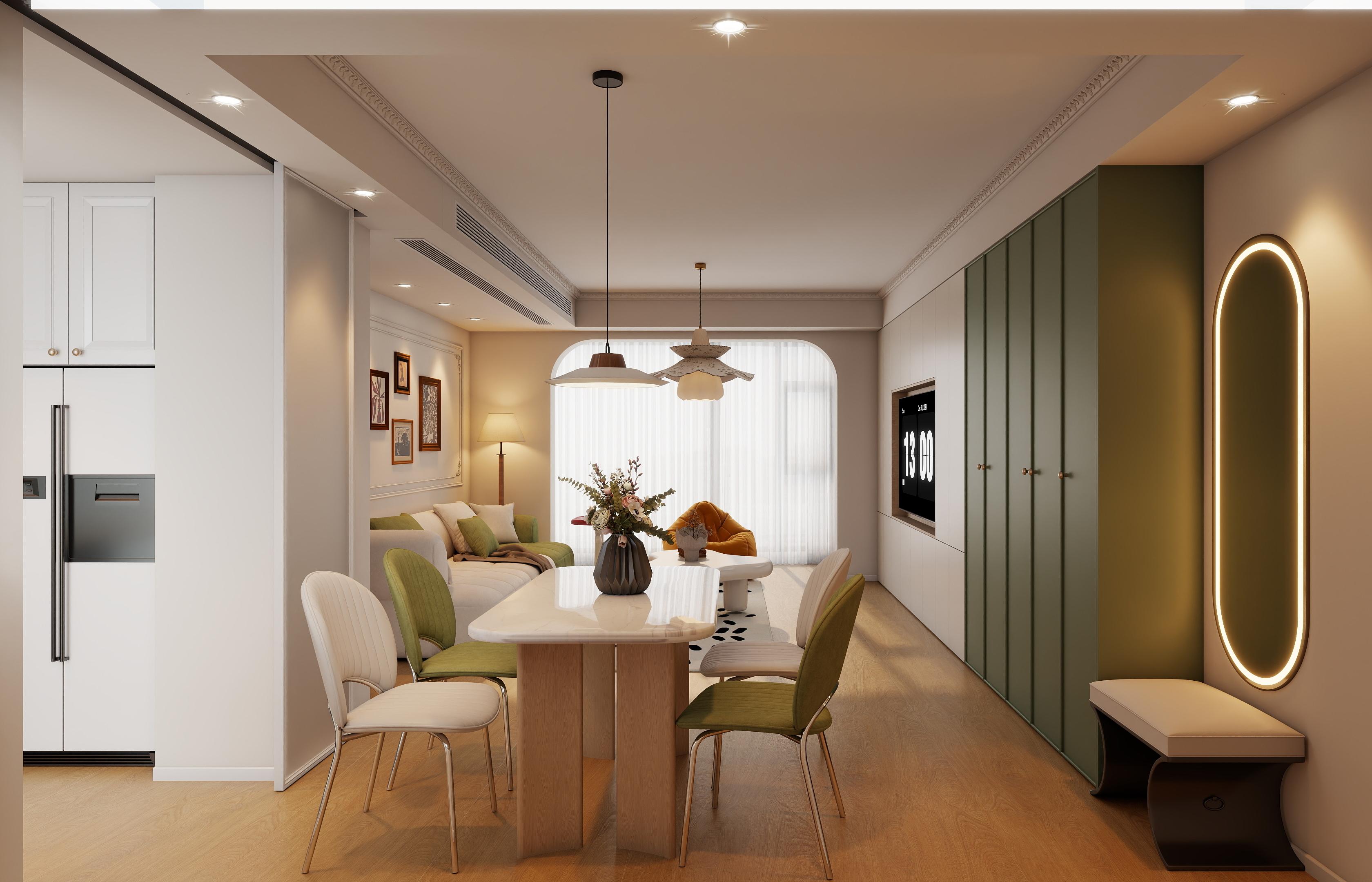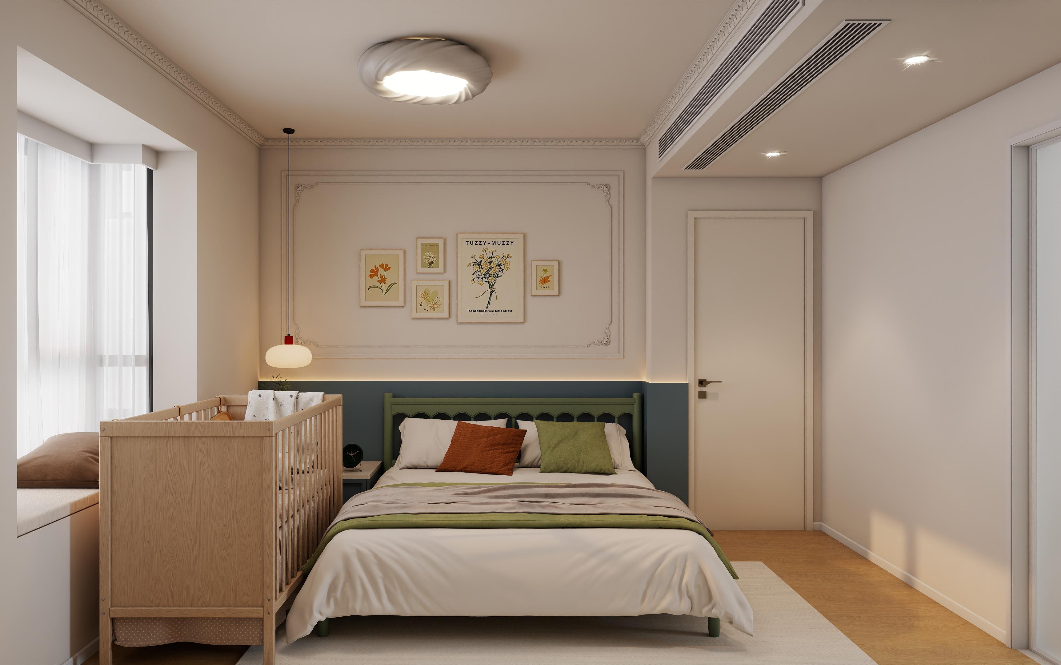 墻面以淺奶油色為主,搭配白色的石膏線(xiàn)條,增添了空間的層次感。地板采用淺木色,與整體的奶油原木風(fēng)相呼應(yīng)。主燈采用了獨(dú)特的花瓣造型,搭配筒燈和落地?zé)?,營(yíng)造出溫馨而富有層次的光環(huán)境。