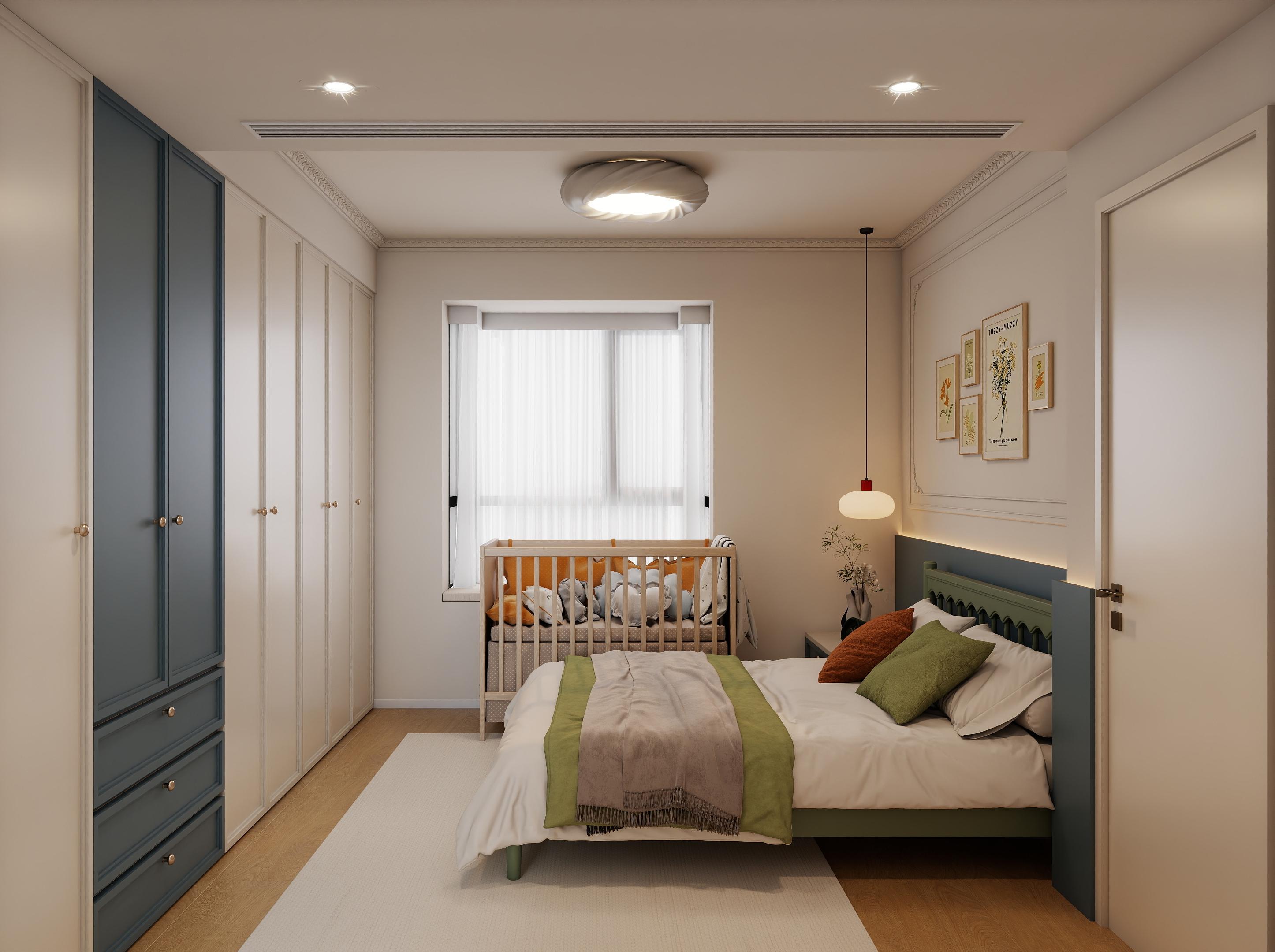 房間的墻壁采用了柔和的綠色,白色的柜體和天花板則使空間顯得更加明亮和寬敞,衣柜旁邊的開(kāi)放式收納柜,帶有多個(gè)小格子,方便分類(lèi)存放物品,也培養(yǎng)孩子整理物品的好習(xí)慣。