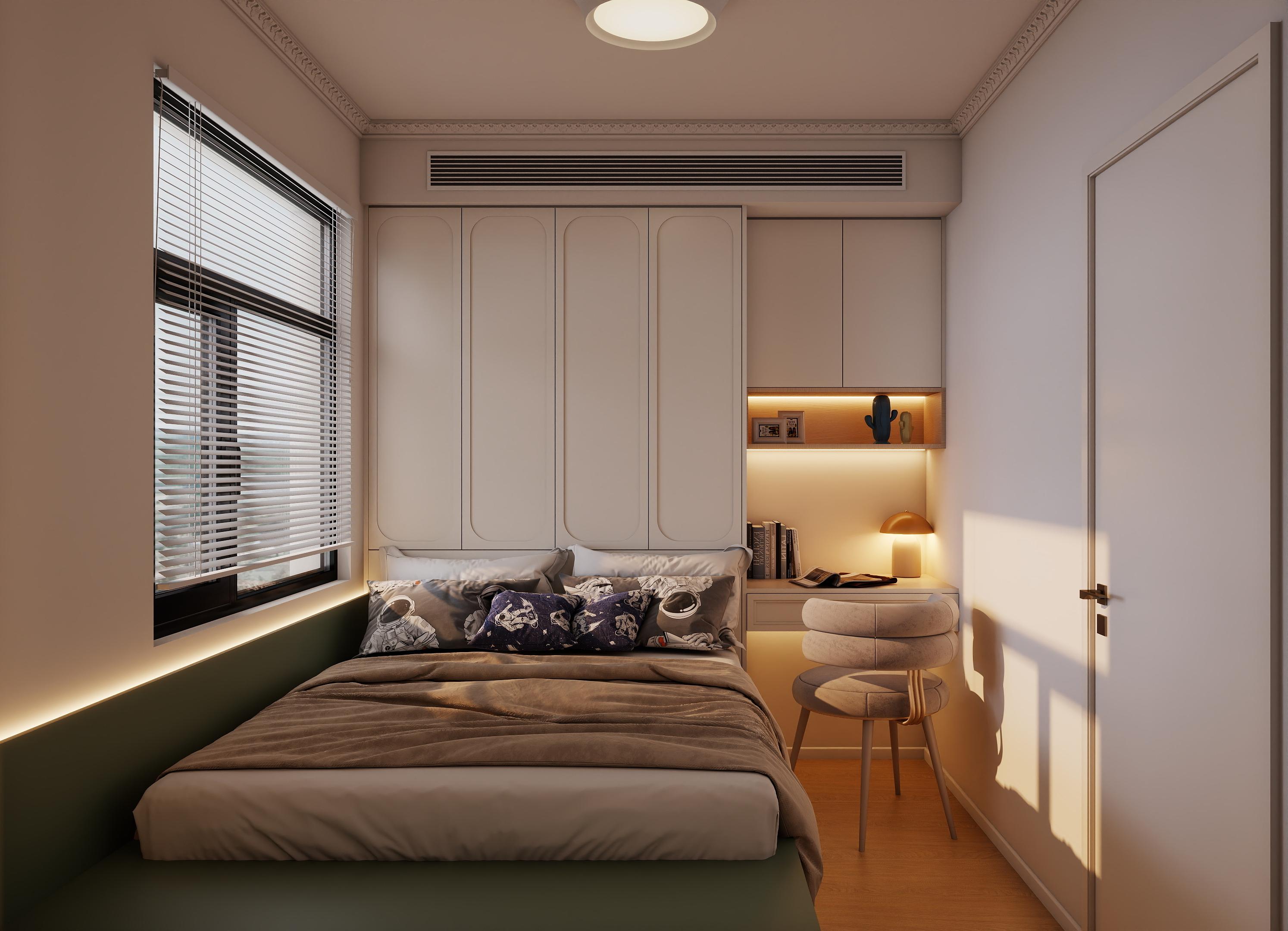 床鋪采用了低飽和度的灰色和綠色床品,與原木色的床架和地板相得益彰。衣柜和書(shū)桌也選用了原木材質(zhì),保持了整體風(fēng)格的一致性。