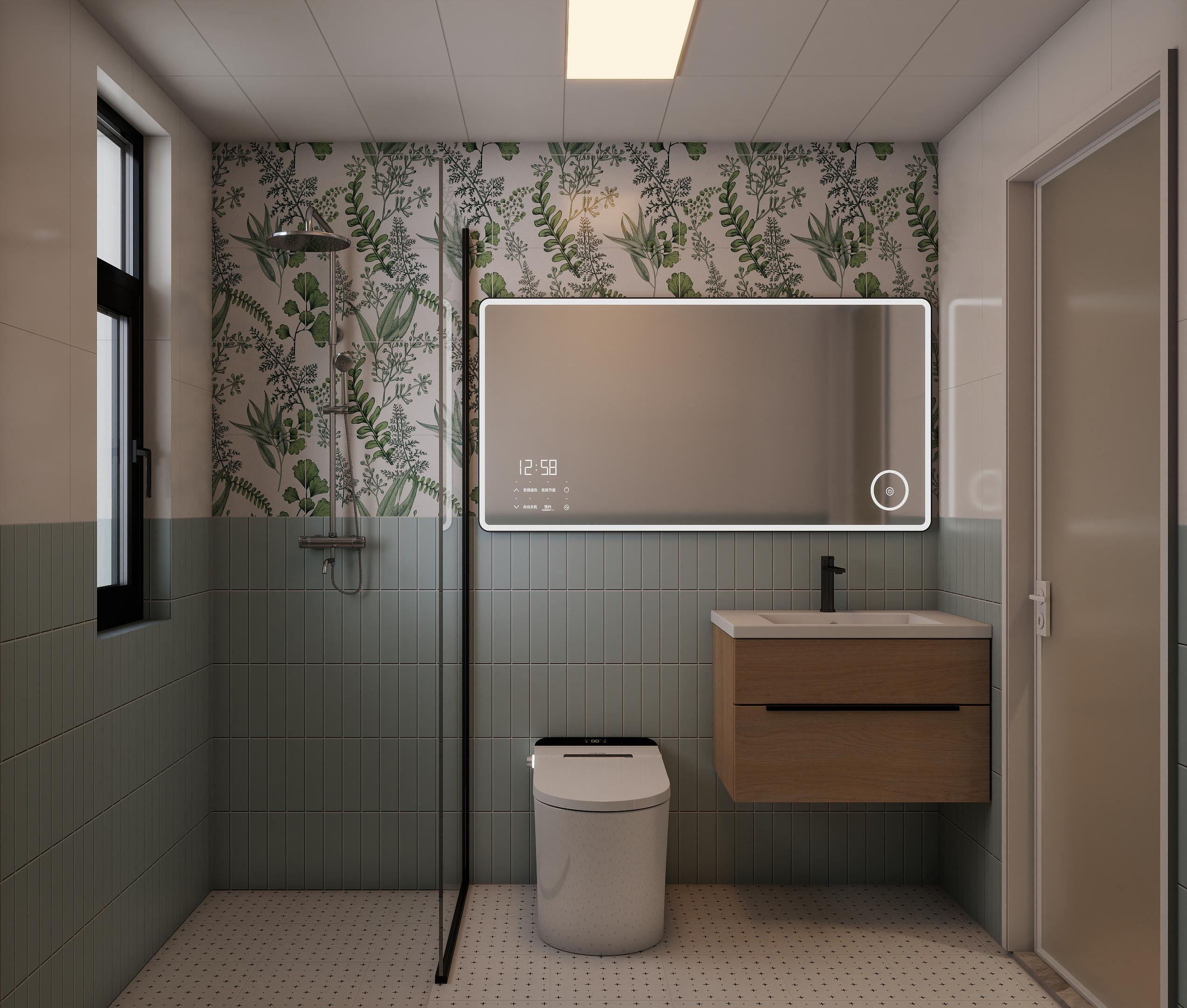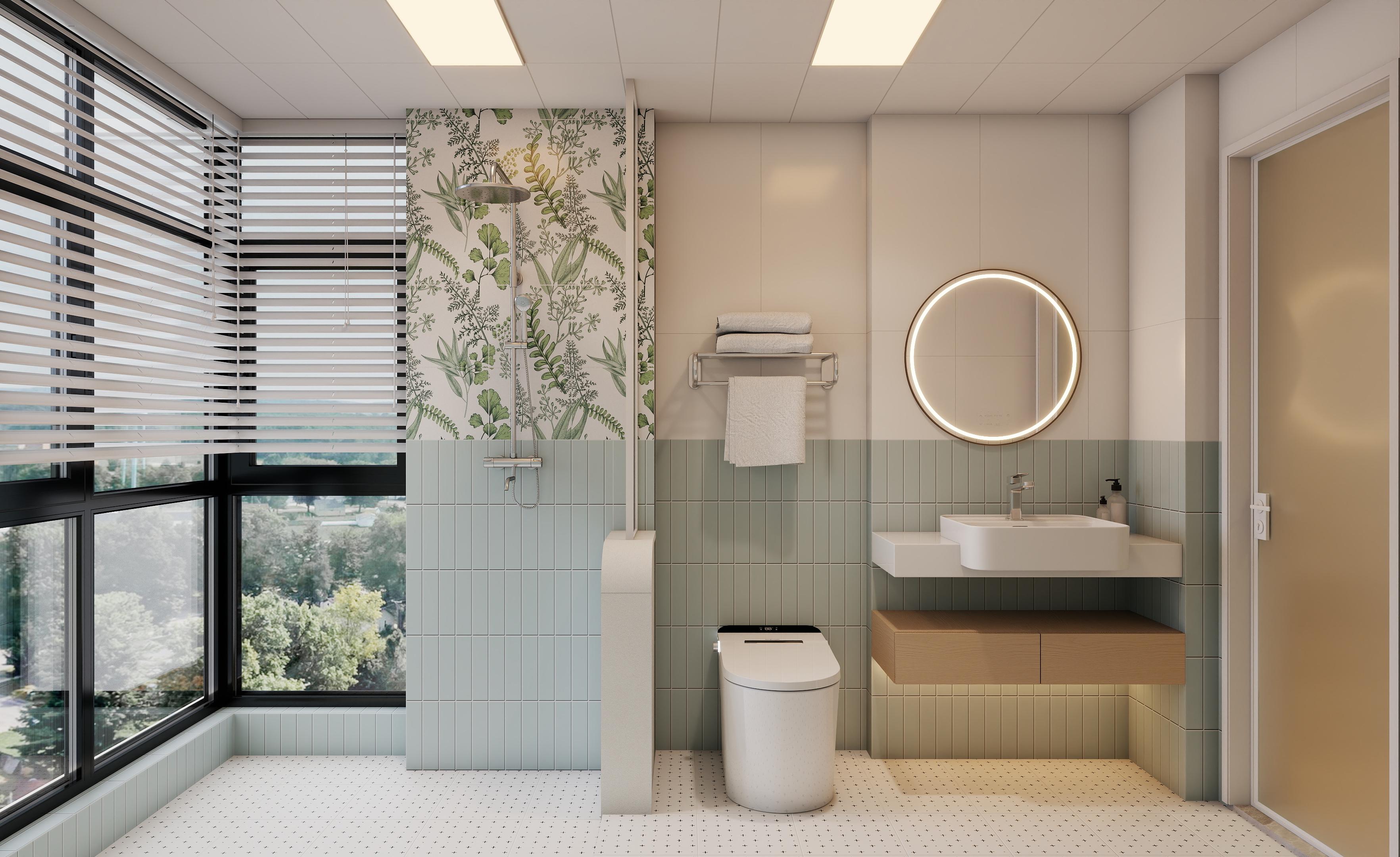 采用了玻璃隔斷進(jìn)行干濕分離,保持了衛(wèi)生間的干燥和清潔,白色的智能馬桶和洗手臺(tái)簡(jiǎn)潔大方,洗手臺(tái)下方的木質(zhì)收納柜提供了充足的收納空間,淋浴區(qū)的植物墻紙為空間增添了一份自然氣息。