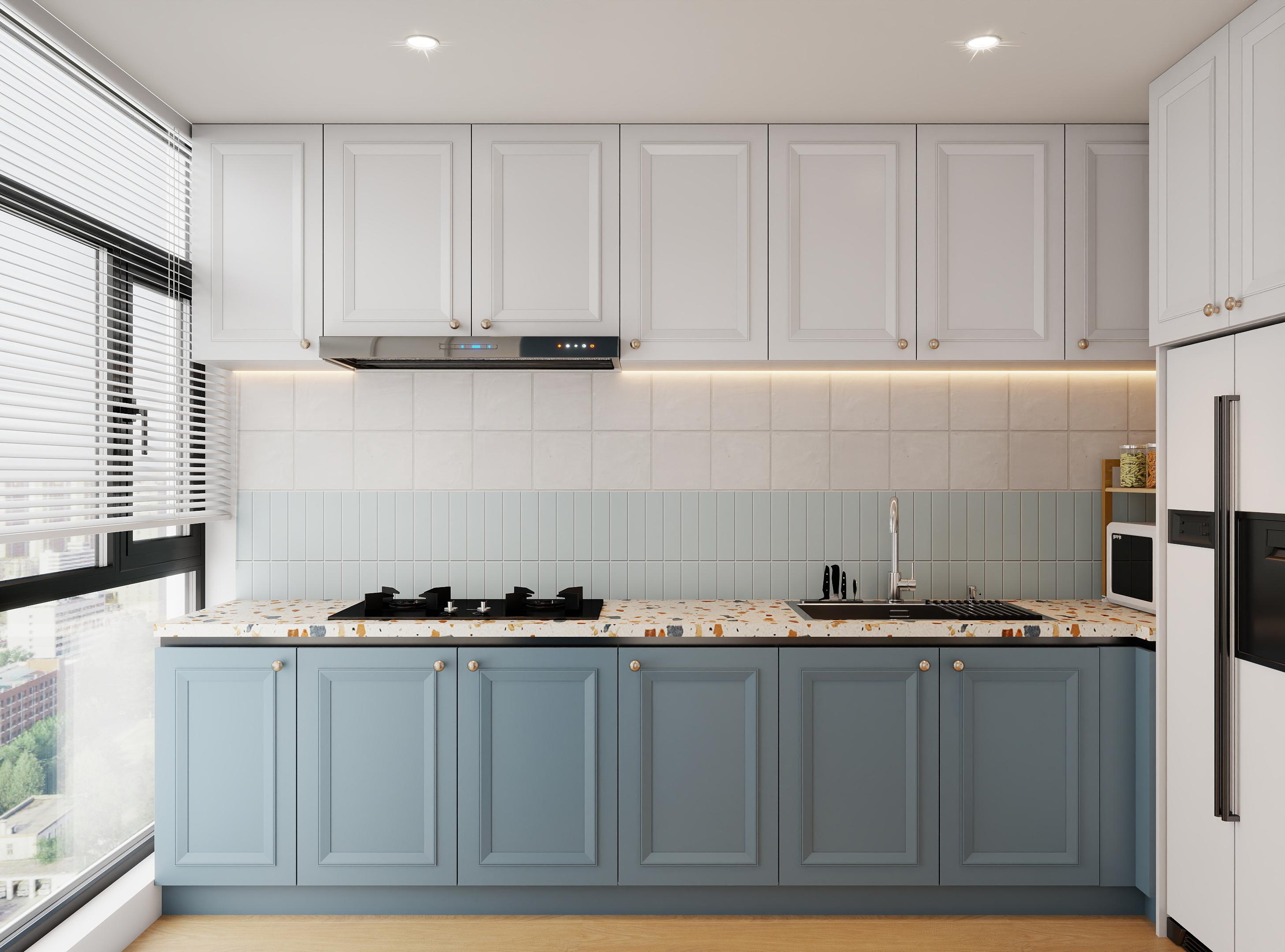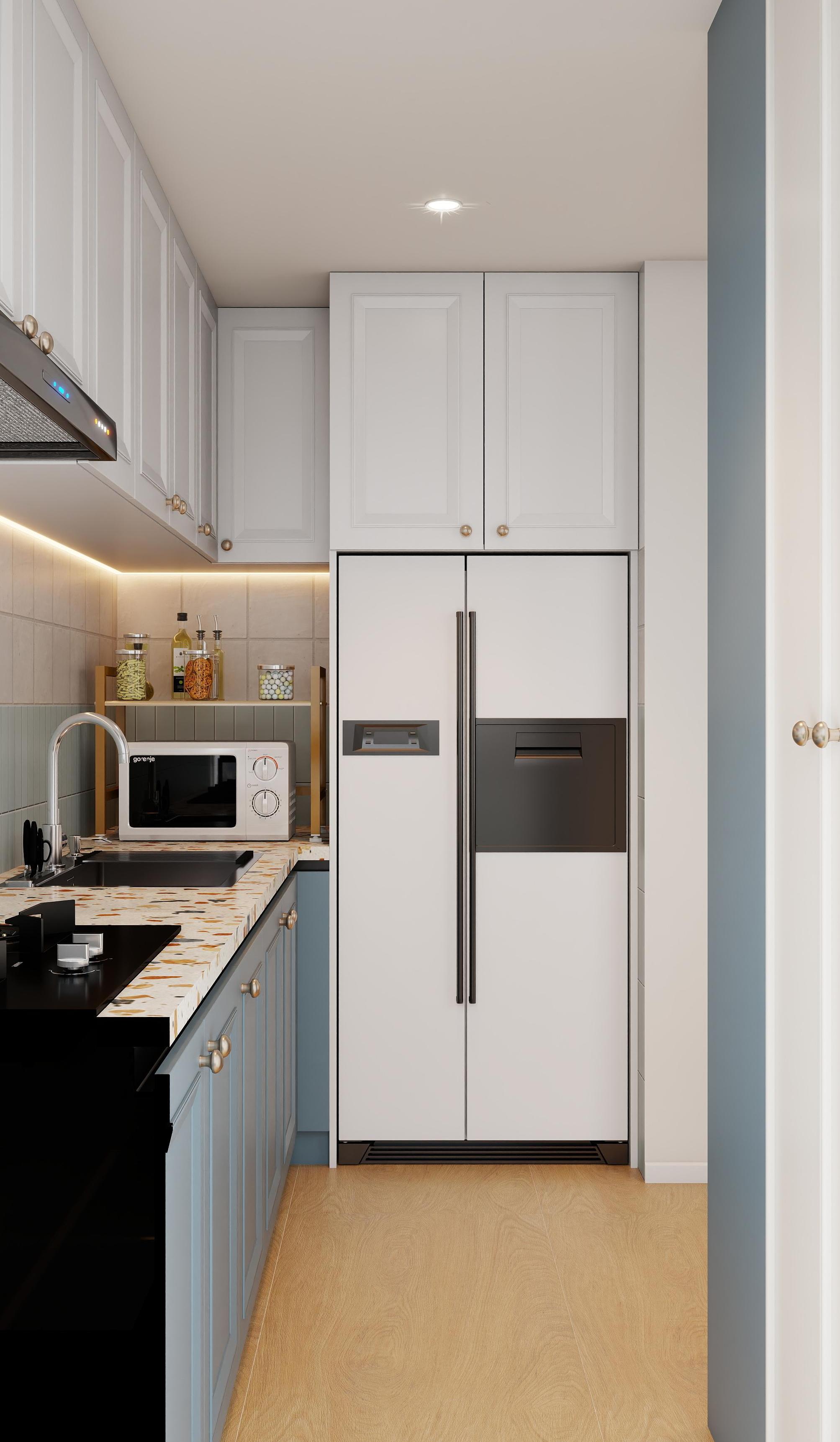 廚房采用了L型布局,這種設(shè)計(jì)能夠充分利用空間,形成高效的操作三角區(qū),即儲(chǔ)物區(qū)(冰箱)、清洗區(qū)(水槽)和烹飪區(qū)(灶臺(tái))之間的動(dòng)線(xiàn)流暢,方便使用者在烹飪過(guò)程中自然地移動(dòng),提高操作效率。