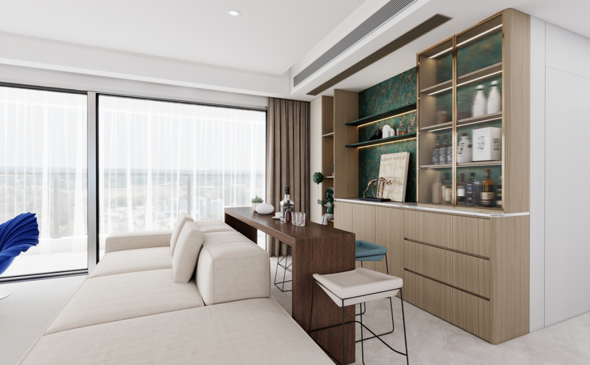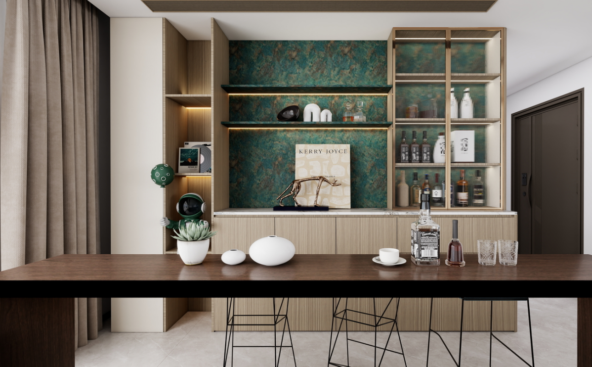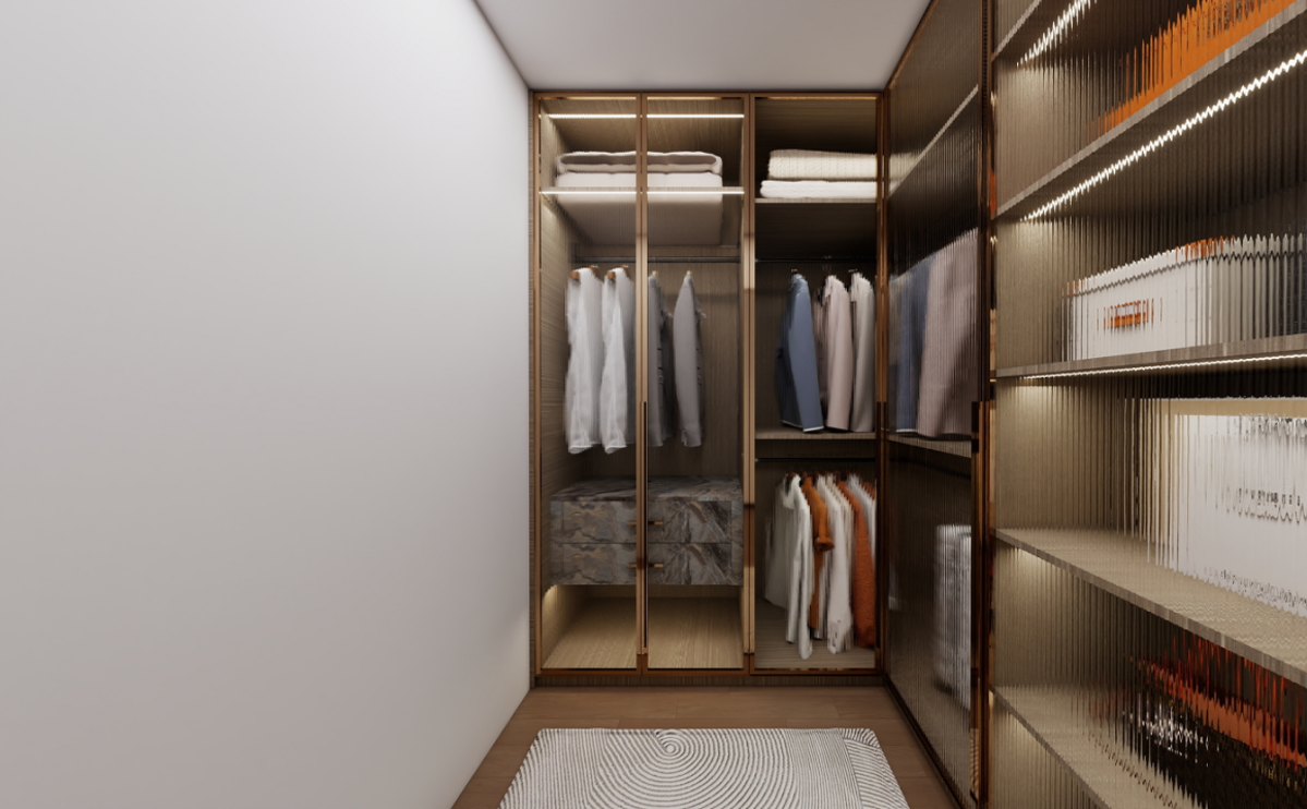衣帽間采用了開放式與封閉式相結合的定制柜體設計,既方便拿取物品,又能有效防塵。柜體內部設置了合理的分區(qū),包括掛衣區(qū)、疊放區(qū)、抽屜等,滿足了不同衣物的存放需求。同時,衣帽間還配備了感應燈帶,提升了使用的便捷性和空間的檔次感。