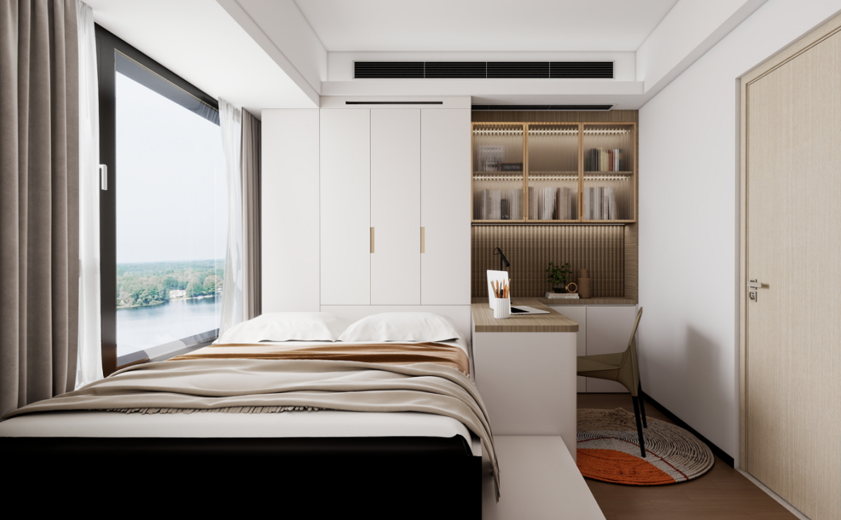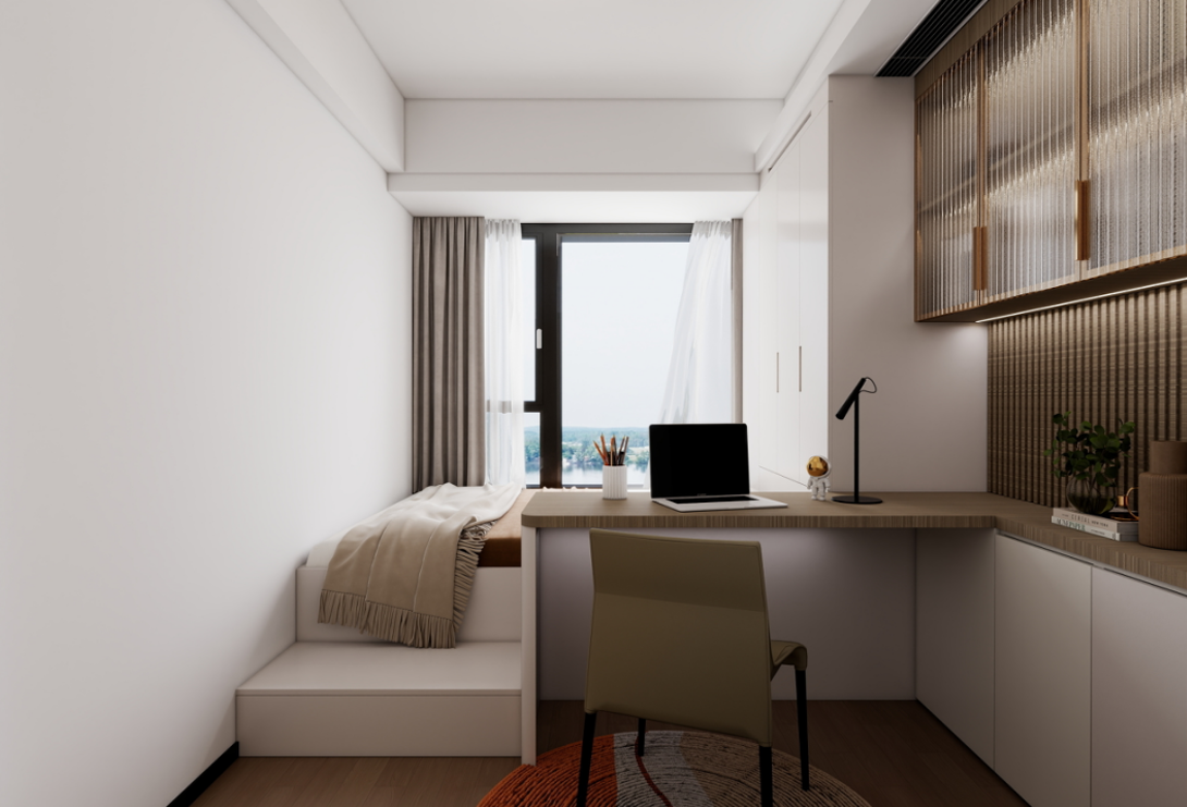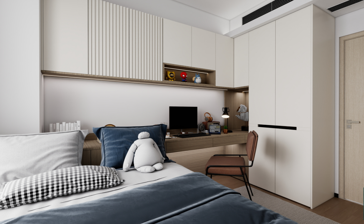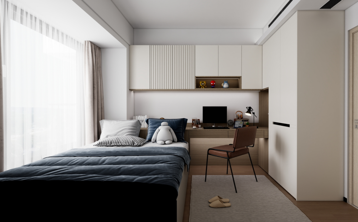 定制的一體化書桌、書柜和衣柜組合,充分利用了空間,滿足了學習、儲物和休息的多重需求,將小空間運用到最大化。