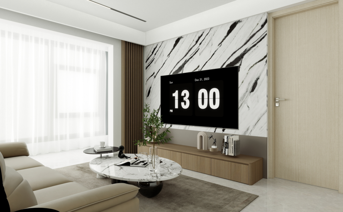 電視背景墻:采用大理石紋理的裝飾材料,搭配簡潔的木質電視柜,既時尚又實用。電視柜上擺放了一些裝飾品和電子設備,增加了空間的層次感和功能性。