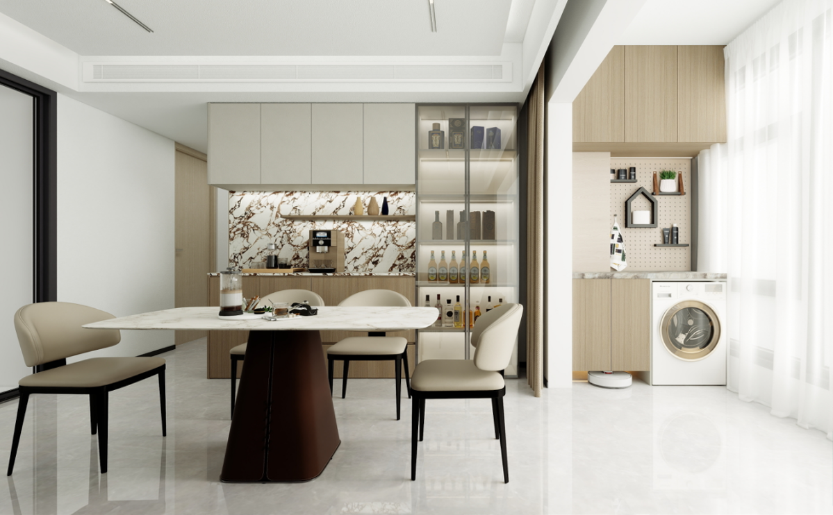 餐廳區(qū)域:餐桌采用大理石臺面,搭配淺色餐椅,顯得干凈利落。餐邊柜設計巧妙,既有封閉的儲物空間,又有開放的展示架,方便存放和展示各種物品。背景墻的大理石紋理與餐桌相呼應,整體協(xié)調統(tǒng)一。