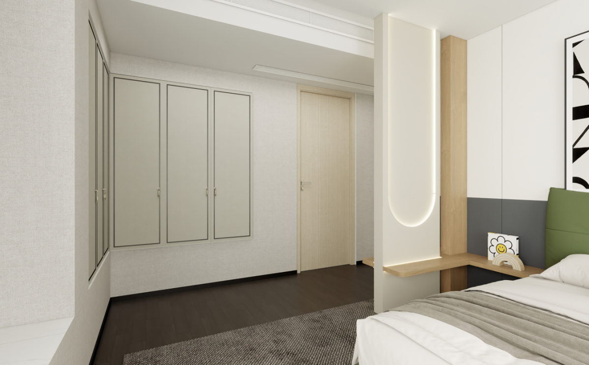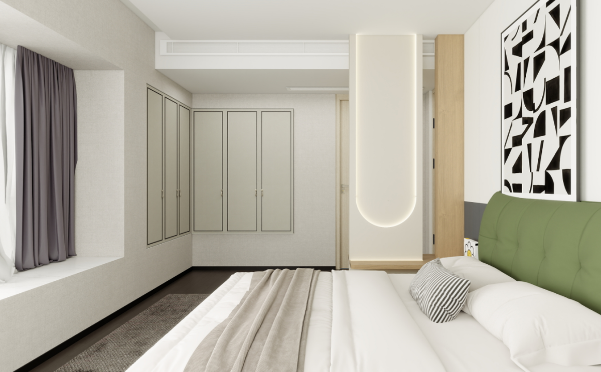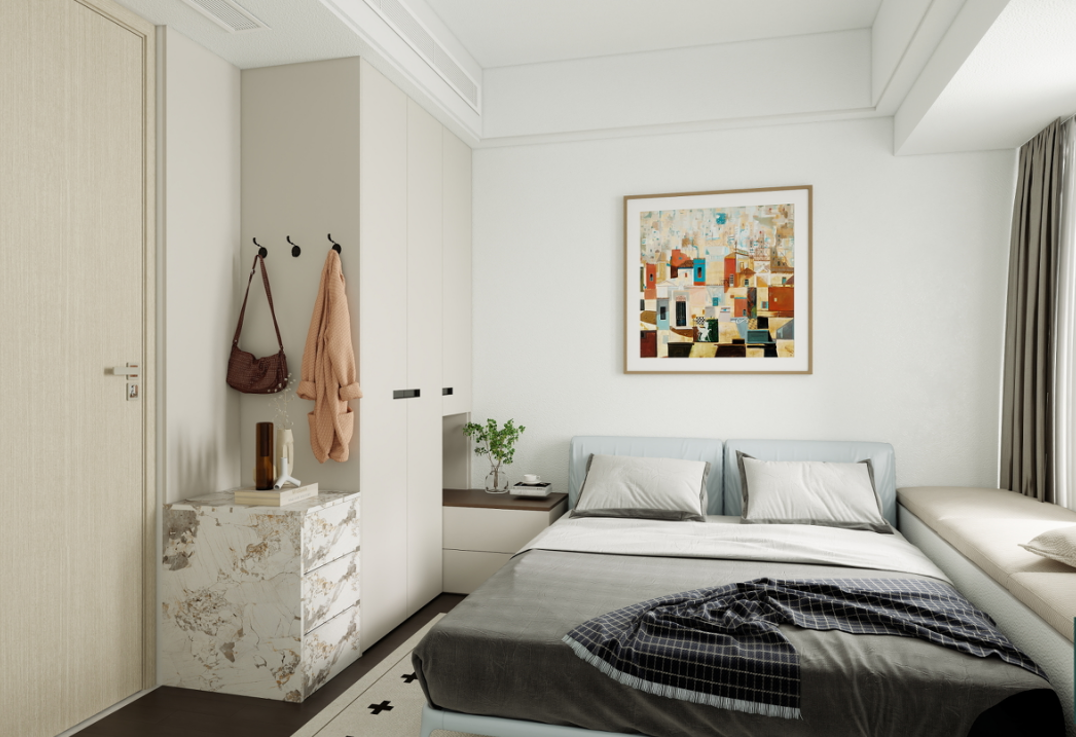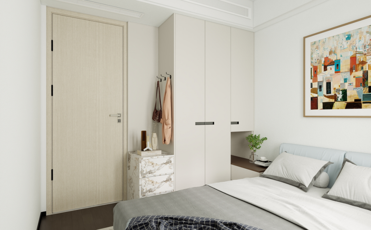 衣柜:定制的到頂衣柜提供了充足的儲物空間,淺灰色的柜門簡潔大方,與房間整體風格相契合。