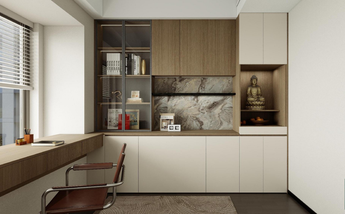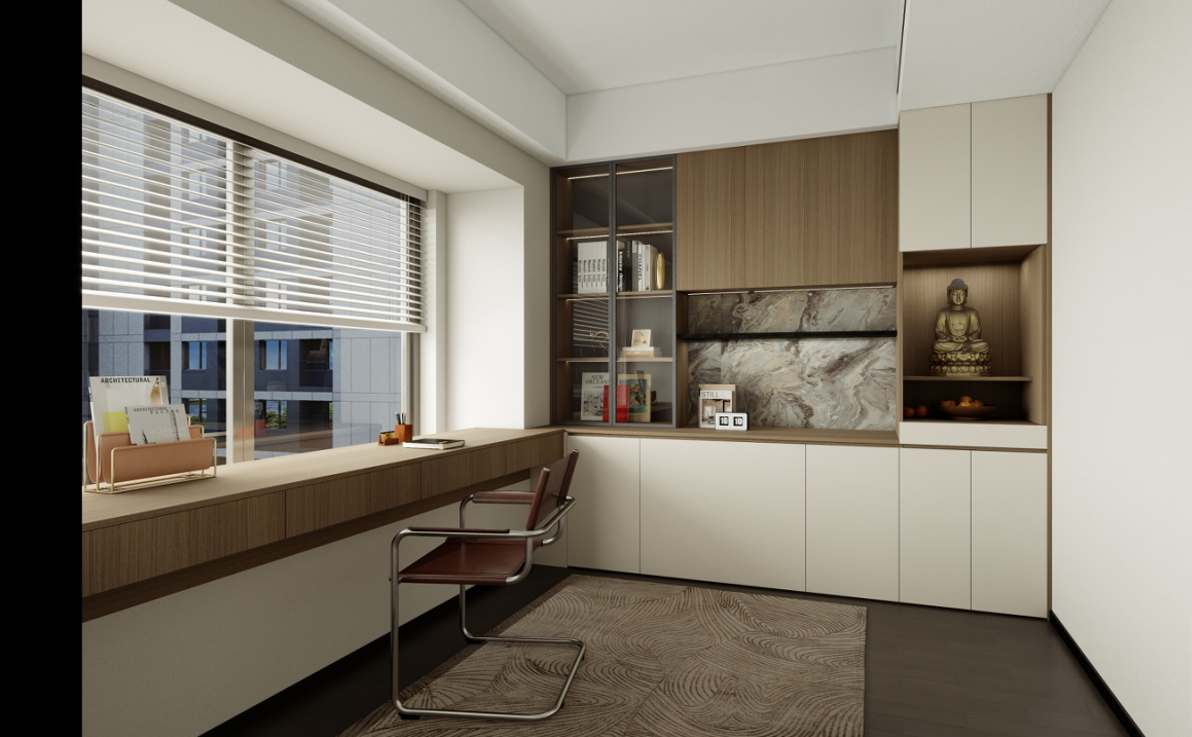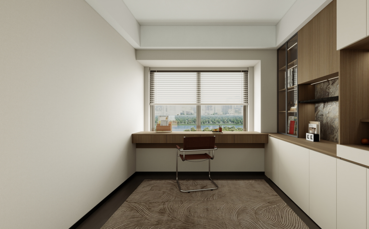 書桌與書架:靠窗定制的長書桌提供了充足的工作和學習空間,搭配舒適的椅子,適合長時間使用。書架采用開放式與封閉式相結合的設計,方便存放和展示書籍、裝飾品等。