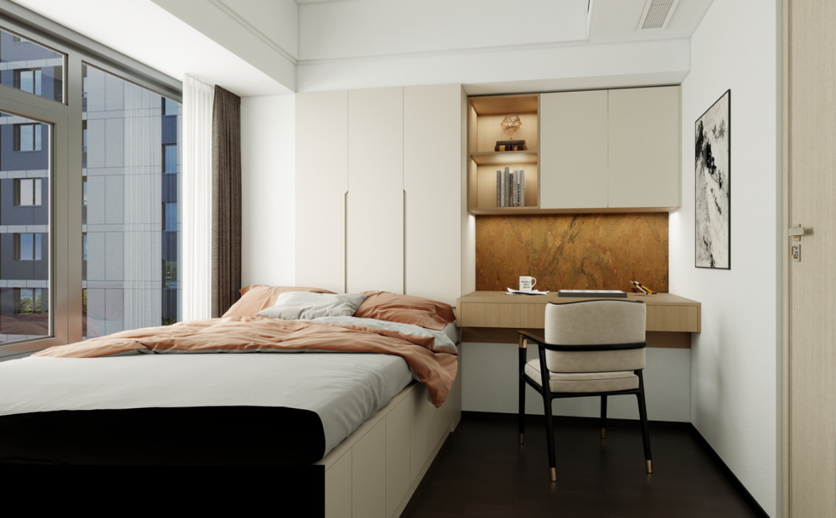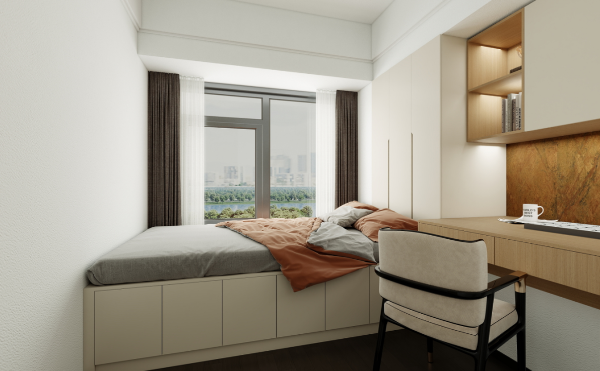 榻榻米與書桌:定制的榻榻米床兼具睡眠和儲物功能,床頭的書桌與衣柜相連,形成了一個高效的學習和儲物空間。