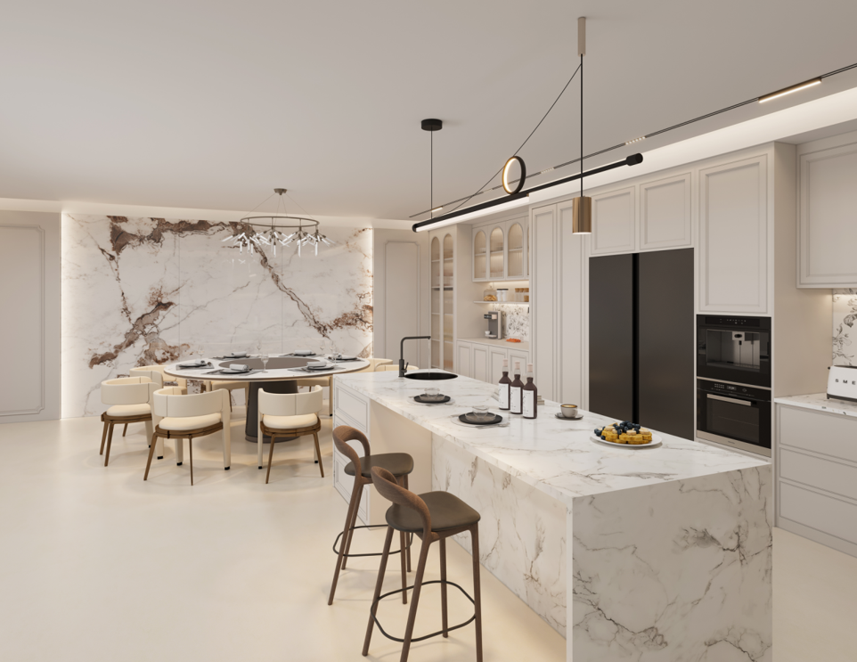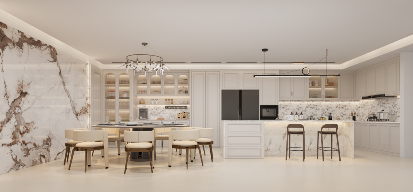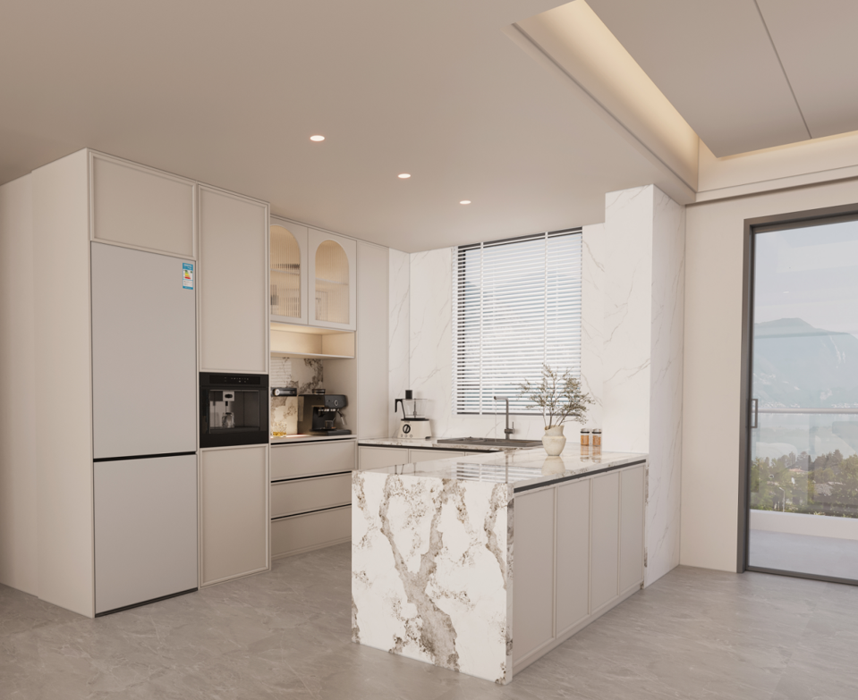 廚房:采用簡潔的白色櫥柜,搭配大理石紋理的臺面和背景墻,顯得干凈整潔且富有質(zhì)感。整體櫥柜根據(jù)廚房的空間尺寸進(jìn)行定制,充分利用了墻角和墻面空間,提供了充足的儲物空間。中島臺的設(shè)計(jì)不僅增加了操作空間,還可以作為早餐吧或社交區(qū)域,增強(qiáng)了廚房的功能性。