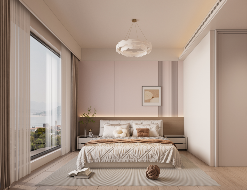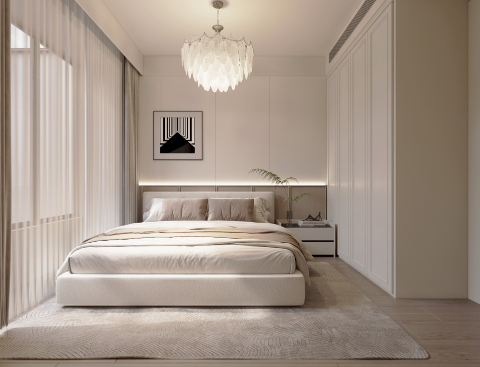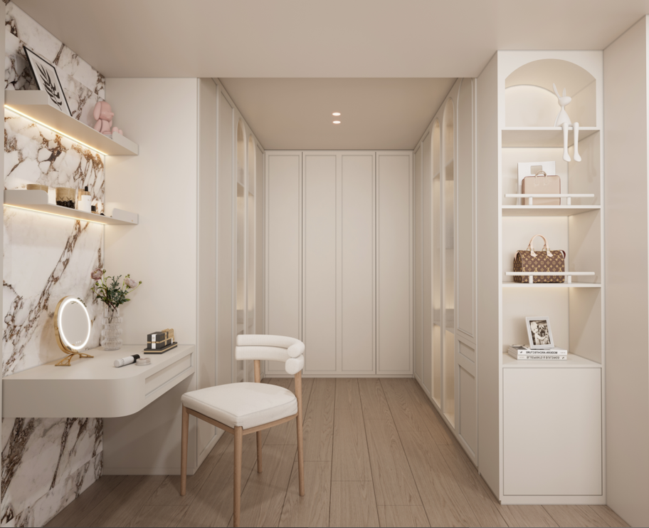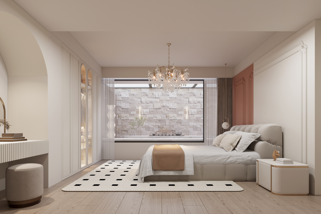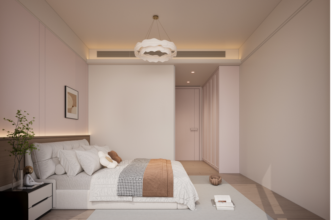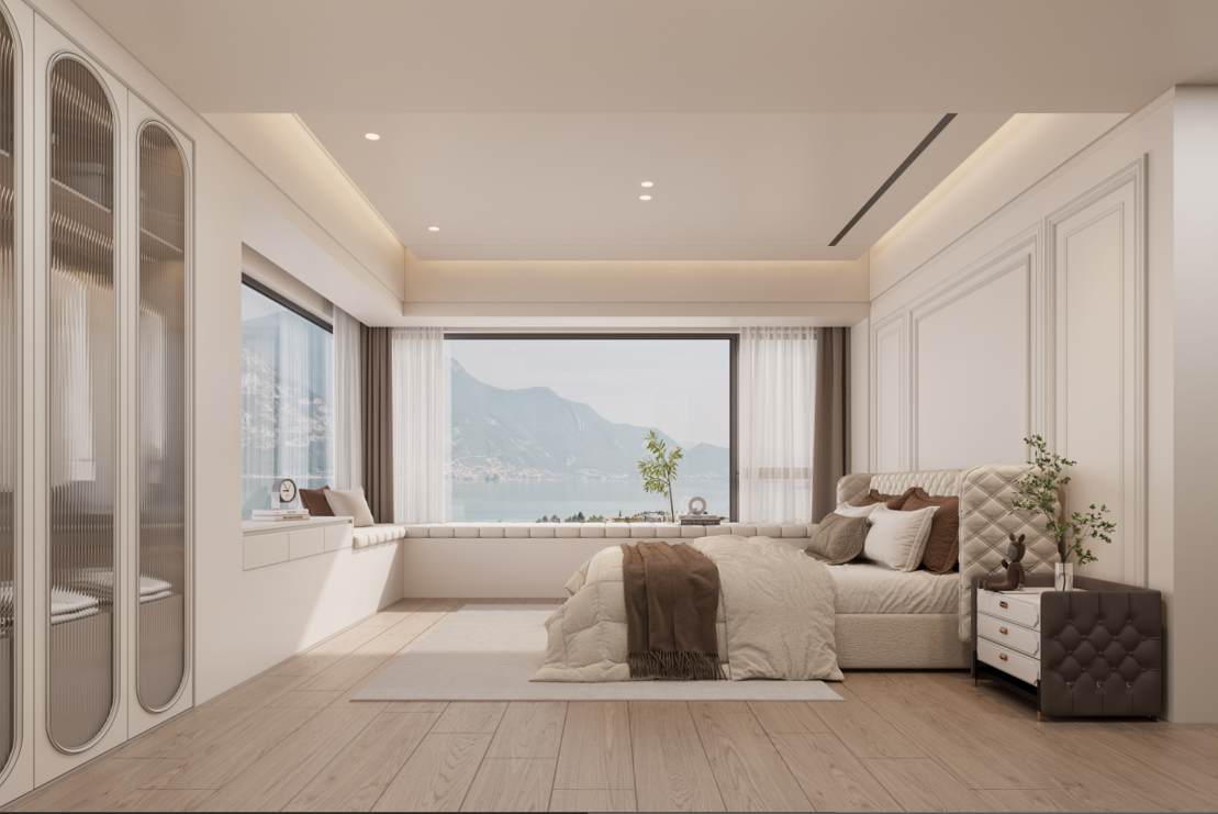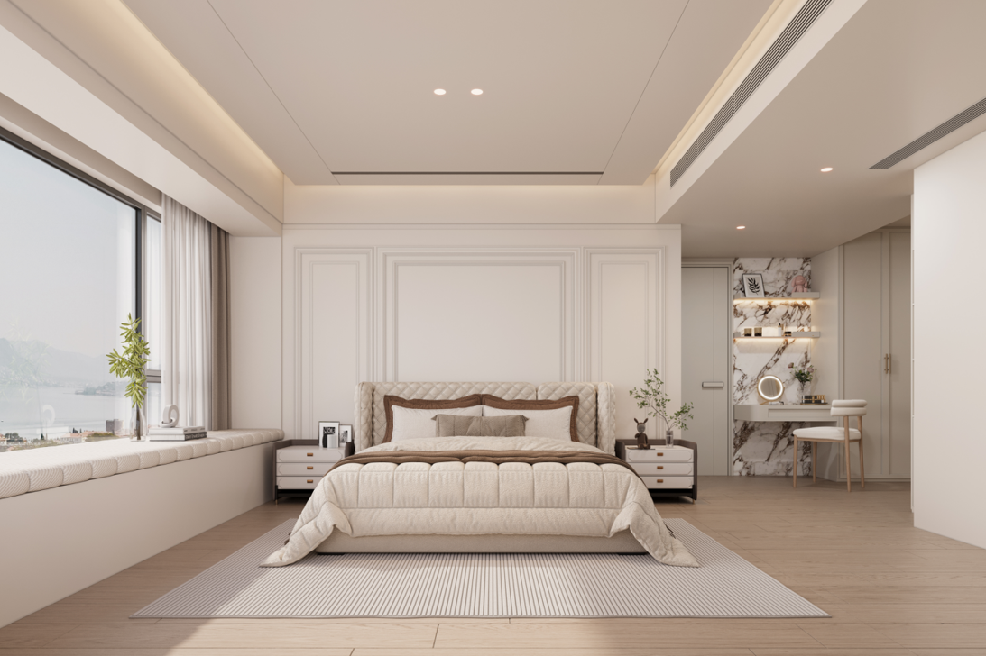 主臥:定制的護(hù)墻板和到頂衣柜,增強(qiáng)了空間的整體感和收納能力。梳妝臺與衣柜一體化設(shè)計(jì),節(jié)省空間且使用方便。