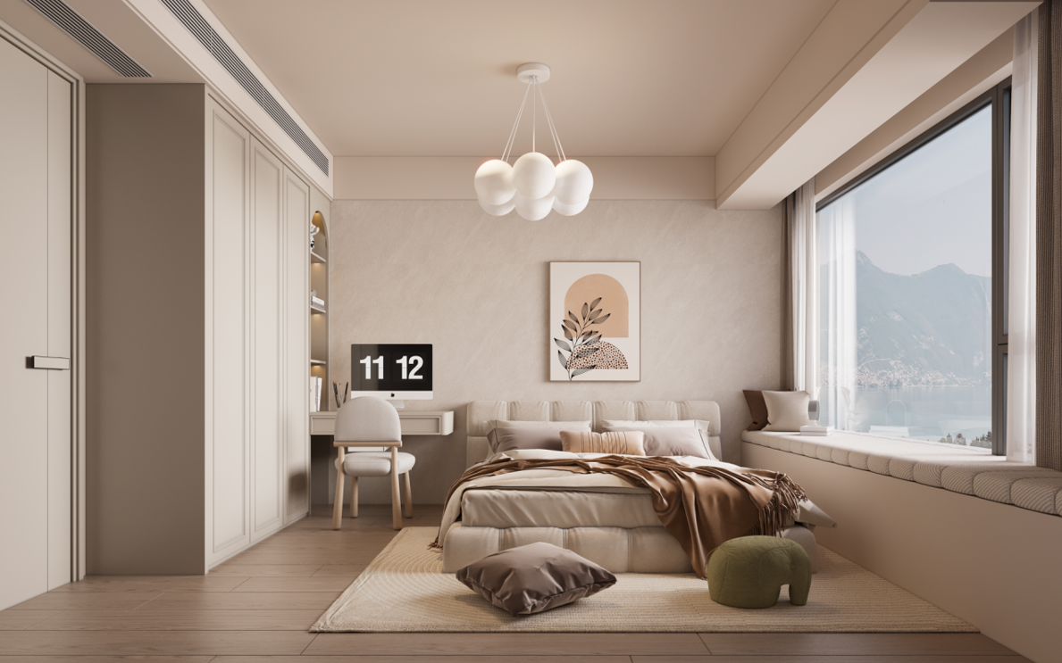 其他房間:根據(jù)不同的使用需求,定制了書桌、衣柜等家具,滿足學(xué)習(xí)、收納等功能。飄窗區(qū)域也進(jìn)行了合理利用,增加了休閑空間。