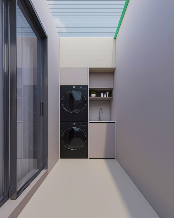 陽臺洗衣房:定制的洗衣柜將洗衣機(jī)和烘干機(jī)嵌入其中,上方和旁邊設(shè)置了儲物空間,方便存放洗衣用品和雜物,充分利用了陽臺的狹小空間,使洗衣房看起來整潔有序。