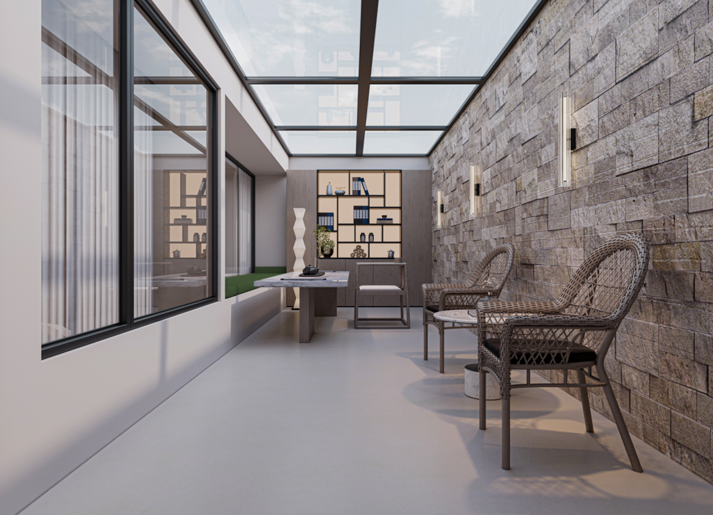 品茗區(qū):定制的書架和休閑桌椅,打造出一個(gè)安靜、愜意的品茶和閱讀空間。石材墻面和玻璃頂?shù)脑O(shè)計(jì),增強(qiáng)了空間的自然感和通透感。