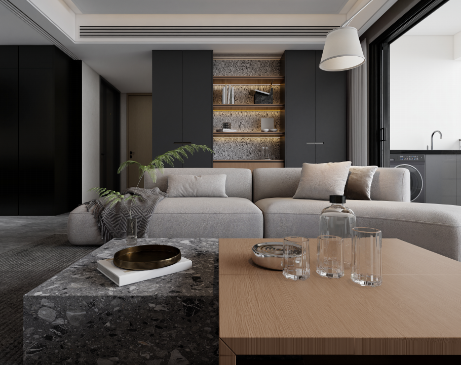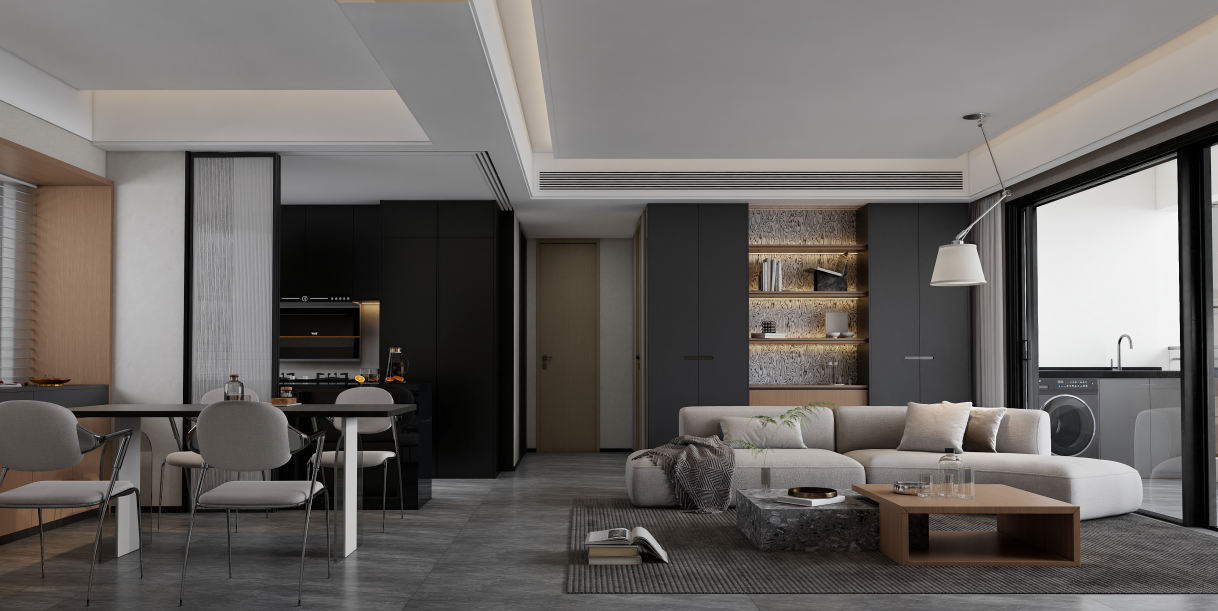 客廳采用開(kāi)放式設(shè)計(jì),與餐廳和廚房相連,沙發(fā)背景墻設(shè)計(jì)了深灰色的定制柜體,中間部分采用開(kāi)放式設(shè)計(jì),內(nèi)置暖黃色燈帶,既增加了空間的層次感,又提供了展示和收納的功能。柜體的材質(zhì)和顏色與整體風(fēng)格相協(xié)調(diào),顯得簡(jiǎn)潔大方,電視背景墻采用淺色石材與黑色柜體相結(jié)合的設(shè)計(jì)