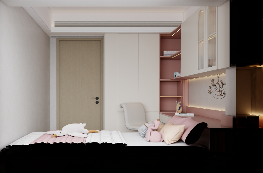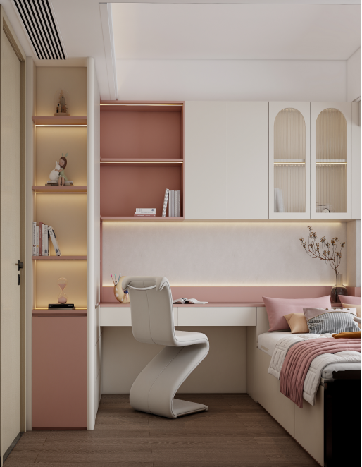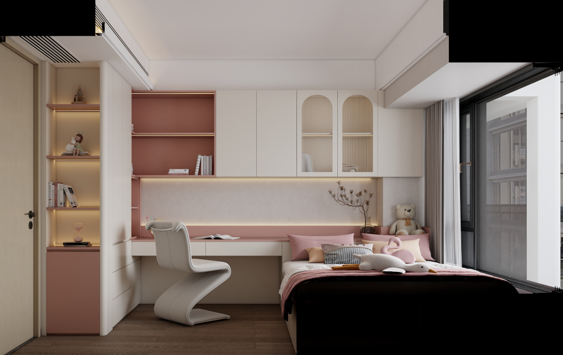 榻榻米與書桌一體設(shè)計(jì):兒童房采用了榻榻米與書桌一體的定制設(shè)計(jì),充分利用了空間。榻榻米下方設(shè)有收納抽屜,可以存放衣物和雜物。書桌與書架相連,提供了學(xué)習(xí)和收納的空間。