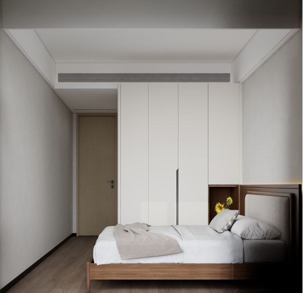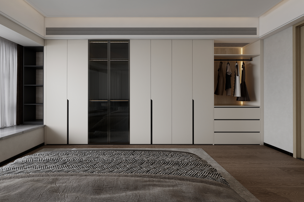 主臥的設(shè)計(jì)簡(jiǎn)約大方,以淺色為主色調(diào),搭配木質(zhì)地板,營(yíng)造出溫馨舒適的睡眠環(huán)境。臥室一側(cè)設(shè)計(jì)了到頂?shù)亩ㄖ埔鹿瘢峁┝顺渥愕囊挛锸占{空間,衣柜的外觀設(shè)計(jì)簡(jiǎn)潔,與整體風(fēng)格相統(tǒng)一,部分區(qū)域采用玻璃柜門,增加了空間的通透感。