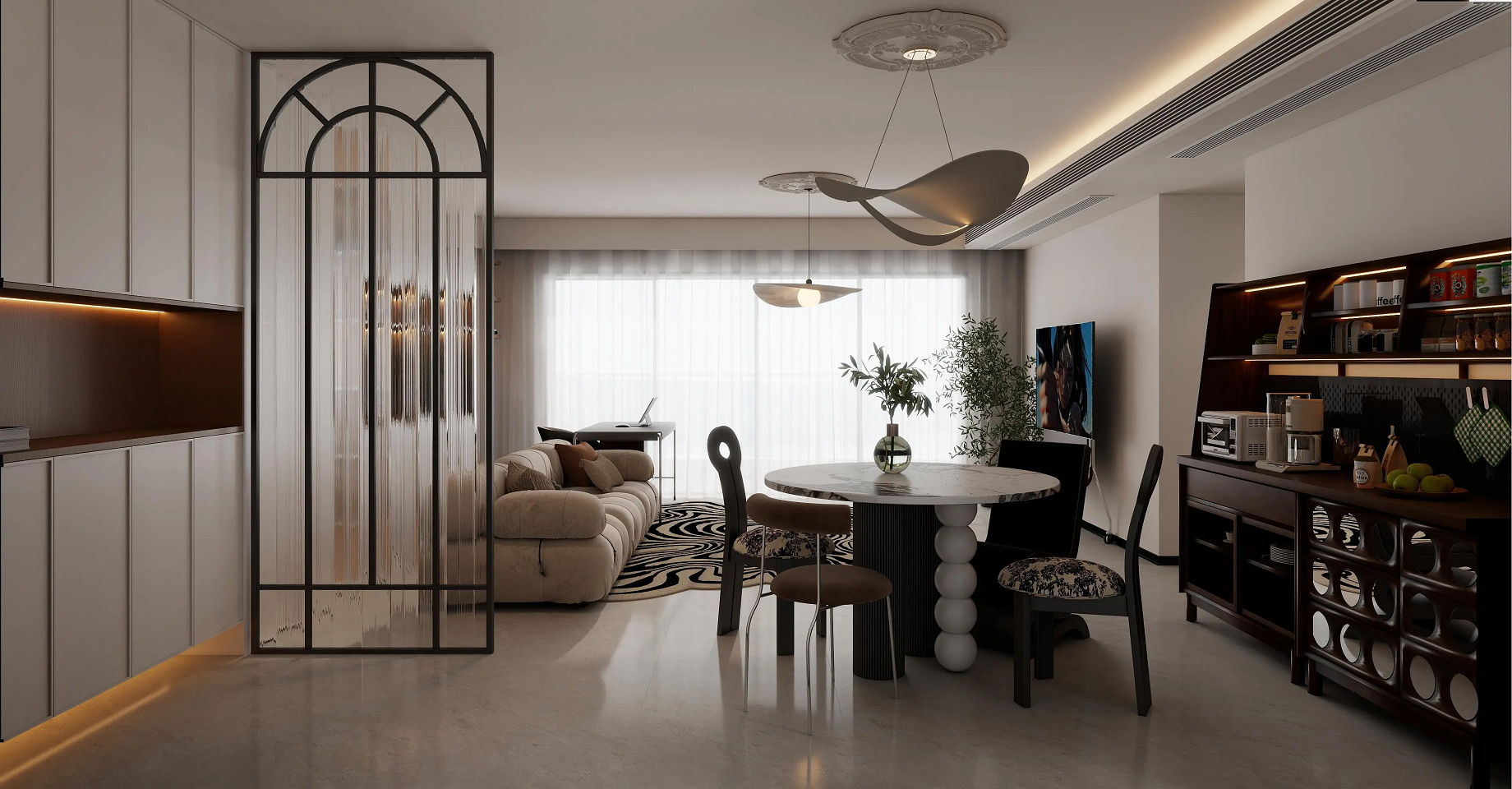 客客廳區(qū)域擺放了舒適的沙發(fā)和獨(dú)特的圓形大理石餐桌,搭配黑白相間的抽象地毯,增添了藝術(shù)感。電視背景墻簡(jiǎn)潔,電視下方的移動(dòng)支架和旁邊的綠植為空間增添了生機(jī)。吊燈設(shè)計(jì)獨(dú)特,既提供了充足的照明,又成為空間中的視覺(jué)焦點(diǎn)