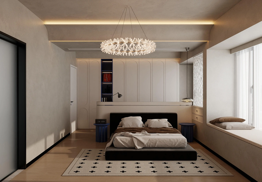 臥室設(shè)計(jì)注重舒適和私密性,大窗戶保證了充足的自然光線。床頭背景墻與衣柜一體化設(shè)計(jì),節(jié)省空間且整體感強(qiáng)。飄窗區(qū)域設(shè)計(jì)了休閑區(qū),可以放置靠墊,提供了一個(gè)放松的角落。