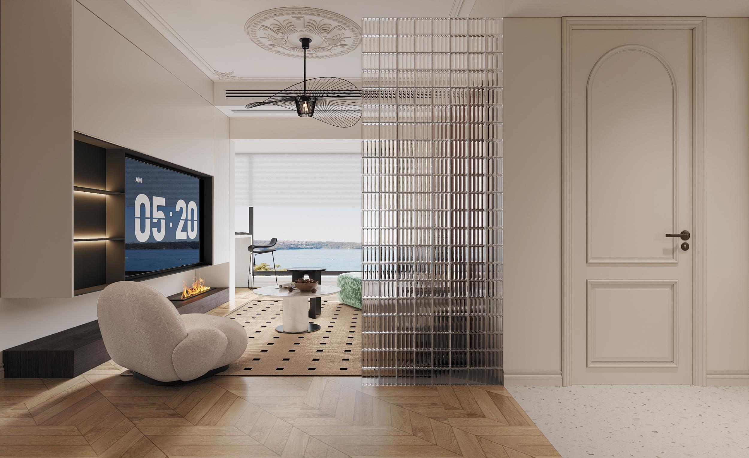 客廳設計了透明玻璃的隔斷設計,這種隔斷屬于半墻式隔斷的一種特殊形式。它不完全封閉空間,在劃分功能區(qū)域的同時,保持了空間的通透感和連貫性,避免了傳統(tǒng)實體墻隔斷可能帶來的壓抑感。