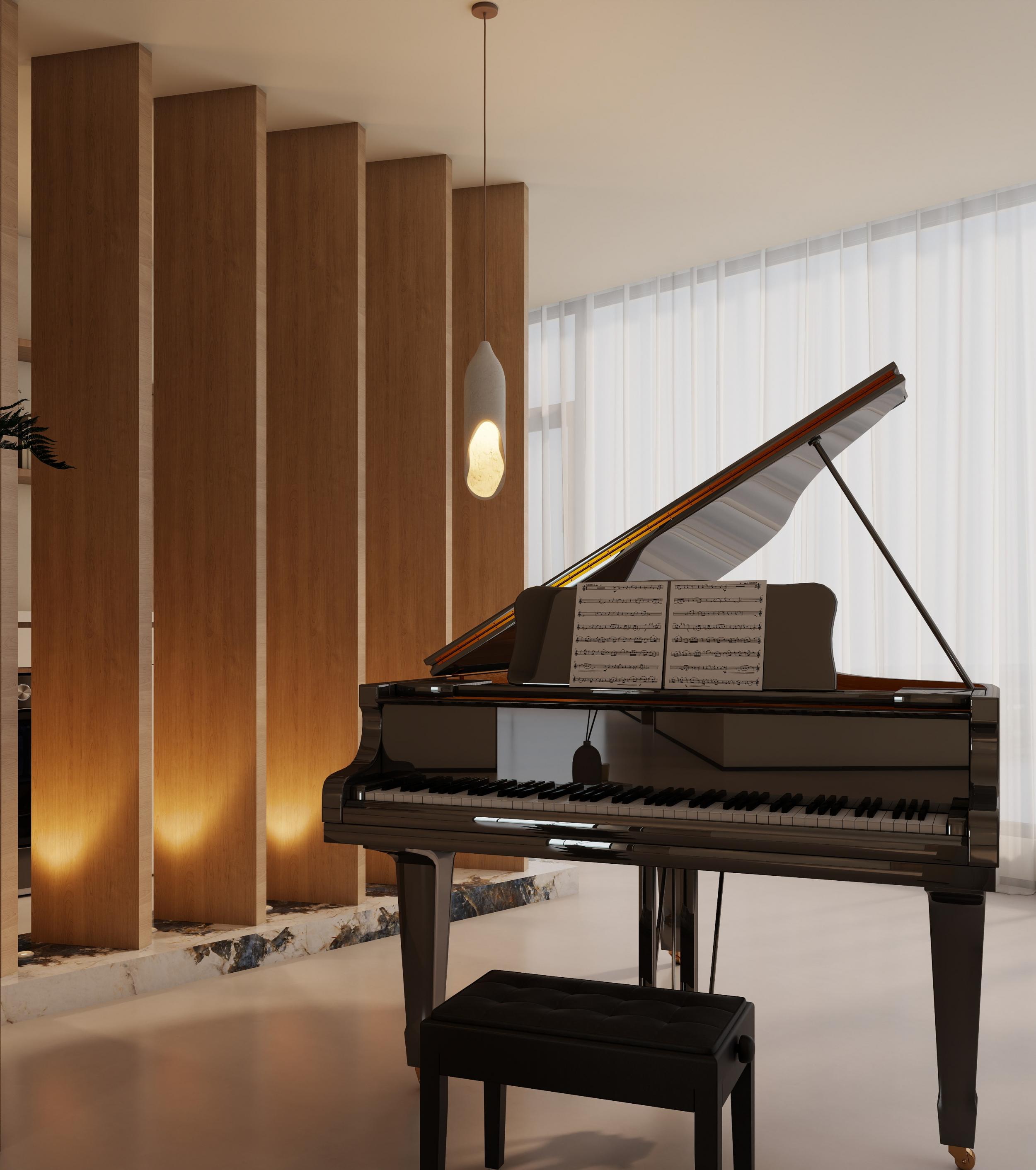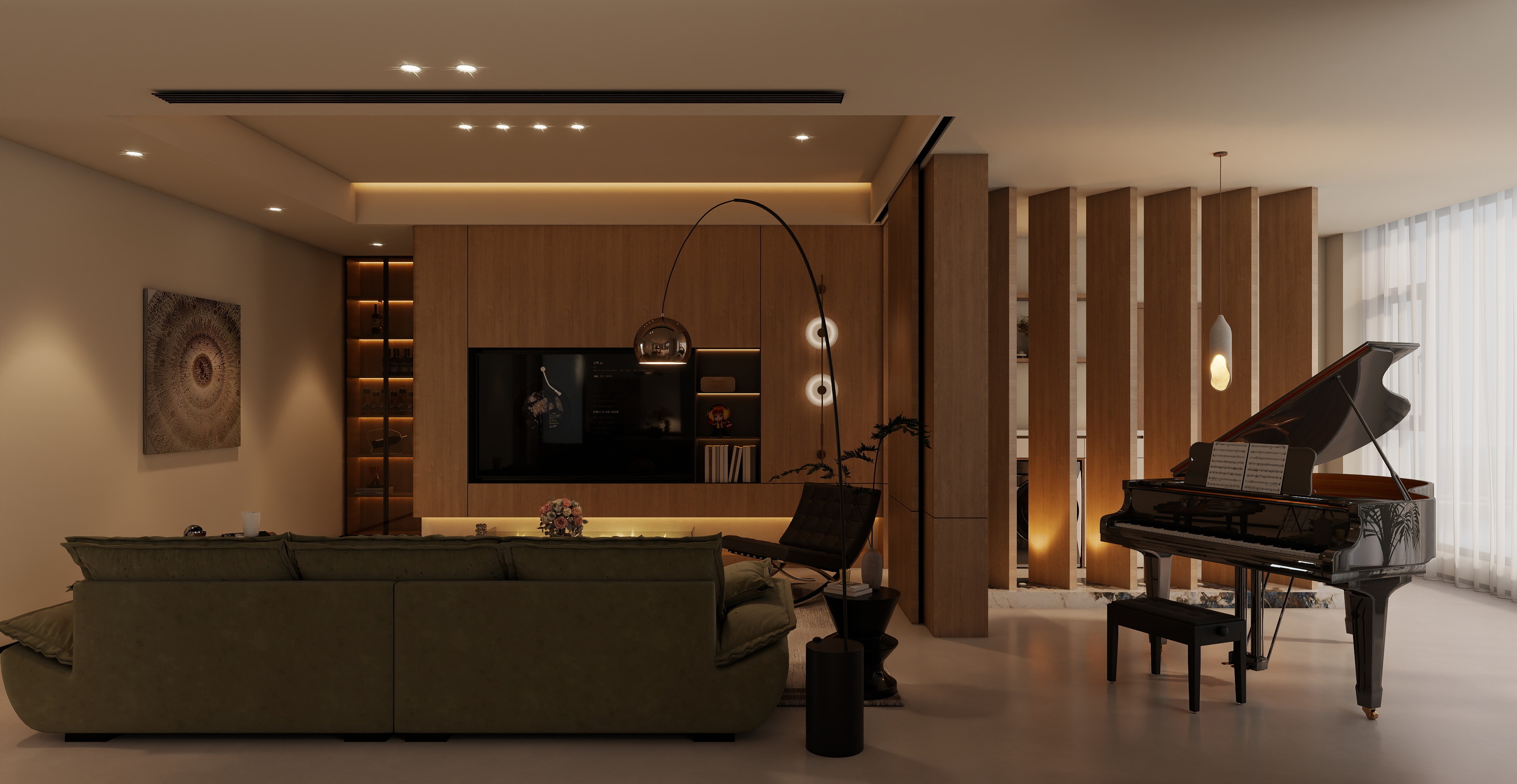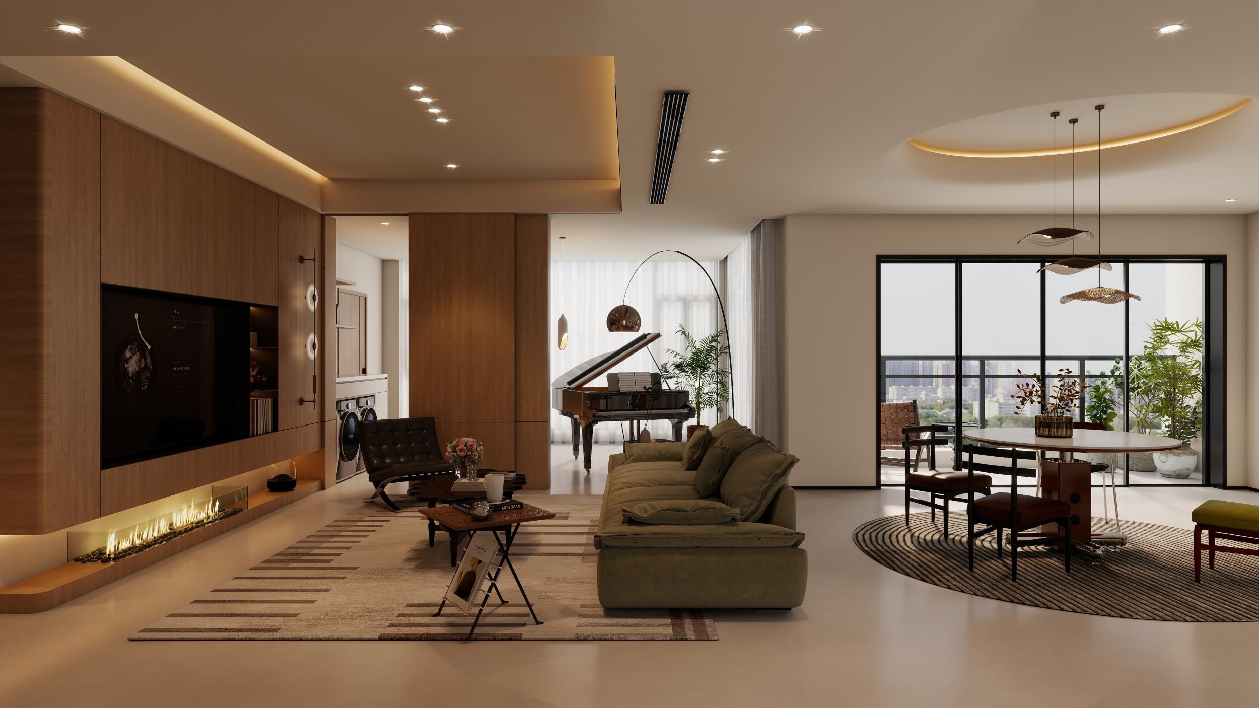 以木質(zhì)材料為主打造電視背景墻和隔斷,帶來自然溫暖的感覺。深綠色的沙發(fā)成為空間中的一抹亮色,與木質(zhì)的暖調(diào)形成對(duì)比又和諧統(tǒng)一?;⌒温涞?zé)舨粌H提供局部照明,還增添了空間的柔和感與藝術(shù)氛圍。巴塞羅那椅等單品的選擇,提升了空間的時(shí)尚感和舒適度。
