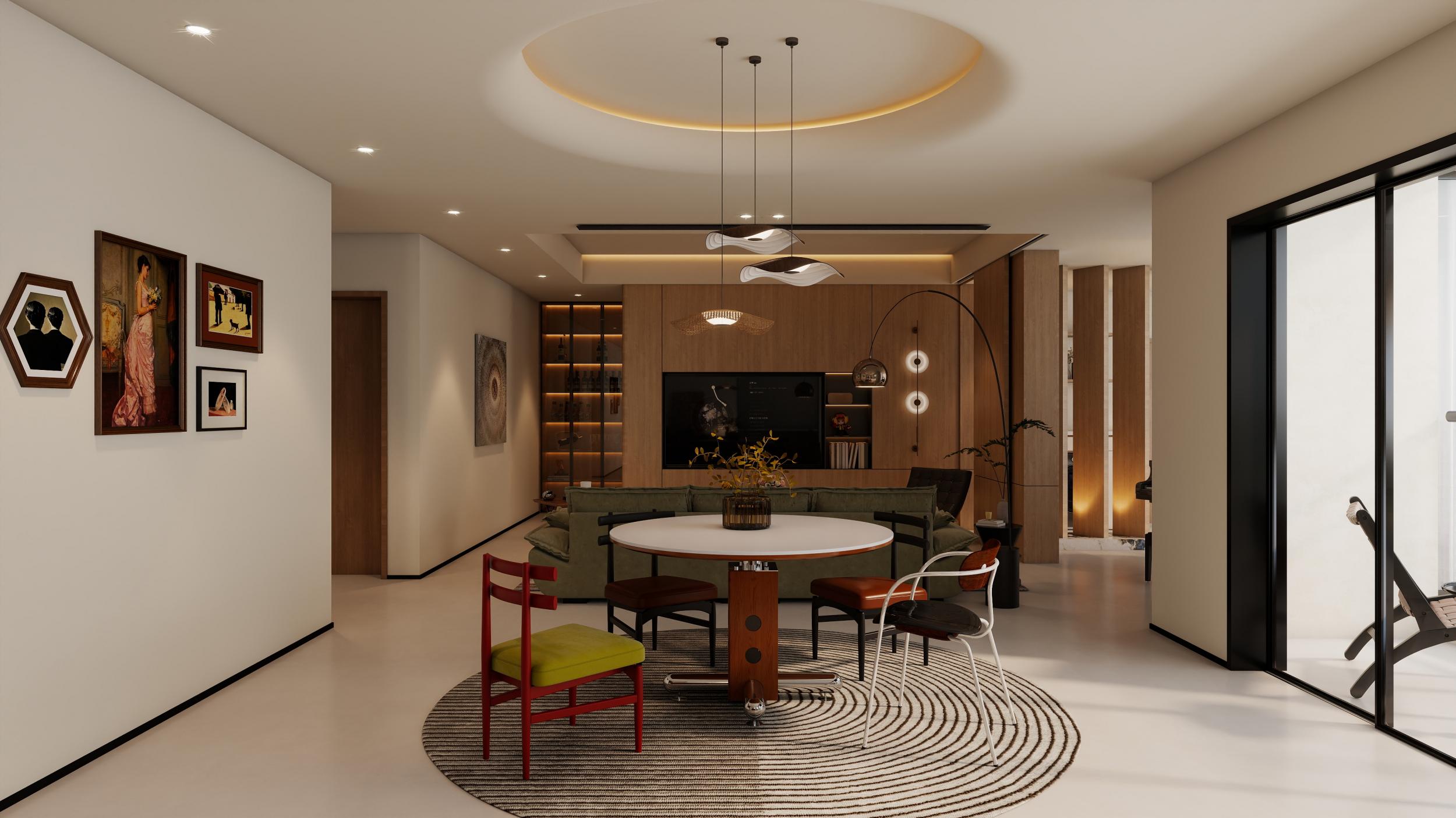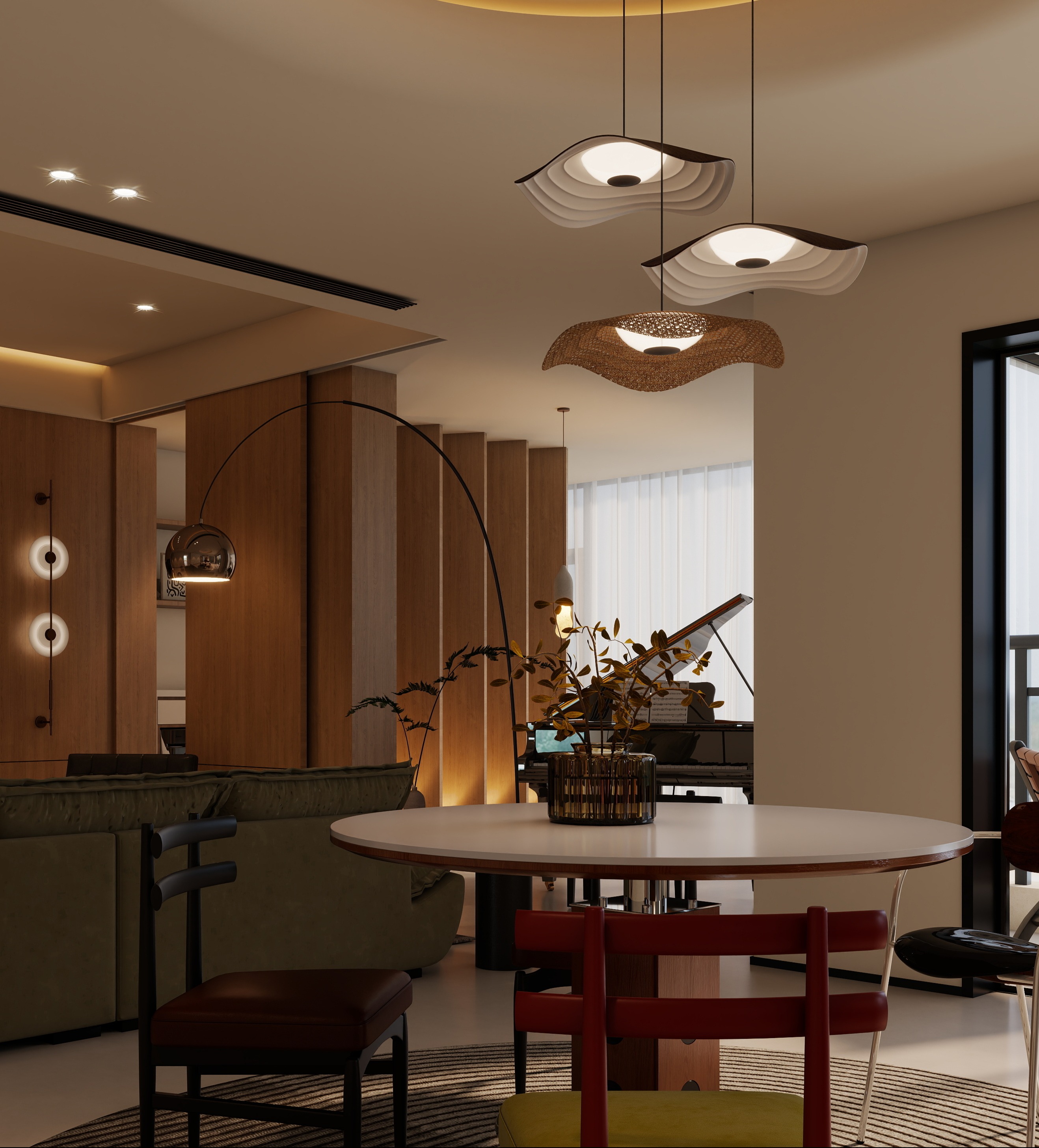 獨(dú)特的波浪形吊燈成為餐廳的視覺焦點(diǎn),造型別致,光線柔和,營(yíng)造出溫馨的用餐氛圍。圓形白色餐桌簡(jiǎn)潔大方,搭配紅色和黑色等不同色彩的椅子,增加了空間的活潑感。桌上擺放的植物裝飾,為空間帶來生機(jī)。