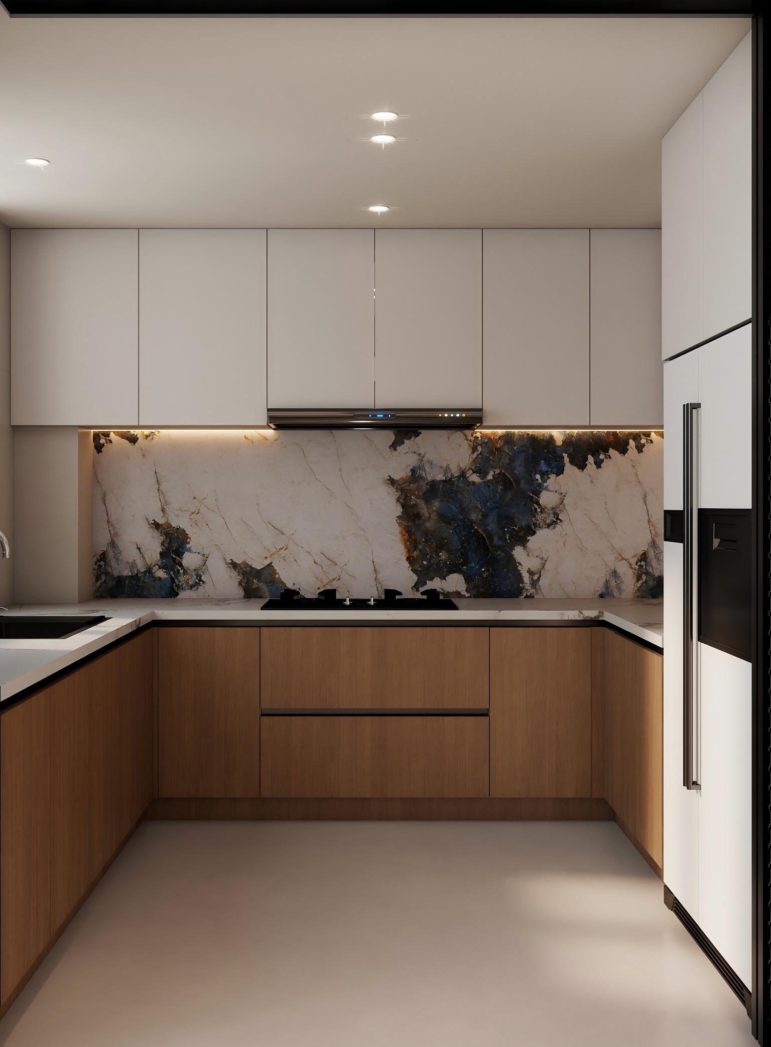 采用白色與木色的經(jīng)典搭配,簡(jiǎn)潔明亮。大理石紋理的背景墻提升了廚房的質(zhì)感和時(shí)尚感。整體布局緊湊合理,櫥柜提供了充足的儲(chǔ)物空間,滿足廚房收納需求。