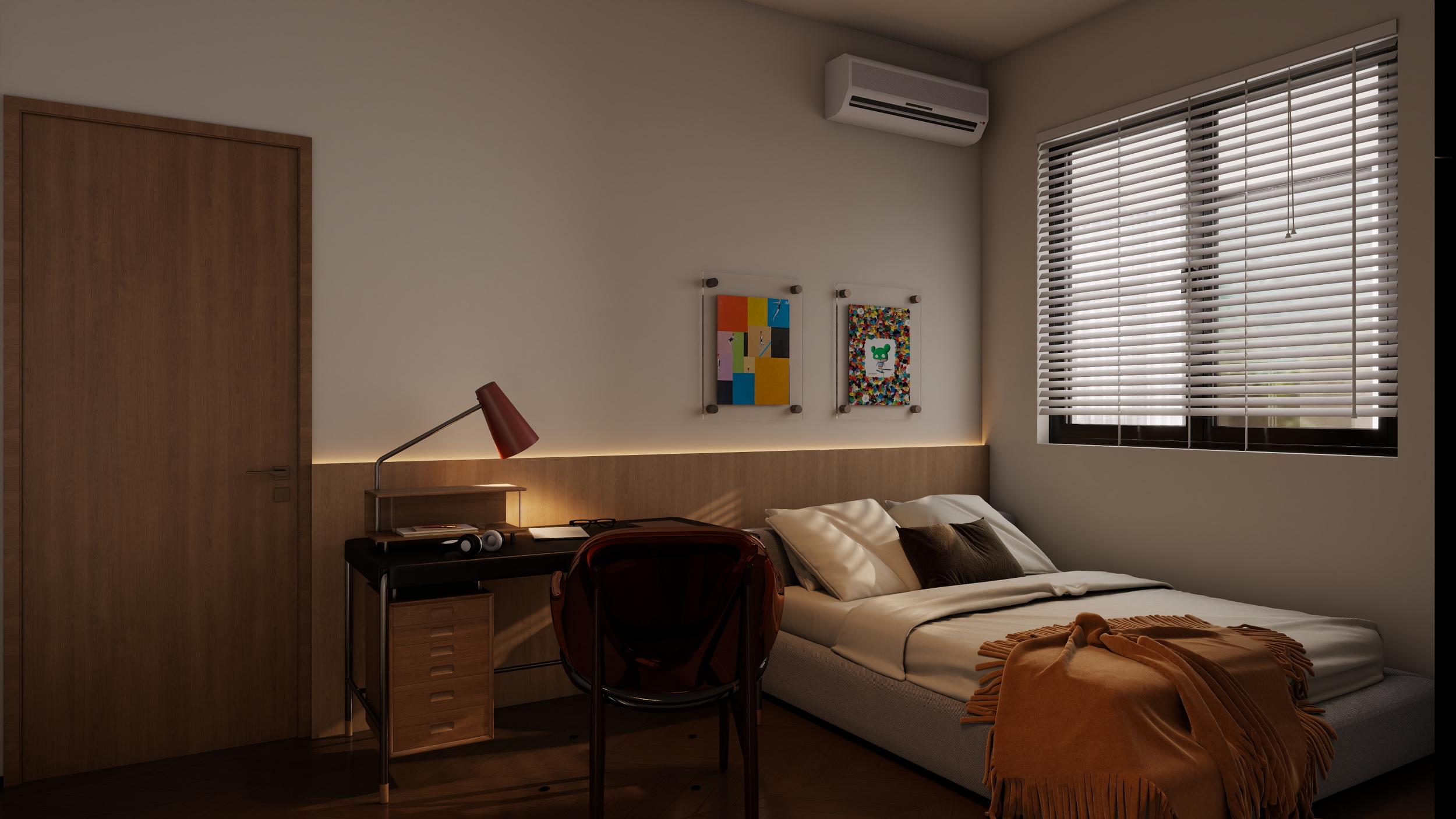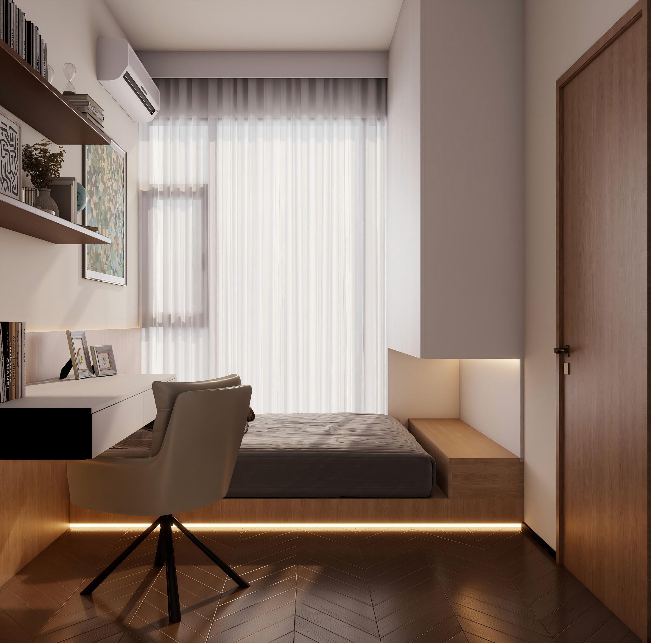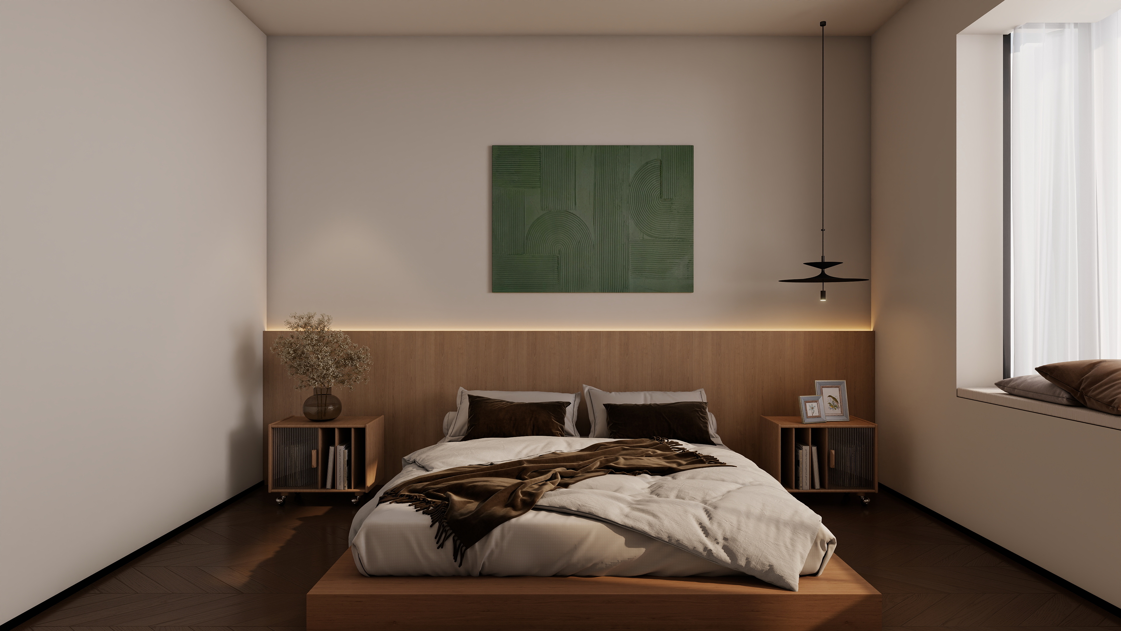 整體色調(diào)柔和,以米色、木色為主,營(yíng)造出寧靜、舒適的睡眠環(huán)境。床頭的藝術(shù)畫和吊燈,增添了空間的藝術(shù)感和溫馨感。部分臥室設(shè)計(jì)了書桌區(qū)域,滿足工作或?qū)W習(xí)的需求,同時(shí)利用墻面空間設(shè)置擱架,增加收納和展示功能。