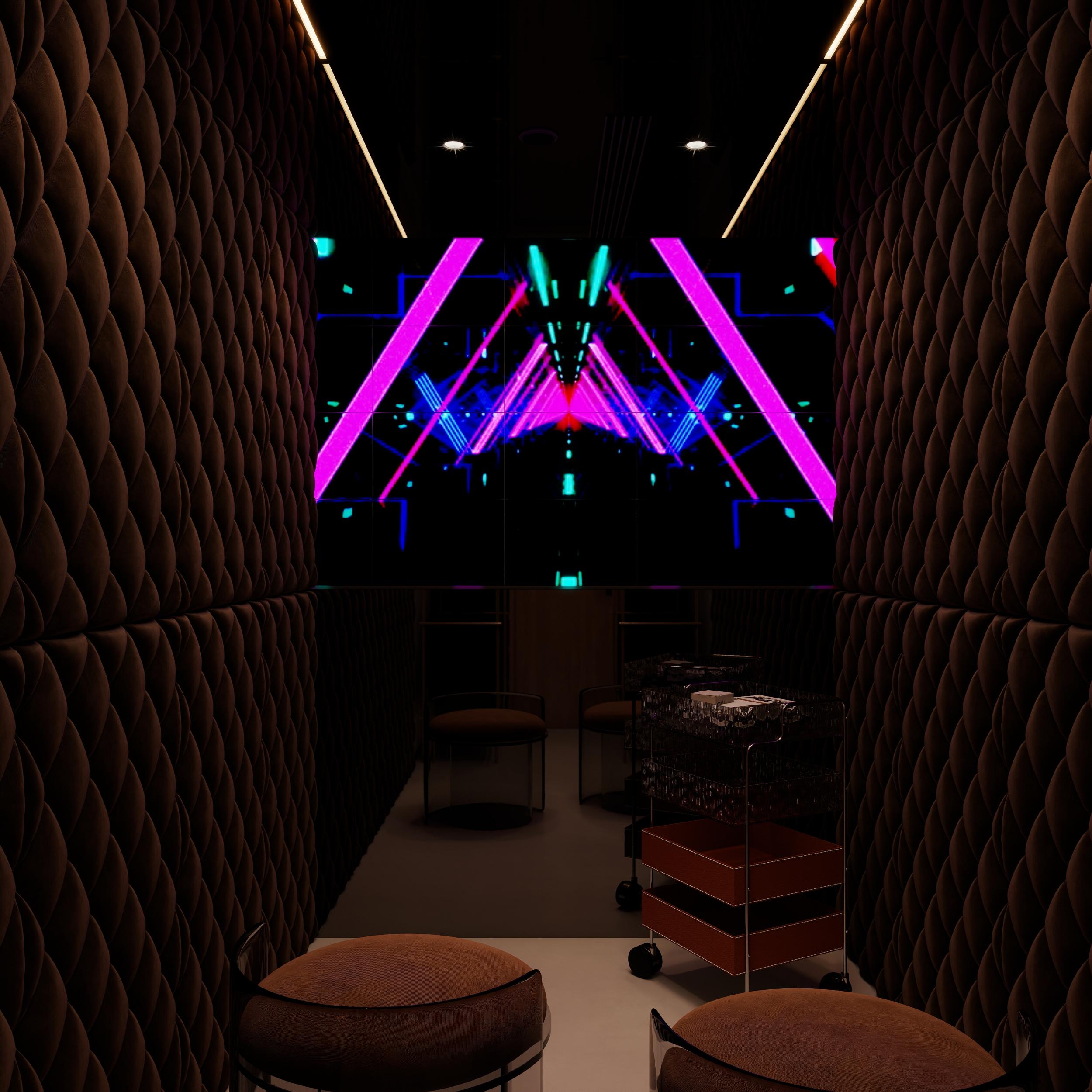 內(nèi)置隔音棉設(shè)成一個(gè)小型k歌區(qū)域,帶有霓虹燈裝飾的娛樂室,深色的墻面搭配絢麗的燈光,營(yíng)造出獨(dú)特的氛圍,可供休閑娛樂。