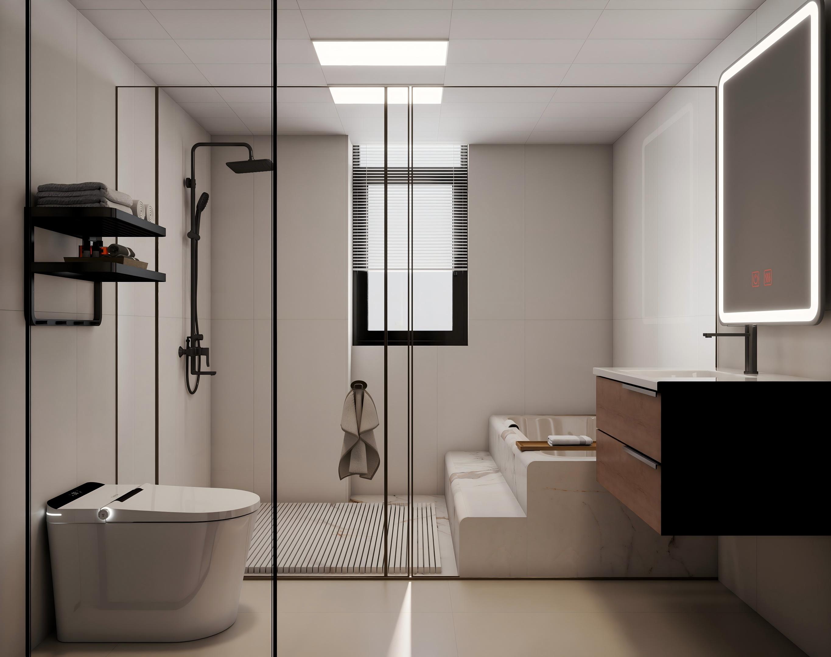采用玻璃隔斷實(shí)現(xiàn)干濕分離,保持空間的干燥和整潔。白色瓷磚搭配黑色五金件,簡(jiǎn)潔大方。智能馬桶、浴缸等設(shè)施提升了使用的舒適度和便利性。