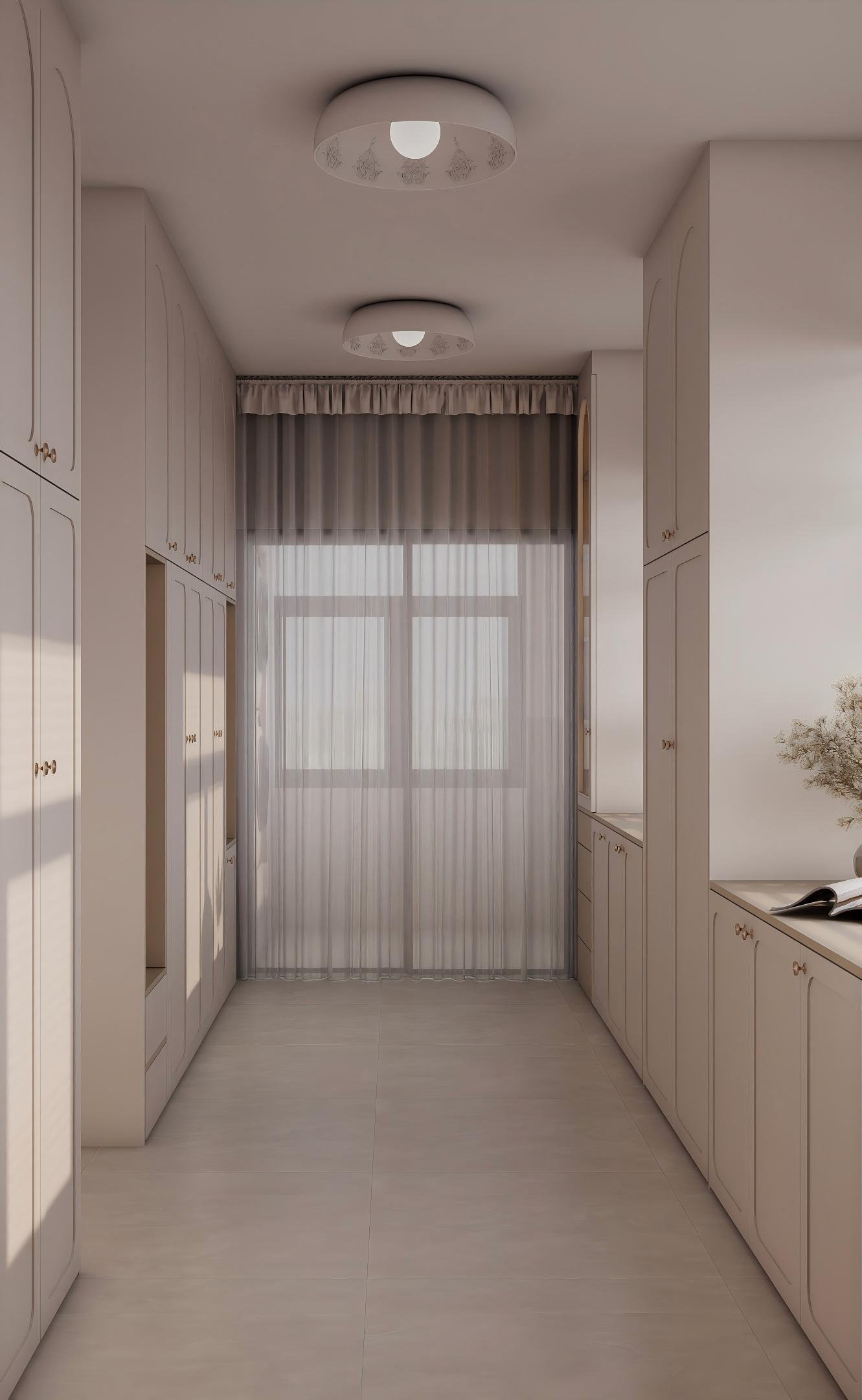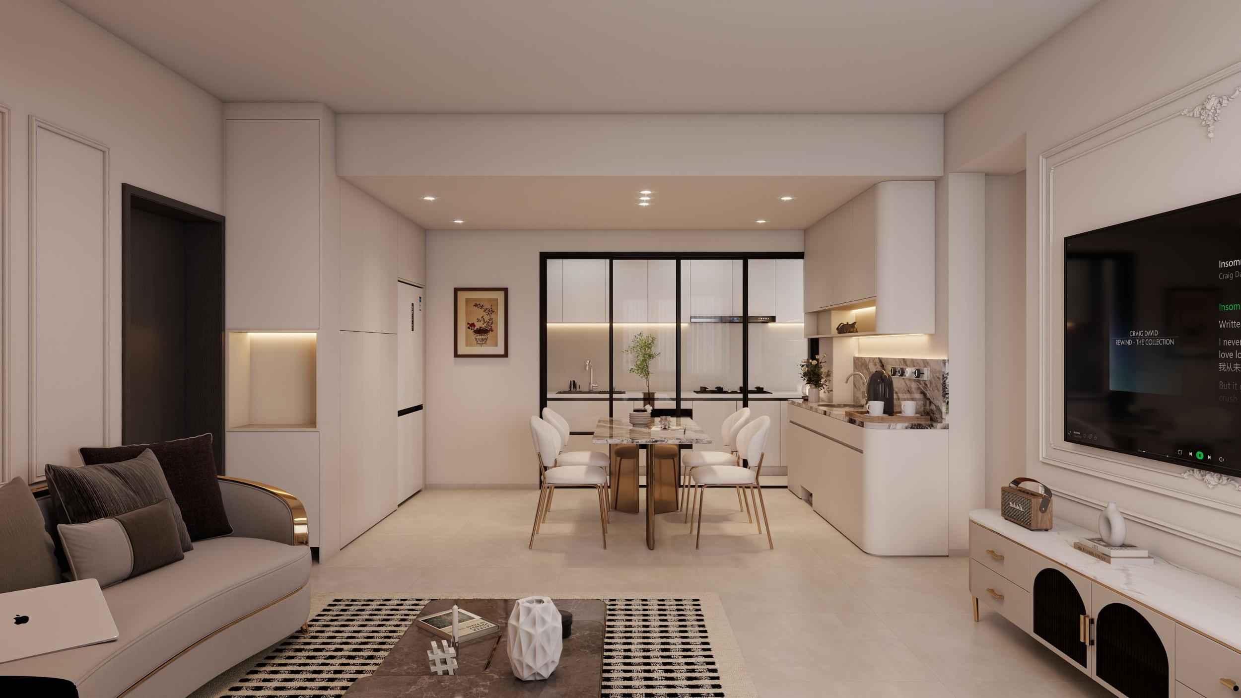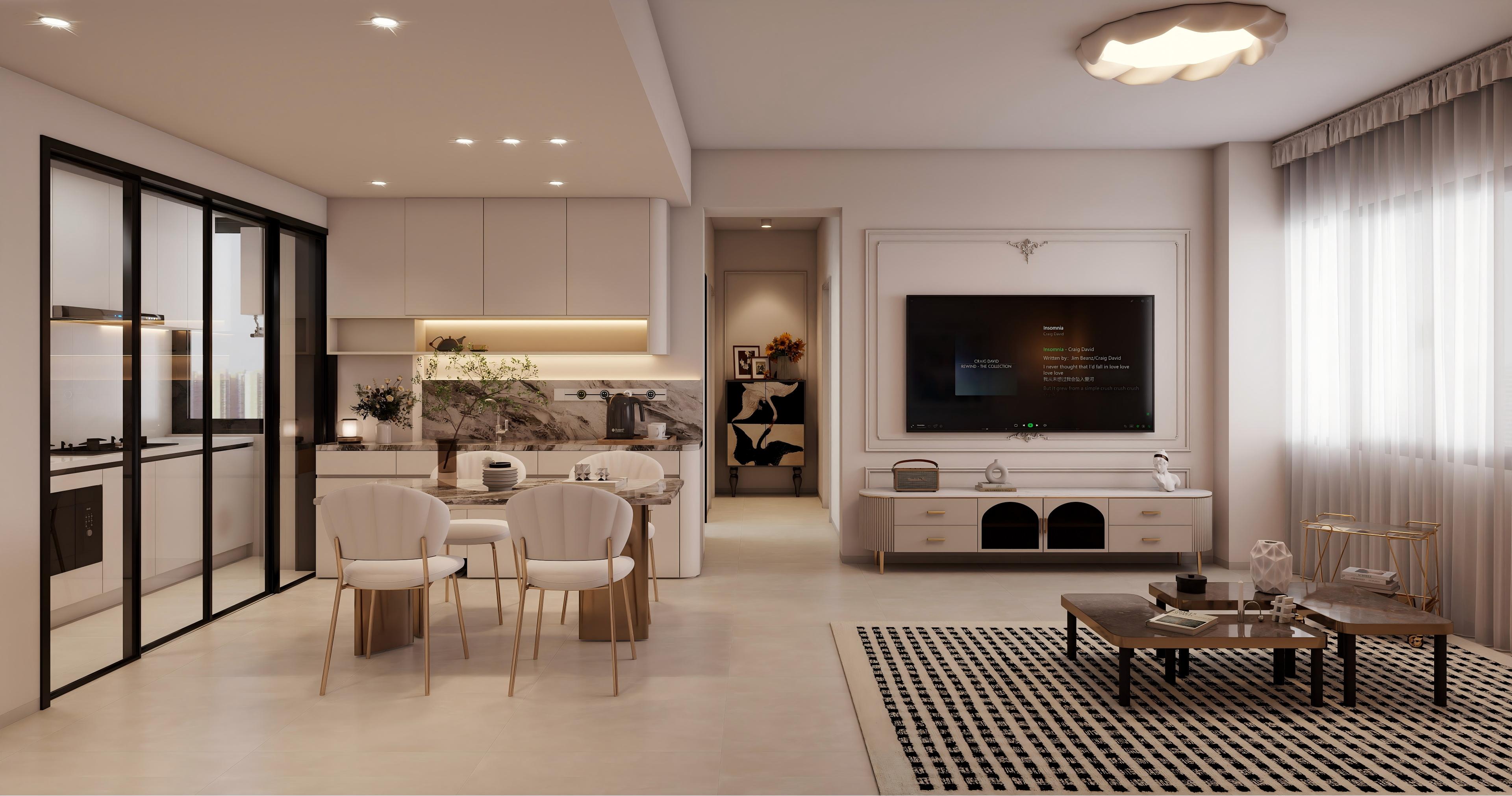 客廳布局開闊,電視背景墻采用精致的裝飾線條,搭配懸掛的平板電視,下方是帶有金色細(xì)節(jié)的白色電視柜,擺放著裝飾品,增添了空間的藝術(shù)感。沙發(fā)選擇淺灰色,搭配深棕色靠墊,形成色彩對(duì)比。黑白格紋地毯與金色框架的茶幾相得益彰,沙發(fā)旁的金屬邊幾和臺(tái)燈進(jìn)一步提升了輕奢質(zhì)感。大窗戶引入充足自然光,使空間明亮通透。