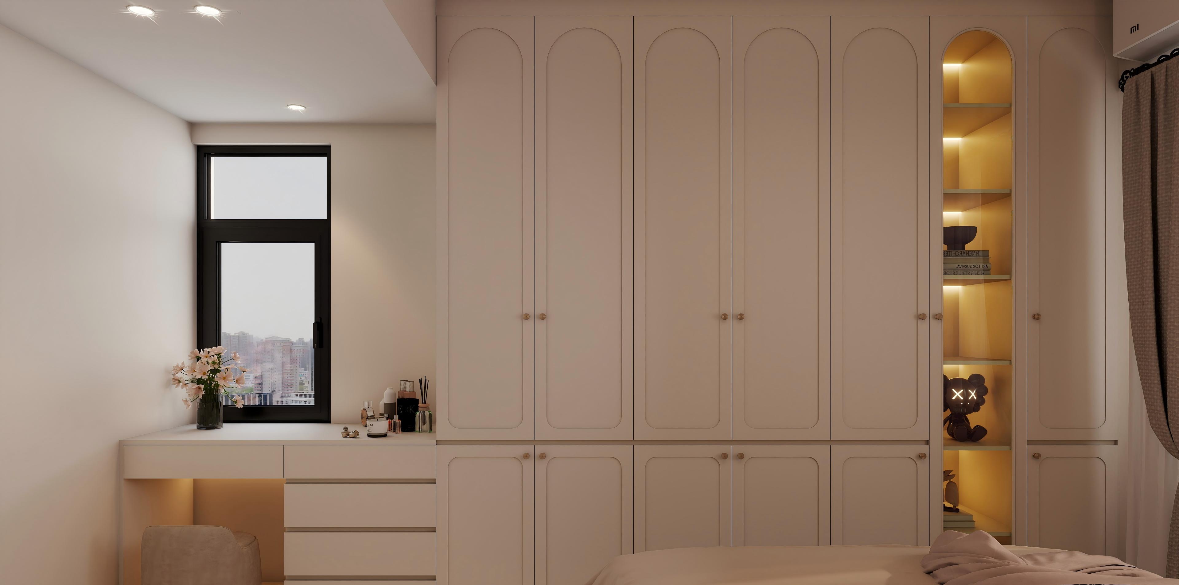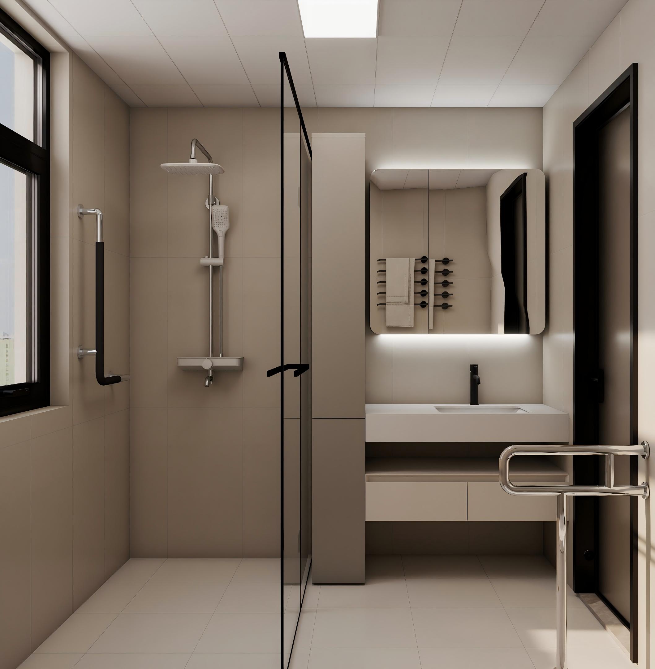 衛(wèi)生間采用干濕分離設(shè)計(jì),玻璃淋浴房保證了干區(qū)的干燥。淺色瓷磚鋪設(shè)墻面和地面,使空間顯得干凈整潔。懸掛式洗手臺(tái)下方留出空間,便于清潔。鏡柜帶有燈光,增加了實(shí)用性。淋浴區(qū)安裝了扶手,體現(xiàn)了對(duì)安全性的考慮。