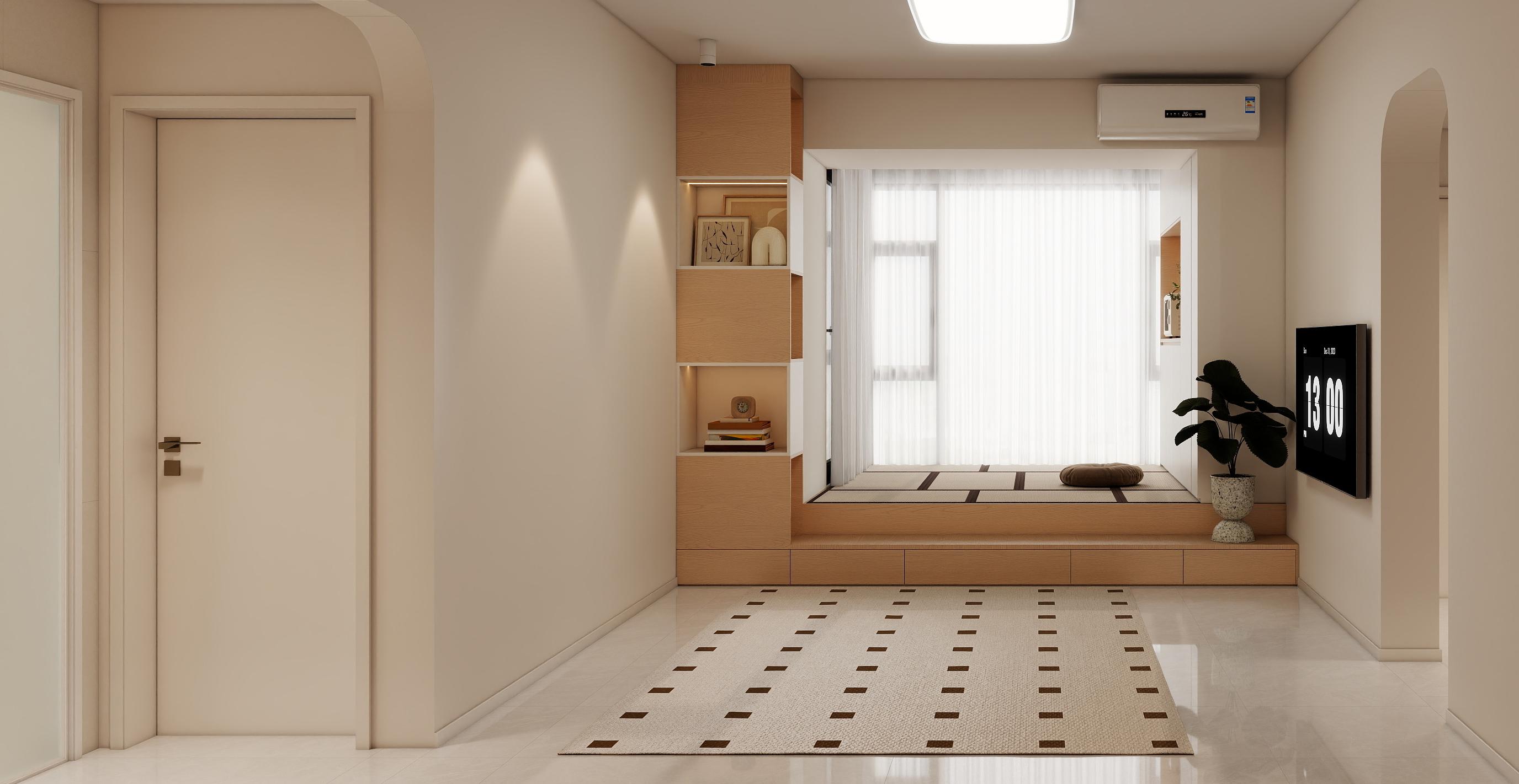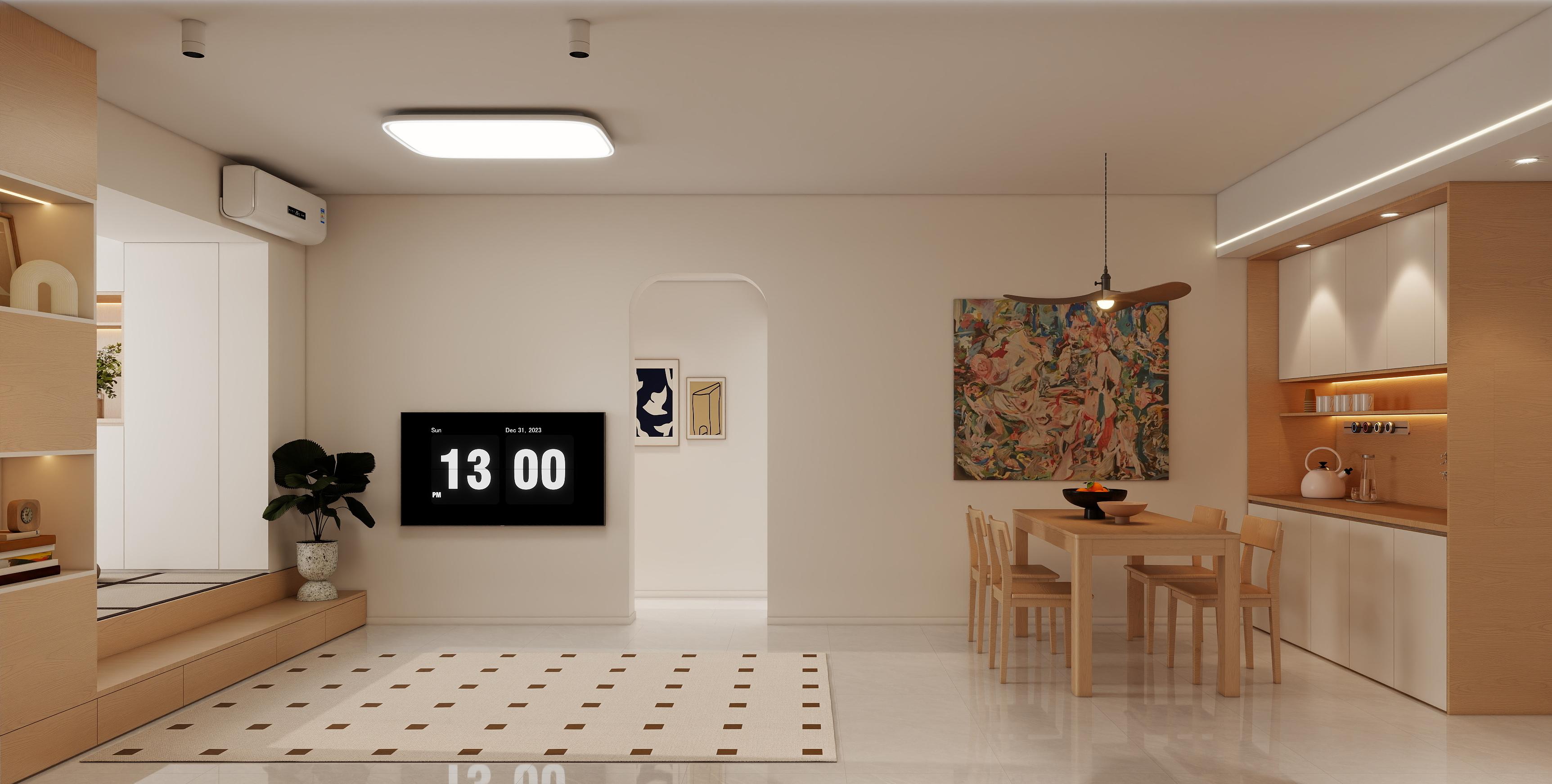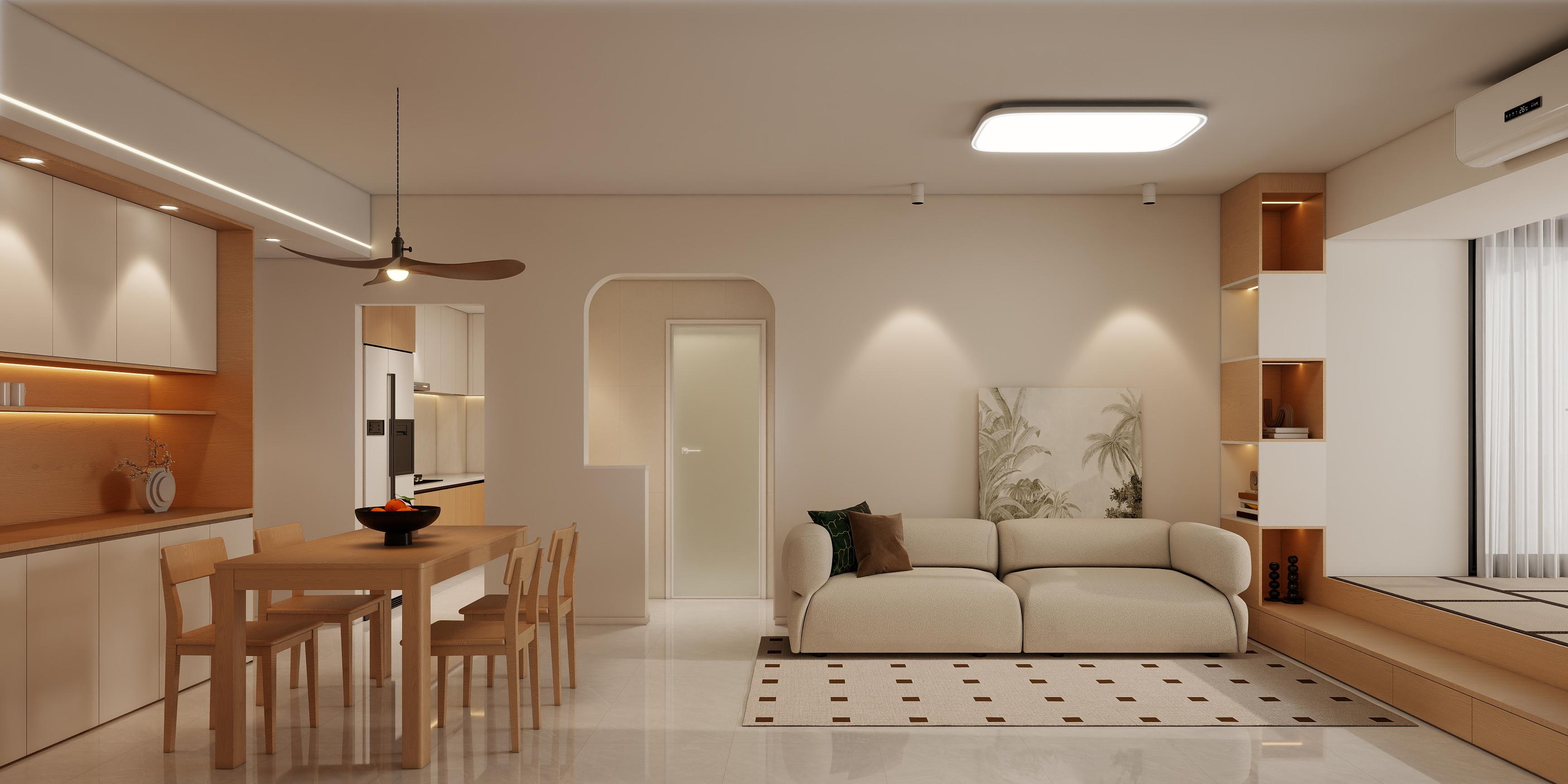 客廳:采用LDK一體化設(shè)計,客廳、餐廳、廚房聯(lián)動,打破空間隔閡,增強采光與互動性。淺色瓷磚通鋪地面,反射光線使空間更顯寬敞。米色布藝沙發(fā)搭配木質(zhì)茶幾,柔和的曲線與自然材質(zhì)營造溫暖氛圍;吊扇燈兼具實用性與復(fù)古情調(diào)。無主燈布局,提供均勻照明,重點區(qū)域如書架、裝飾畫,通過局部燈光突出層次感。電視墻整合開放式書架與封閉儲物柜,兼顧展示與收納需求;裝飾畫與綠植點綴空間,增添生活氣息。