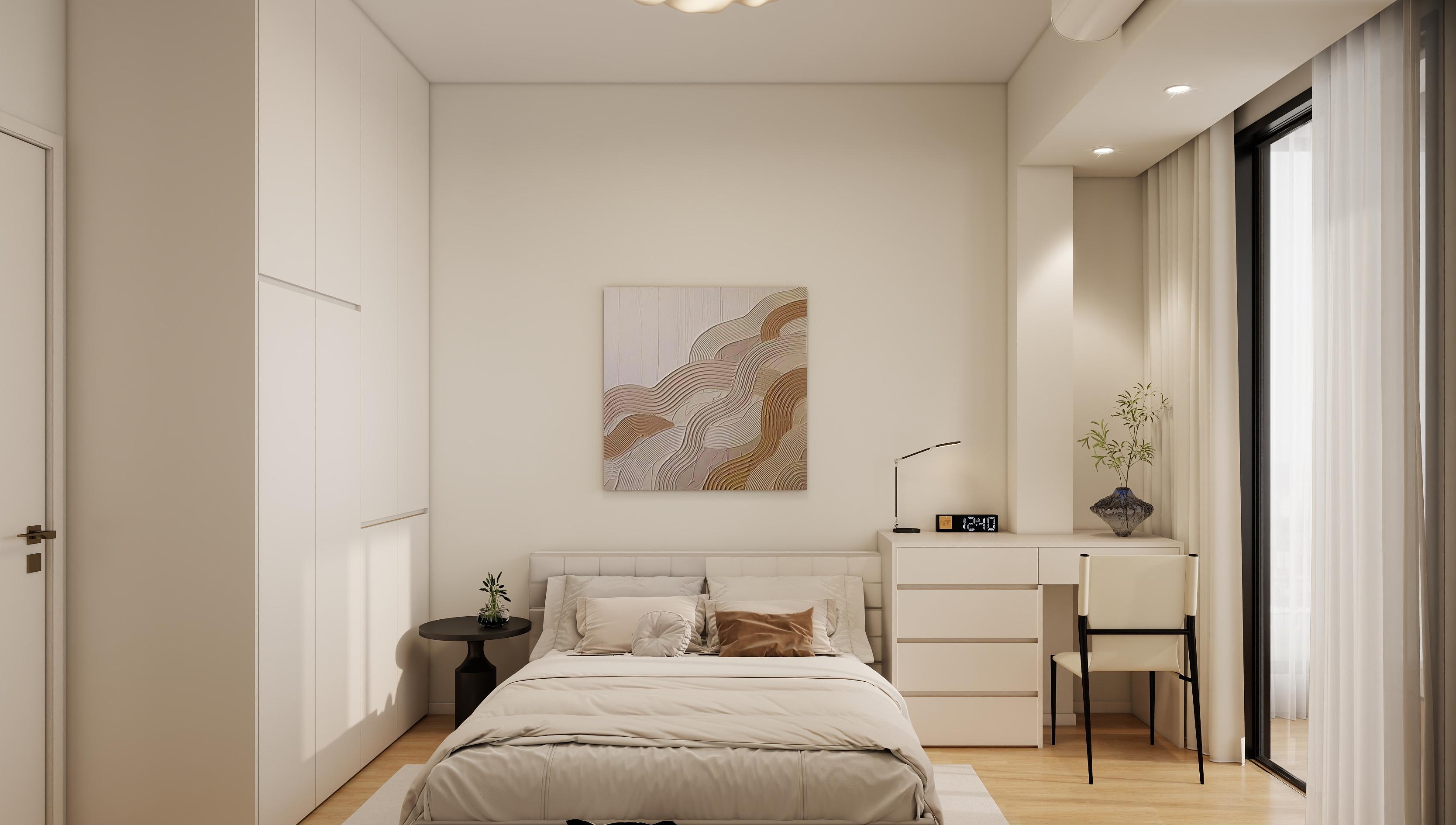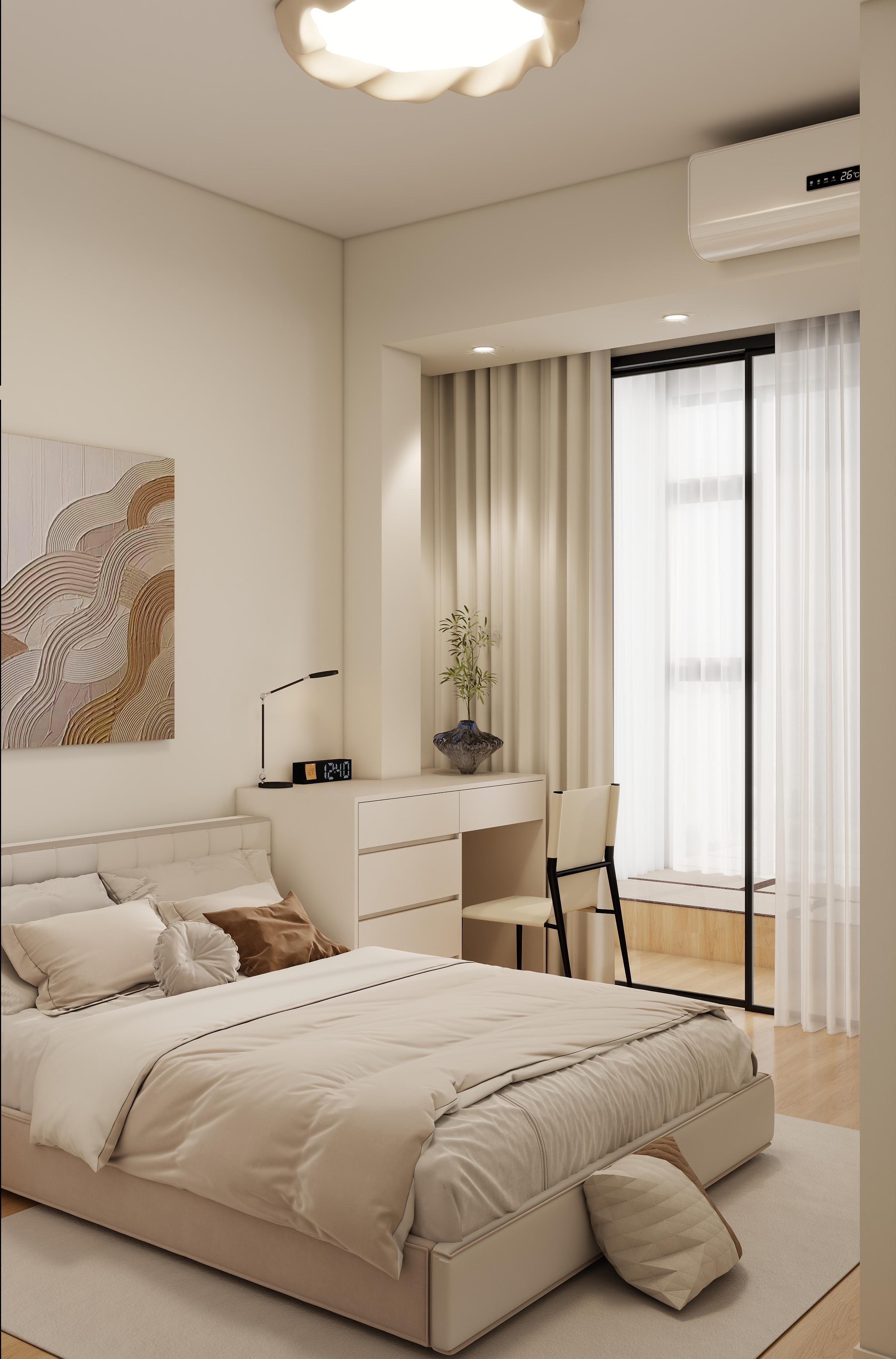 臥室:米白、淺木色為主,搭配啞光質(zhì)感的床品與家具,營造寧靜氛圍。床頭抽象裝飾畫與簡約吊燈提升藝術(shù)感。定制通頂衣柜滿足衣物收納,床頭一側(cè)設(shè)置梳妝臺/書桌,結(jié)合飄窗區(qū)域優(yōu)化空間利用率。淺色紗簾過濾強光,保證隱私的同時保持通透感。