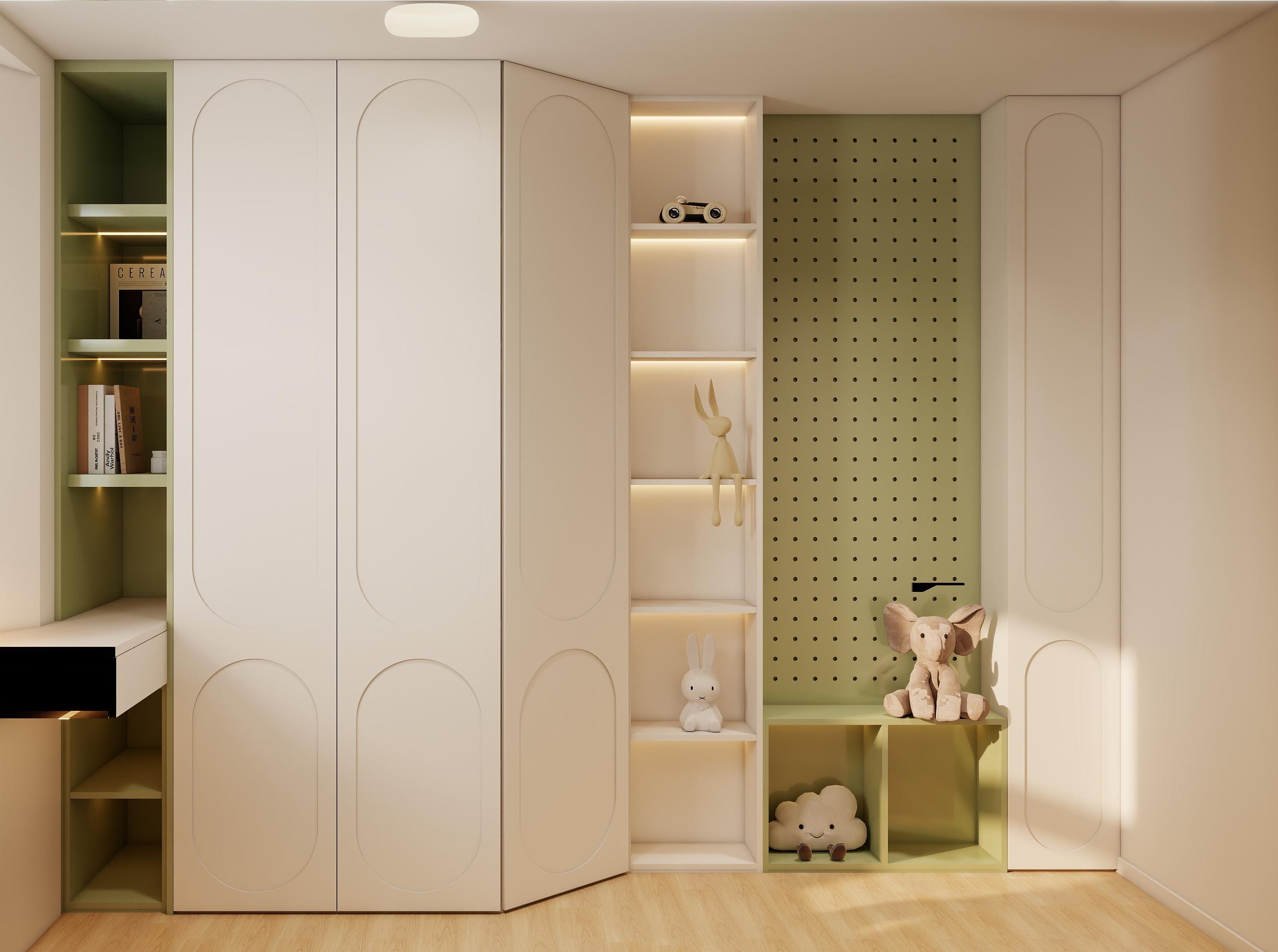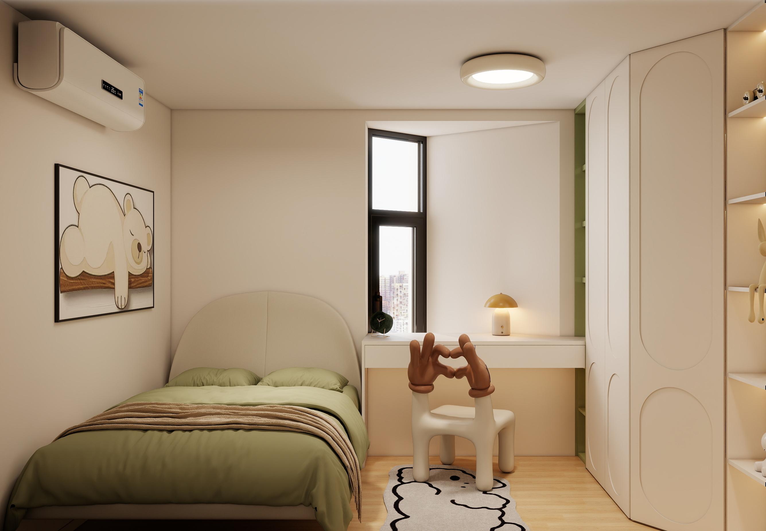 兒童房:以柔和的米綠基調(diào)為主,搭配卡通元素,打造童趣氛圍。定制書桌靠窗布置,充分利用自然光線;趣味造型家具,激發(fā)孩子想象力。衣柜內(nèi)部設(shè)計開放式擱架與洞洞板,方便收納玩具與書籍,適應(yīng)成長需求。