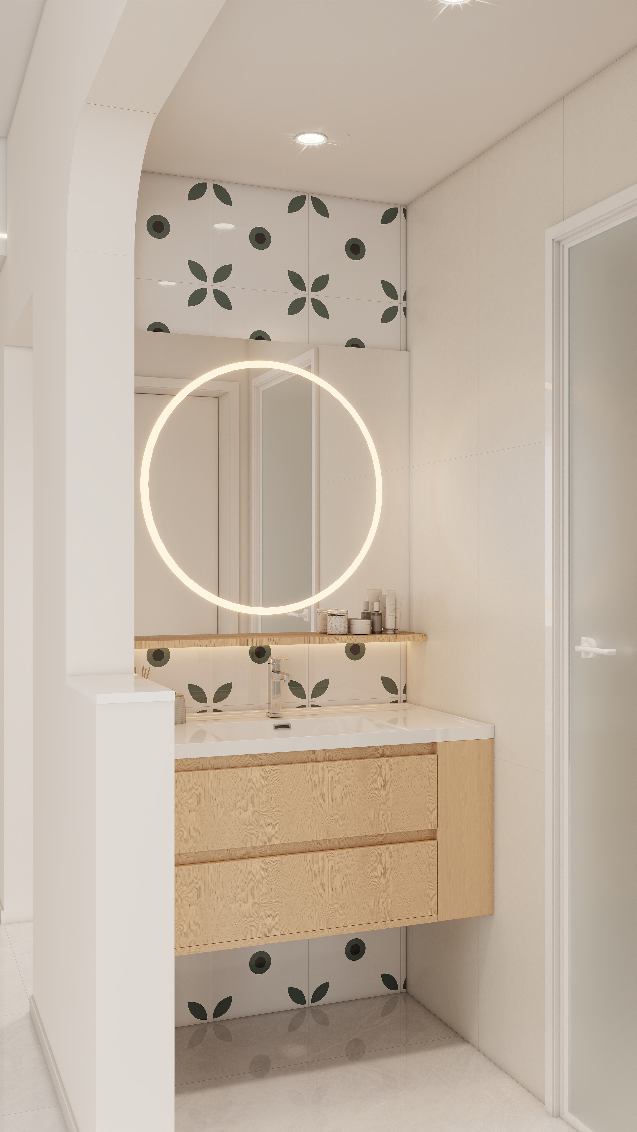 獨立干區(qū)設(shè)計,將洗手臺外置,實現(xiàn)干濕分離,提升使用效率。圓形發(fā)光鏡面與淺色木質(zhì)柜體結(jié)合,現(xiàn)代感十足。局部采用綠色花紋瓷磚點綴,打破純白單調(diào),增添視覺趣味。鏡柜與懸空浴室柜提供充足儲物空間,便于清潔;臺面擺放少量裝飾品,平衡實用與美觀。鏡前燈環(huán)提供均勻面部照明,筒燈補充環(huán)境光,營造明亮舒適的洗漱環(huán)境。