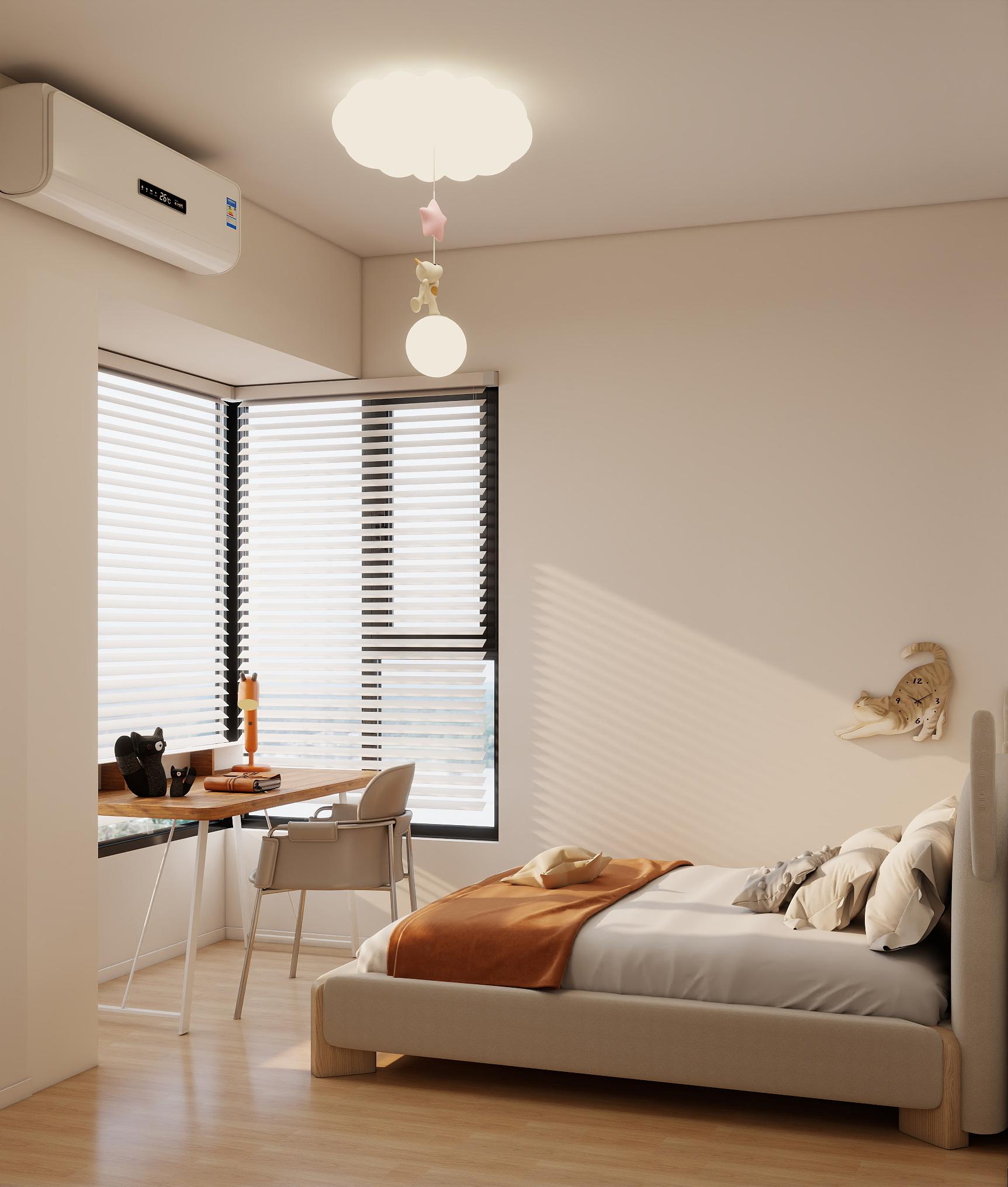 兒童房:床、書桌與裝飾元素緊湊排列,小戶型最大化利用有限空間。墻面裝飾與吊燈利用垂直空間,避免地面擁擠,保持通透感,天花板懸掛云朵造型燈具,搭配星星、動物掛飾,營造童趣氛圍。